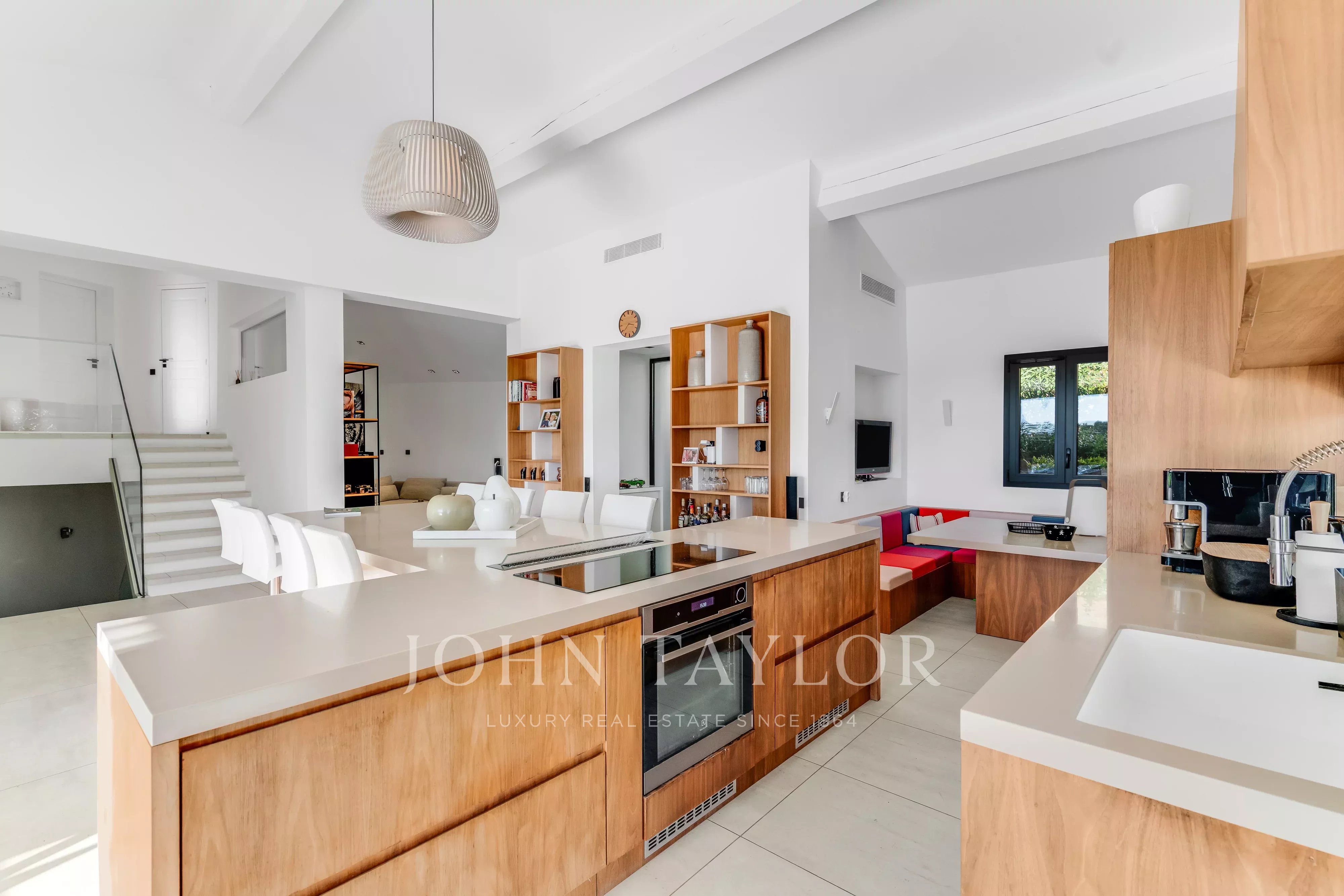 Implantée sur un terrain plat et paysager de 1 166 m², la villa, réalisée au début des années 2000 par un architecte de renom, développe plus de 170 m² de surface habitable répartis sur trois niveaux. Elle offre de vastes terrasses ensoleillées, une piscine, plusieurs emplacements de stationnement ainsi qu’un garage.