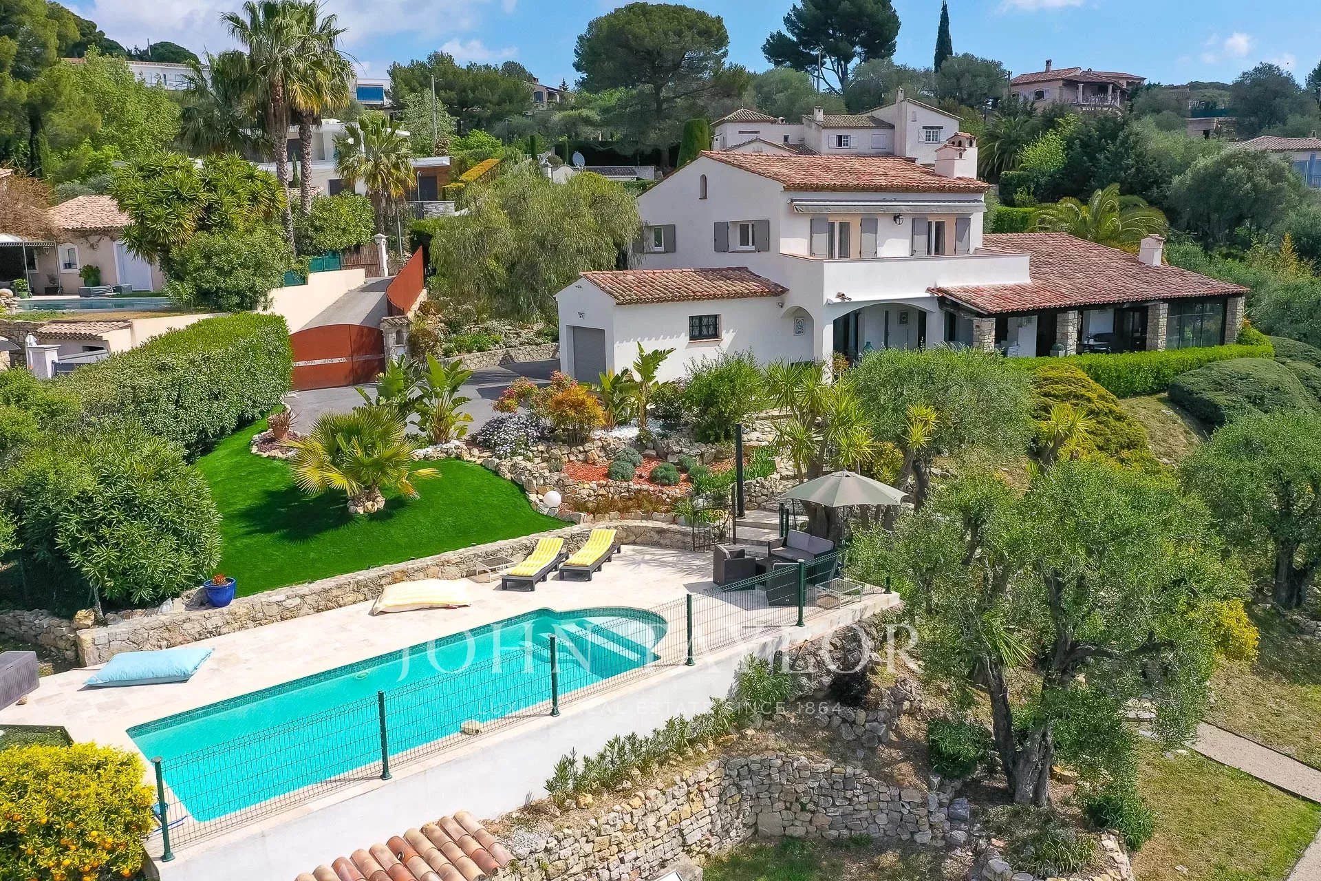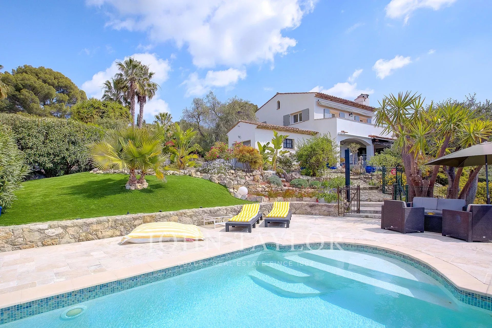Dans un quartier résidentiel de Mougins et proche du Cannet, cette villa vue mer, entièrement rénovée d'environ 200 m² est sise sur un terrain paysagé de 2237 m² avec piscine.