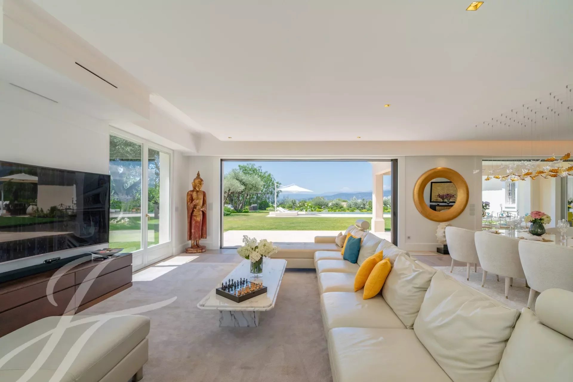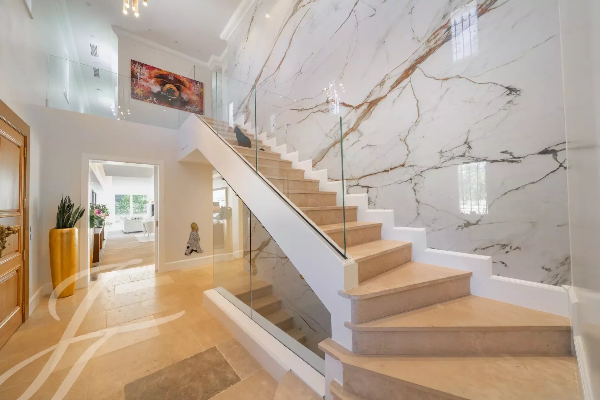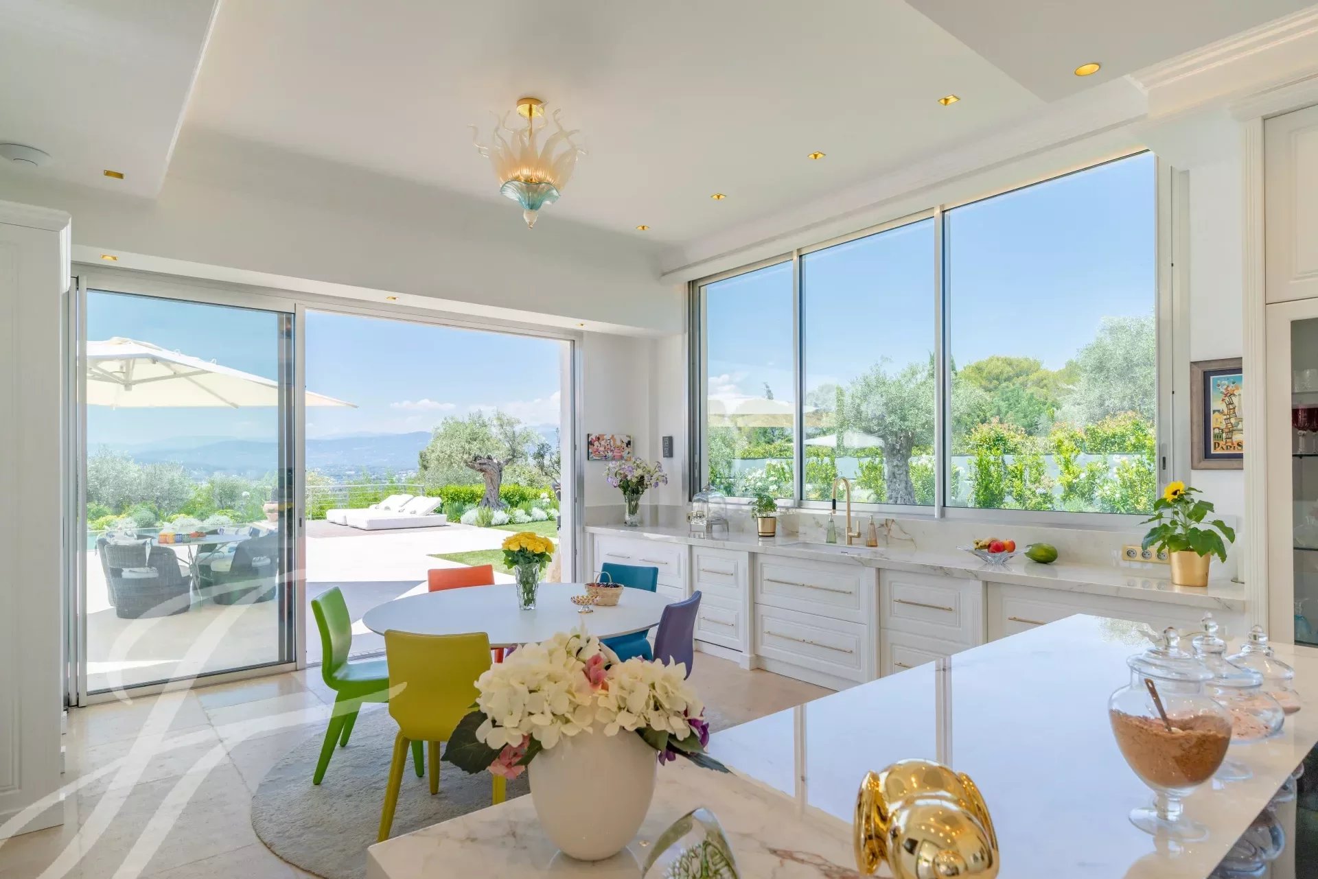L'entrée principale est dotée de doubles portes en chêne massif qui s'ouvrent sur un magnifique hall d'entrée à double hauteur, mis en valeur par un mur en marbre Calacatta de 6 mètres de haut. Le vaste salon/salle à manger de 110m2 offrent une vue panoramique à 270 degrés, sur les collines et les montagnes des Alpes maritimes.