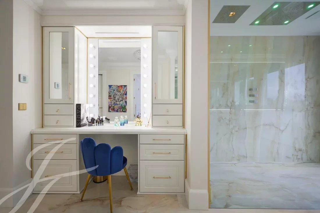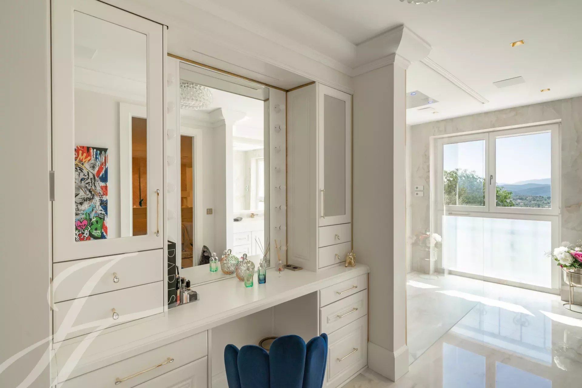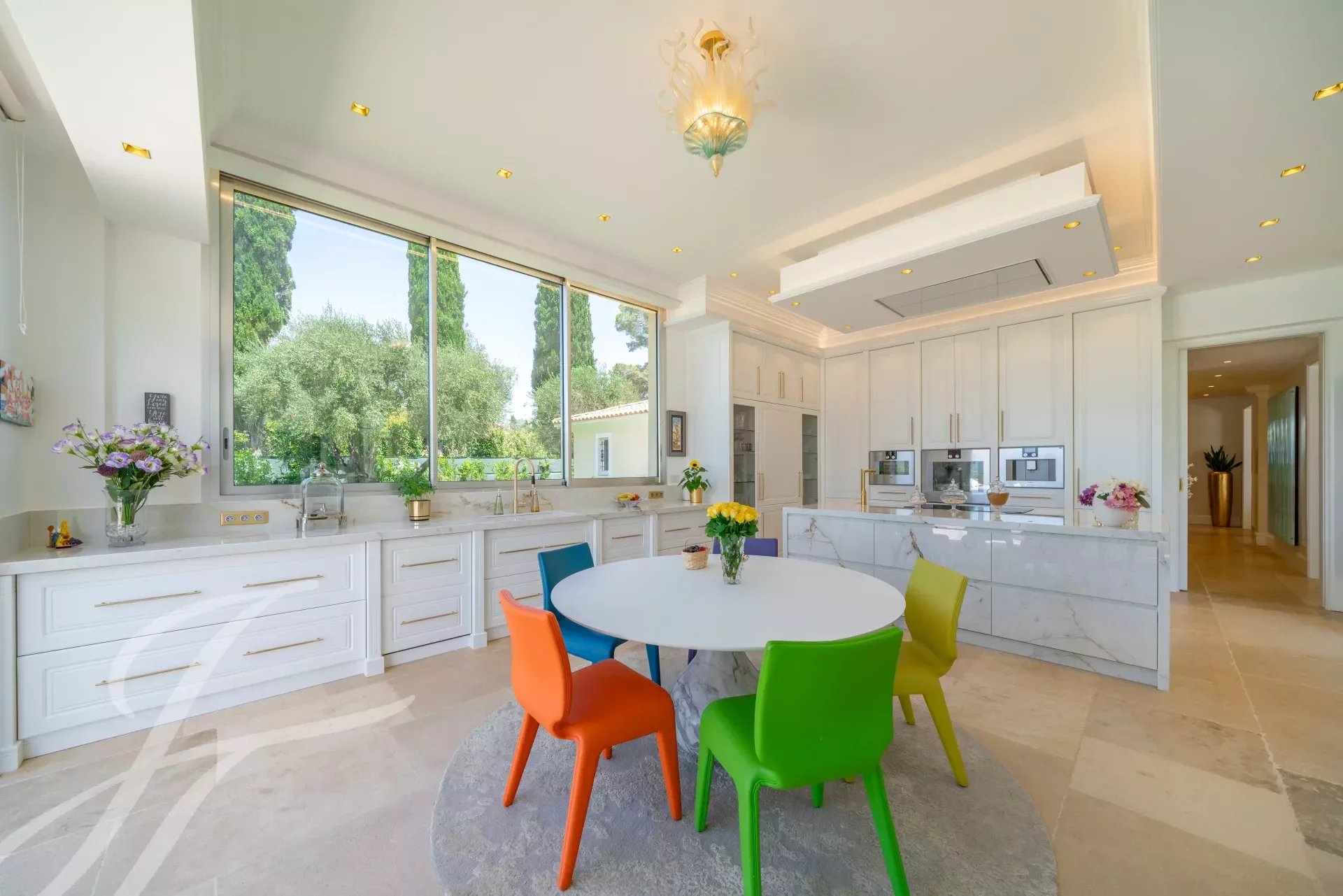 L'entrée principale est dotée de doubles portes en chêne massif qui s'ouvrent sur un magnifique hall d'entrée à double hauteur, mis en valeur par un mur en marbre Calacatta de 6 mètres de haut. Le vaste salon/salle à manger de 110m2 offrent une vue panoramique à 270 degrés, sur les collines et les montagnes des Alpes maritimes.