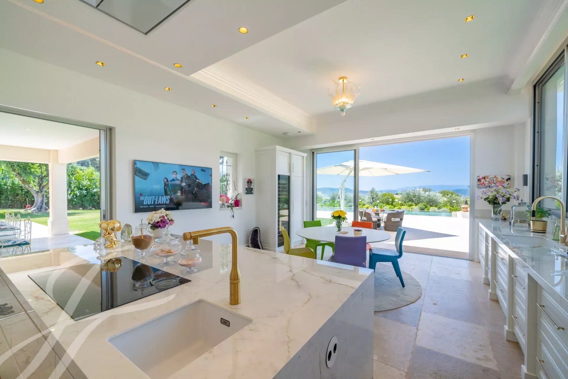 La cuisine, d'une qualité et d'un équipement exceptionnel, donne l'impression d'être liée au jardin grâce à ses immenses fenêtres et portes coulissantes.