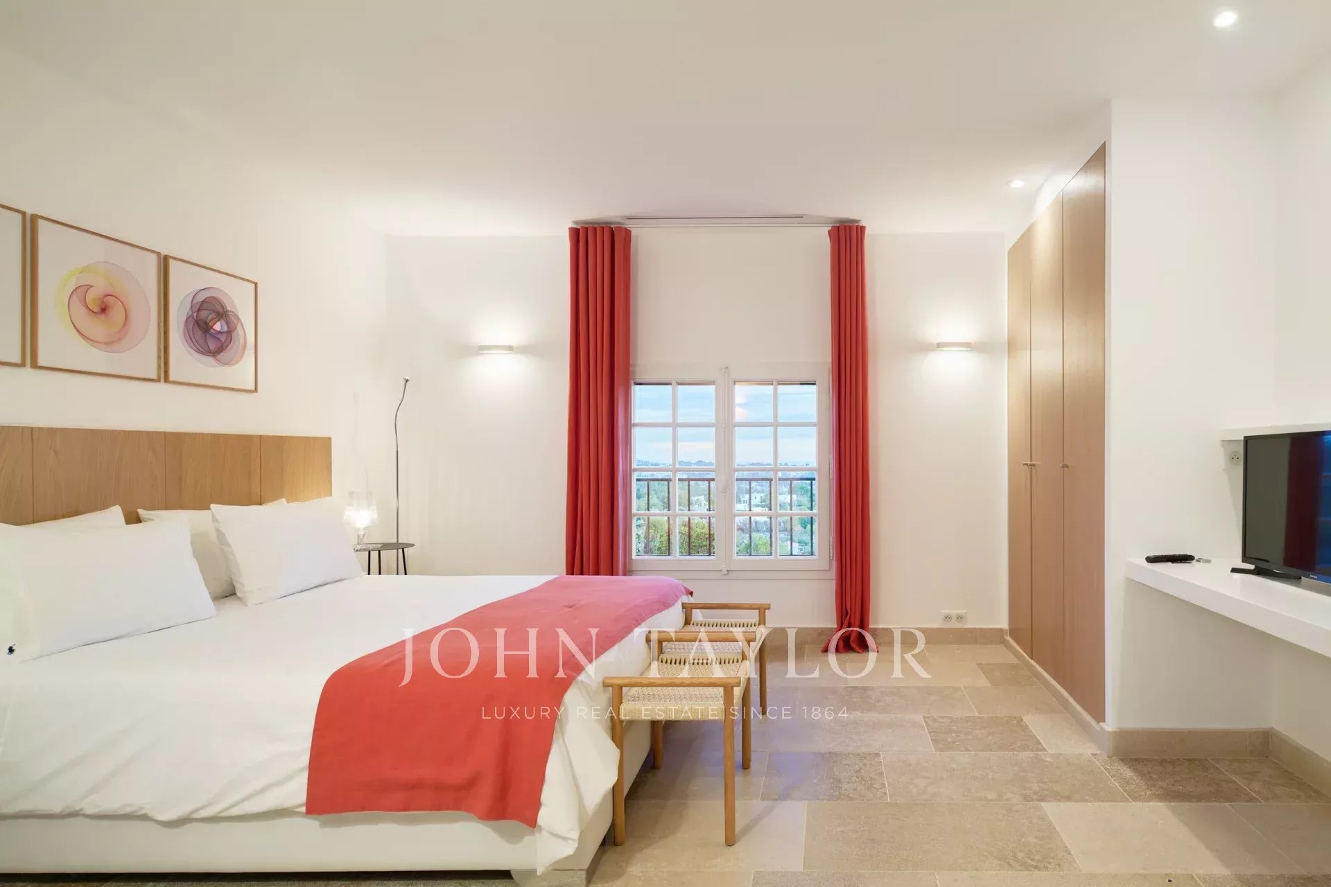 Les jardins luxuriants qui entourent la propriété ajoutent une dimension magique. Des oliviers centenaires, des parterres de fleurs, une roseraie, un verger et une piscine chauffée créent un cadre idyllique pour des moments de détente et de divertissement sous le soleil de la Côte d'Azur. La vue panoramique sur les collines verdoyantes de Mougins, la mer et l’Esterel complètent cette expérience exceptionnelle.