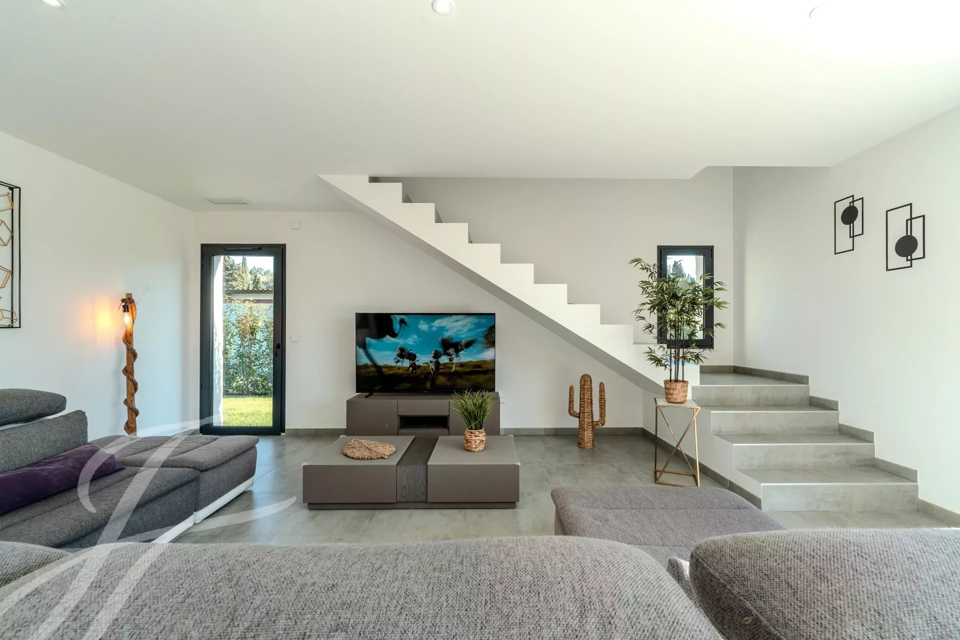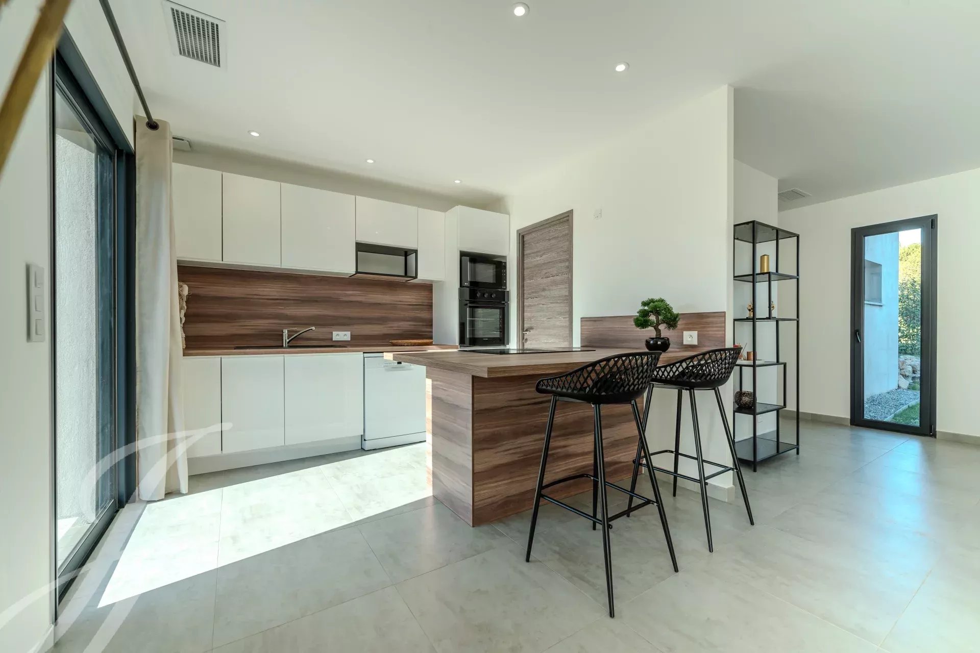 Édifiée sur un terrain plat de 1.033 m², elle propose un cadre de vie agréable et fonctionnel, agrémenté d’une piscine, de vastes terrasses ensoleillées et d'un garage.