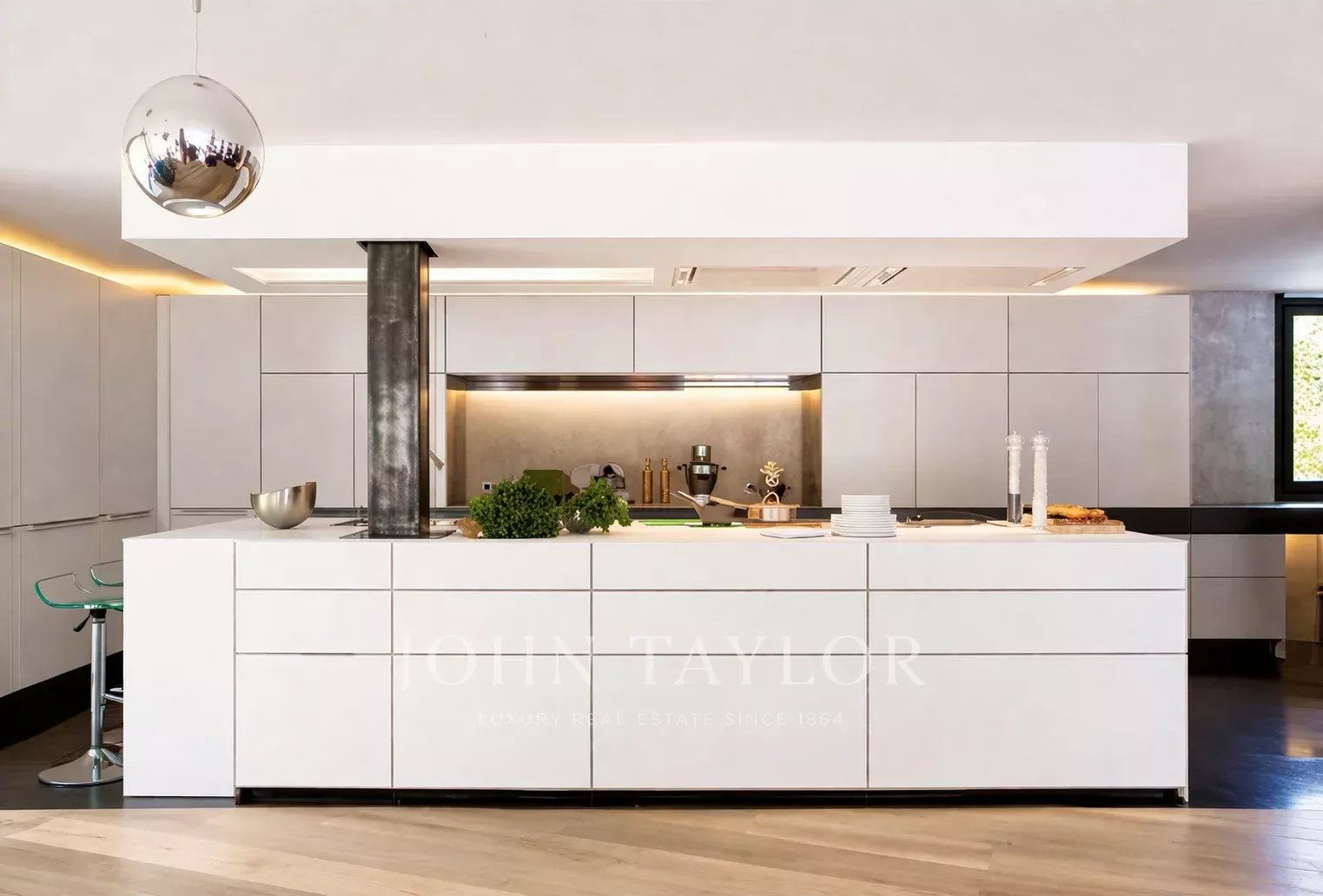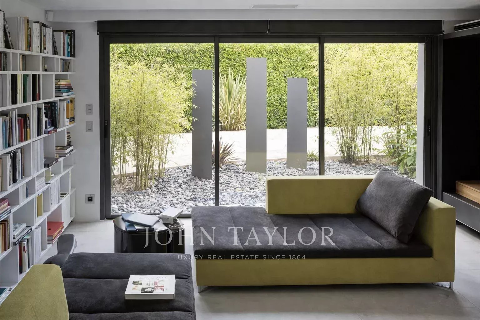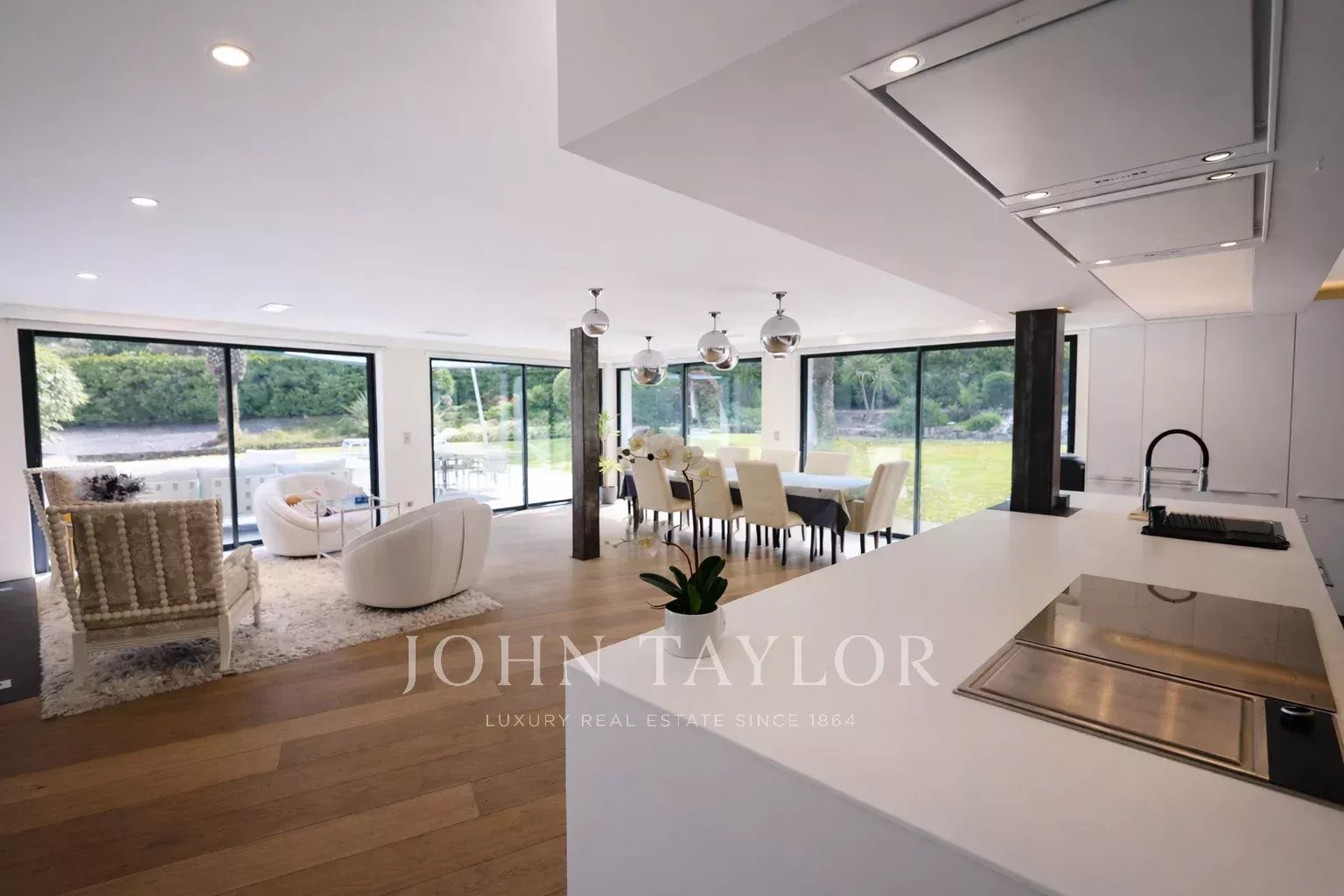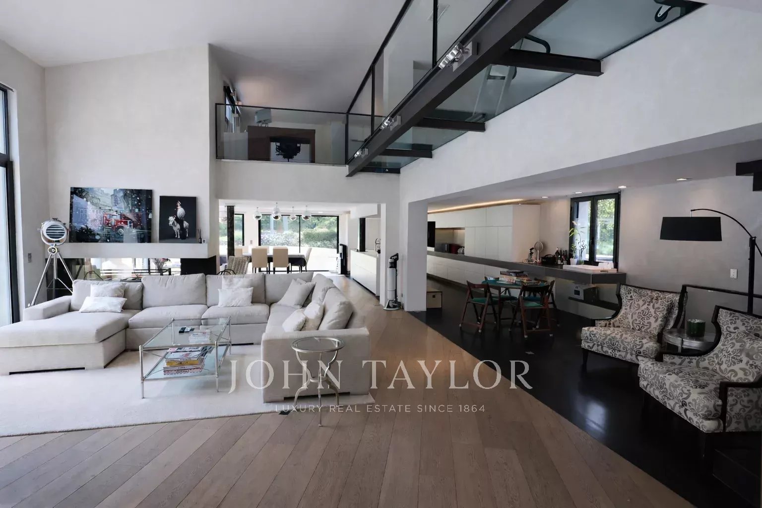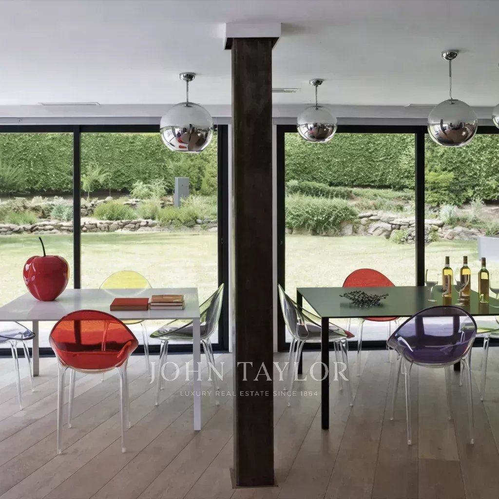 De larges baies vitrées effacent les frontières entre intérieur et extérieur, baignant les espaces de vie de lumière naturelle et offrant une continuité fluide vers les terrasses et le jardin, véritable écrin de verdure.