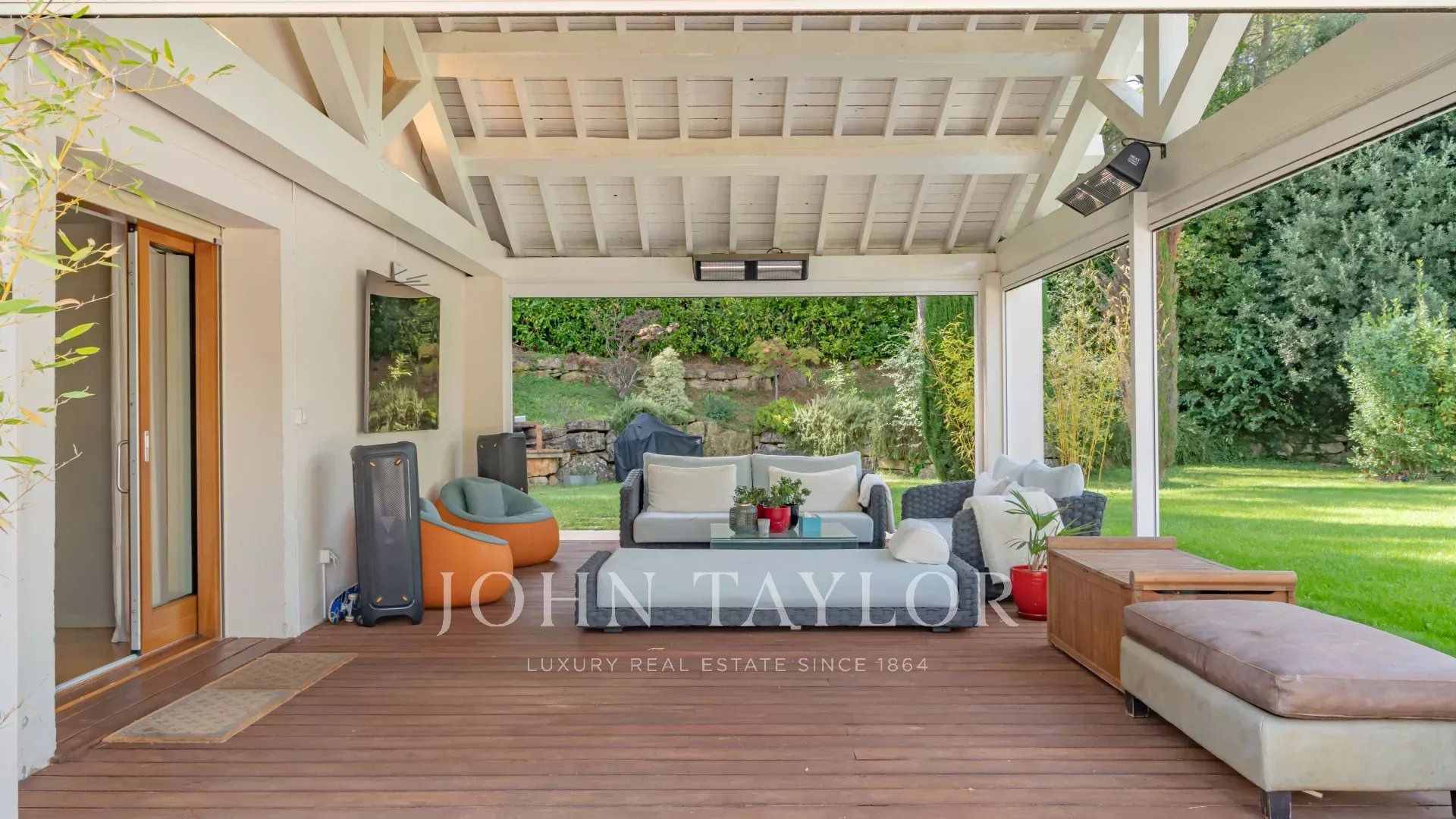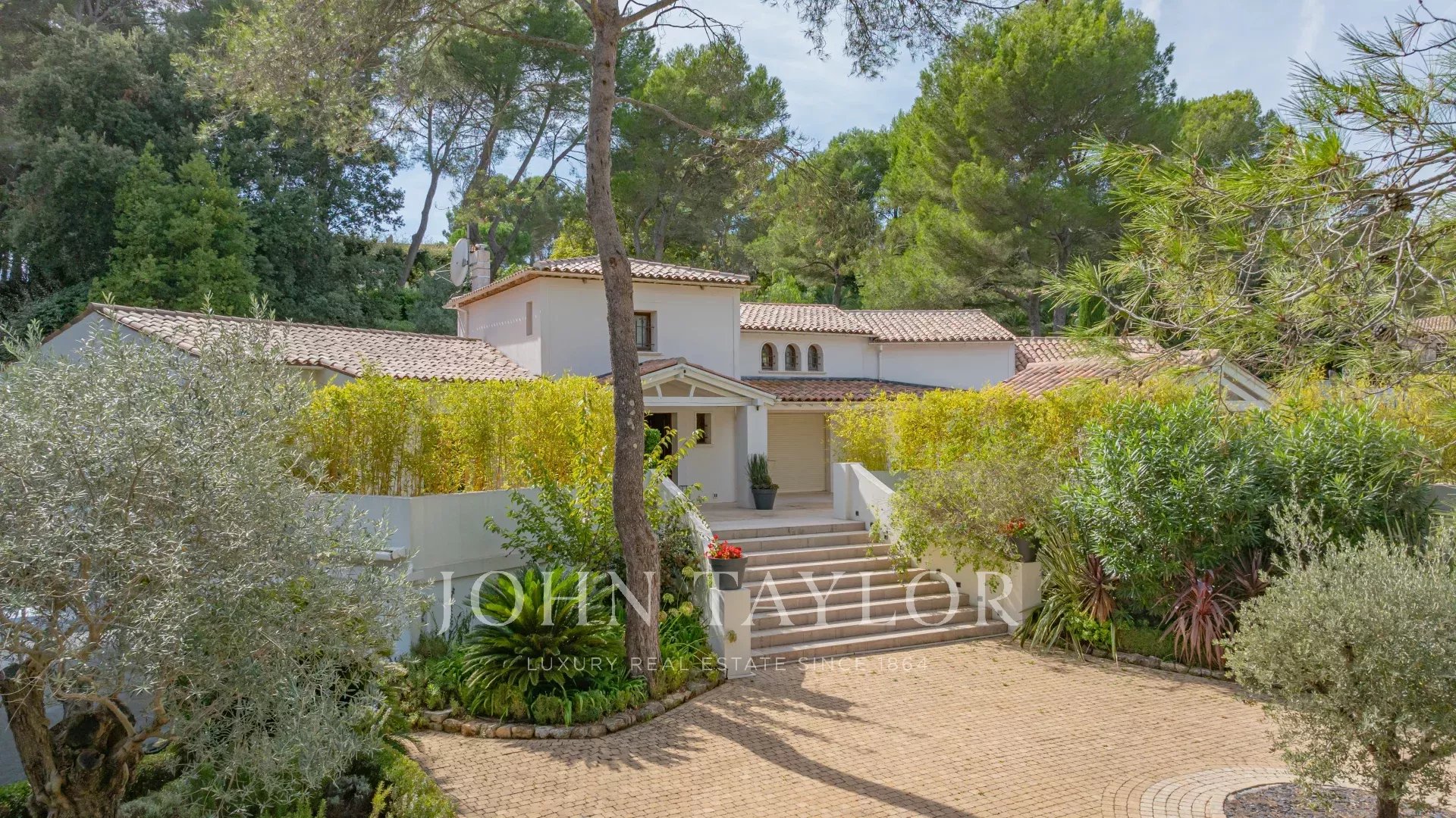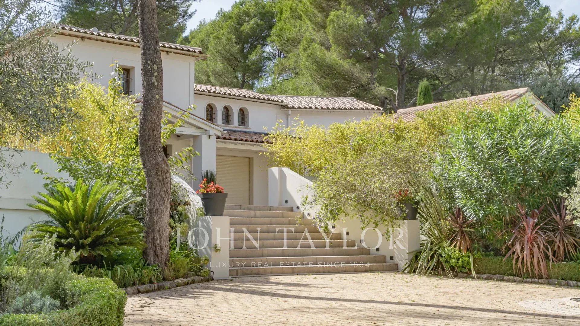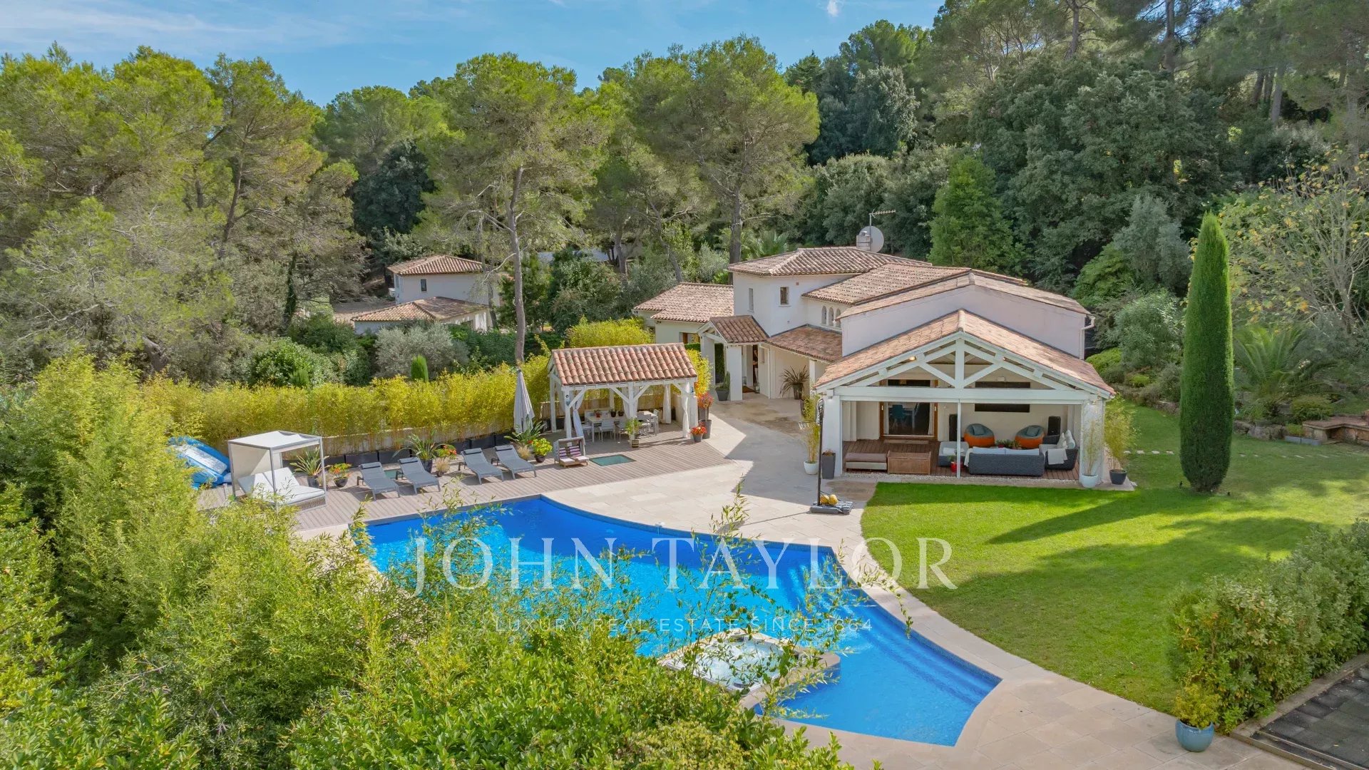 Dans le Domaine fermé et sécurisé des Parcs de Mougins, cette villa entièrement rénovée de 362 m2 est sise sur un jardin paysager d'environ 3200 m2 avec piscine chauffée et jacuzzi.