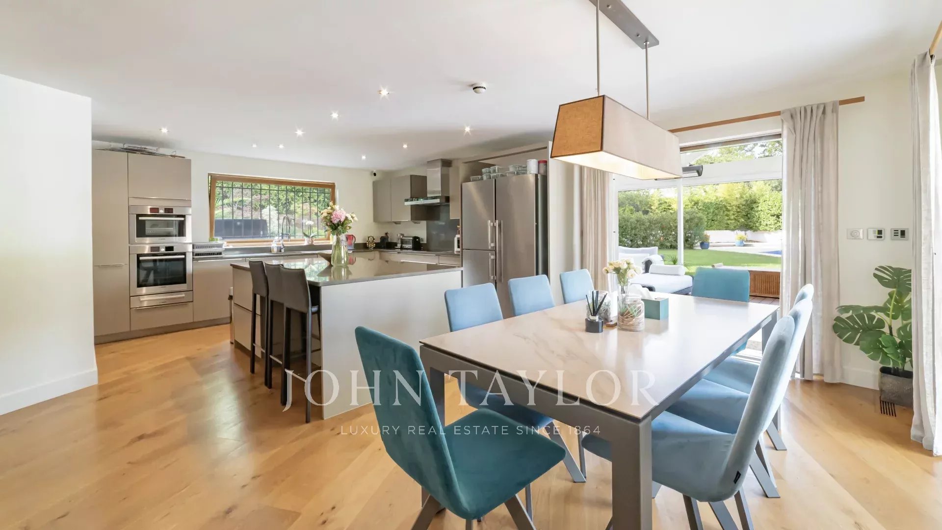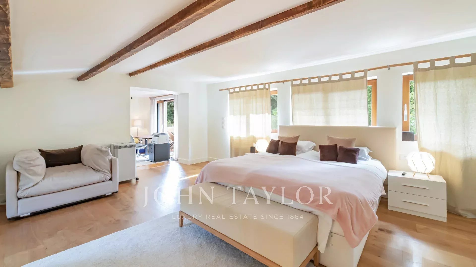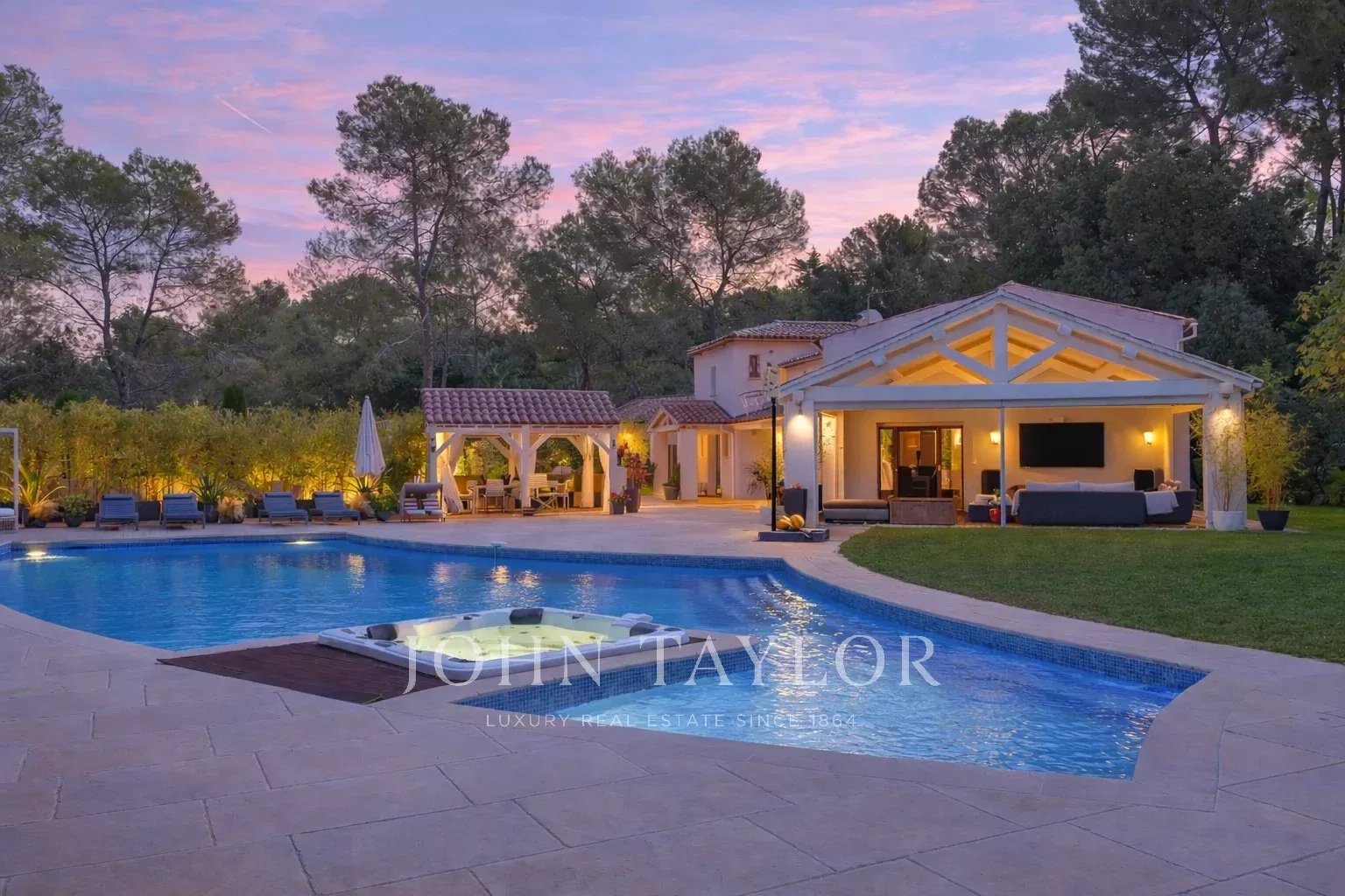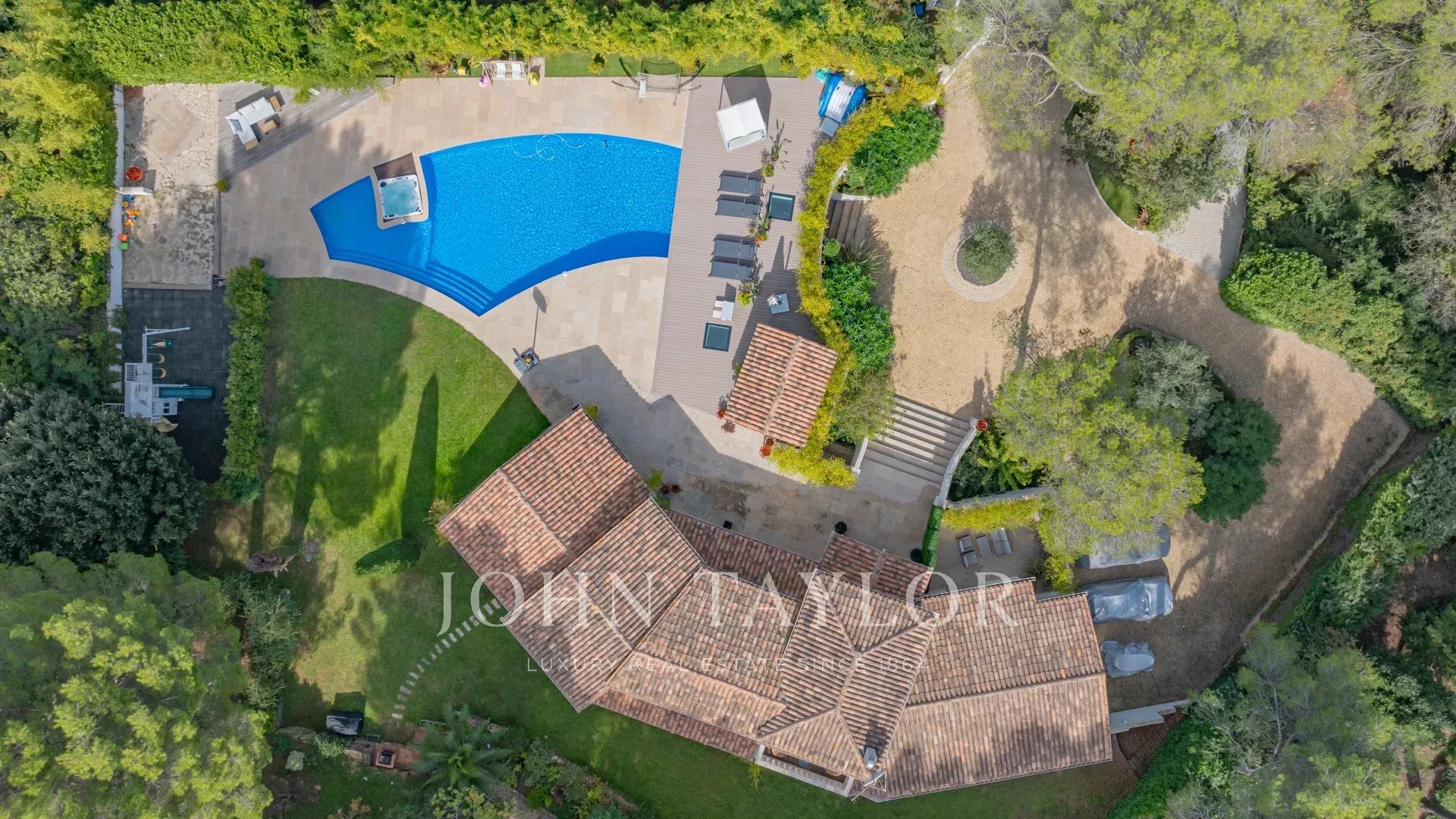 Dans le Domaine fermé et sécurisé des Parcs de Mougins, cette villa entièrement rénovée de 362 m2 est sise sur un jardin paysager d'environ 3200 m2 avec piscine chauffée et jacuzzi.