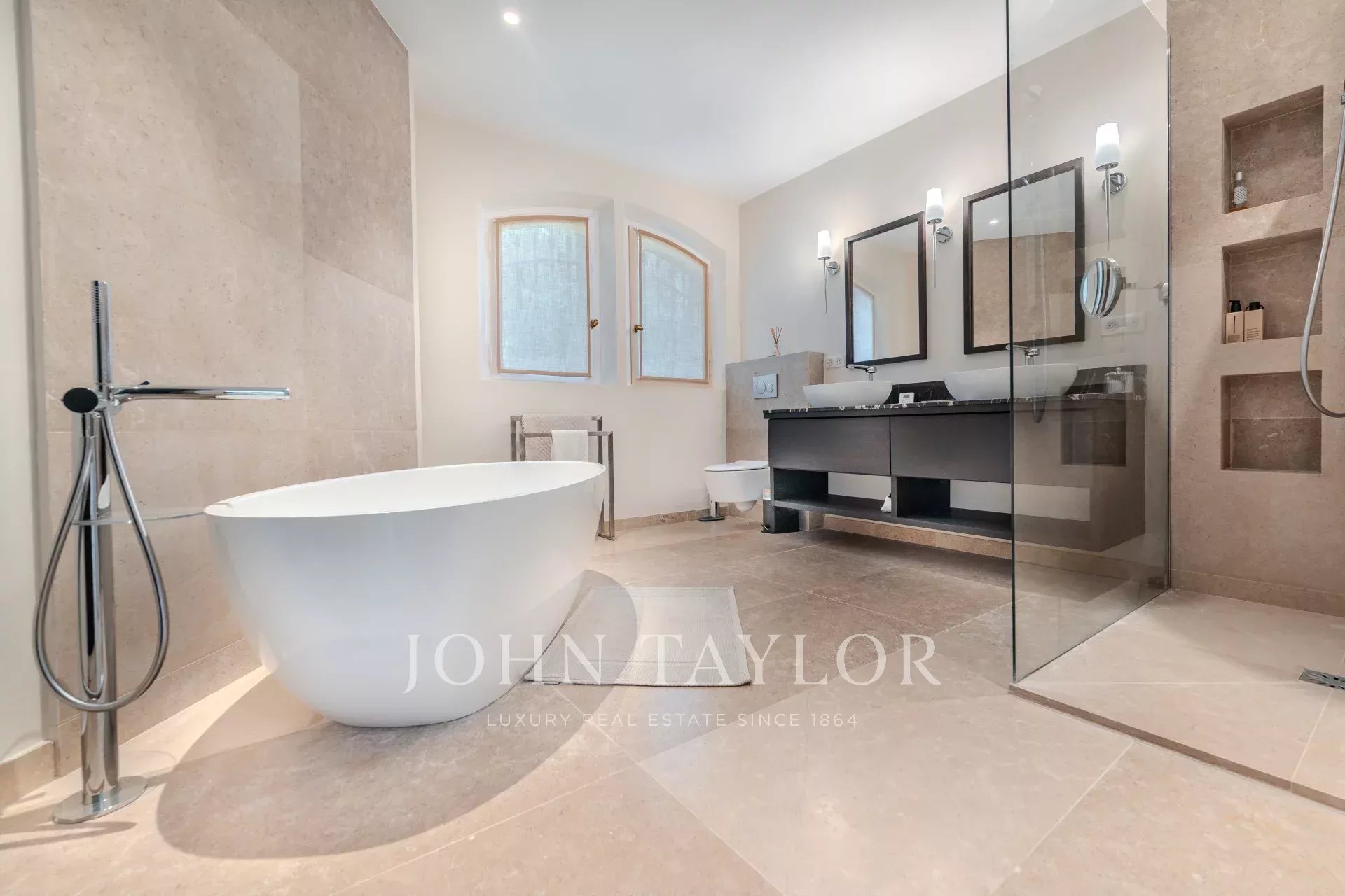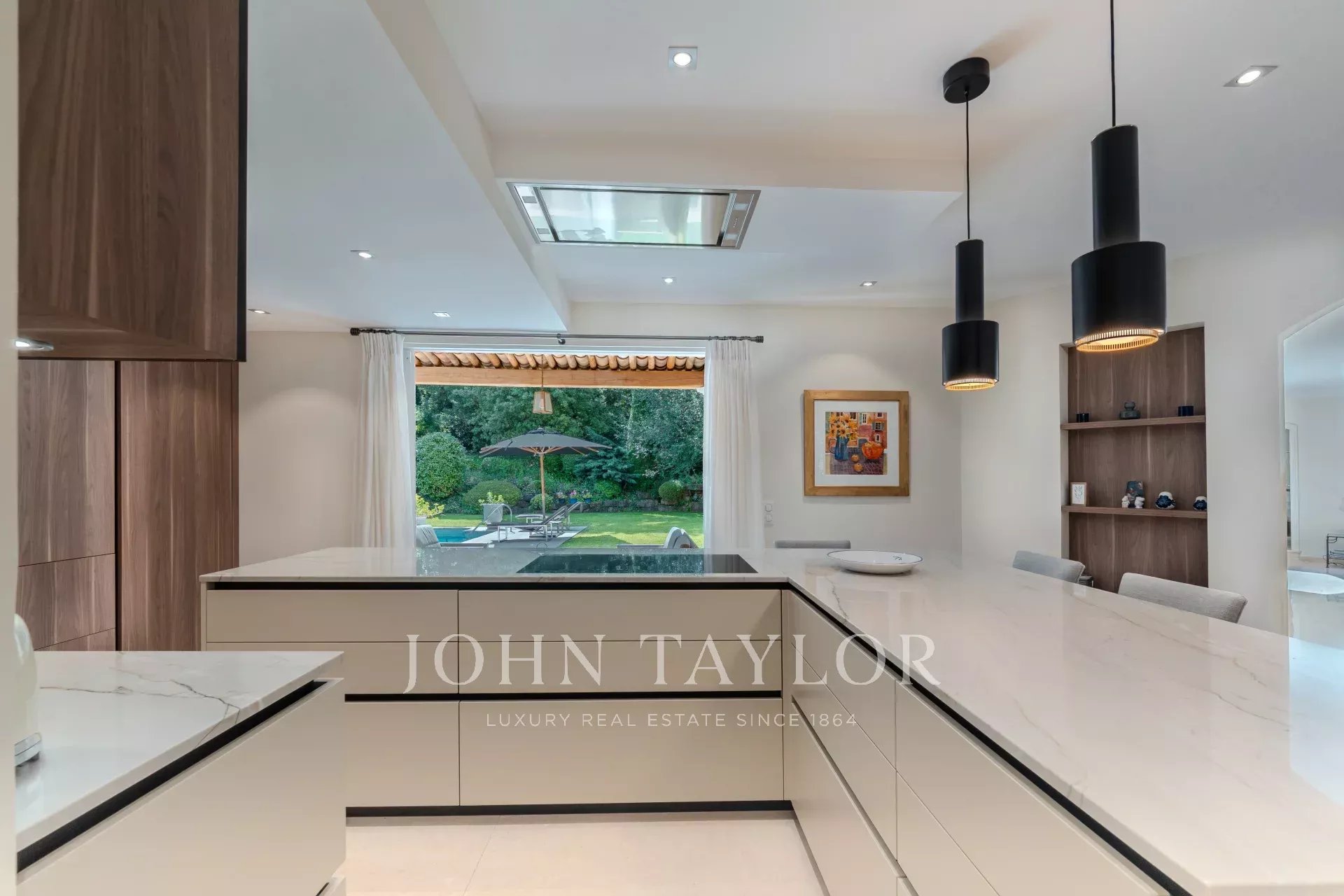 Entièrement rénovée avec des matériaux de qualité, la propriété propose 5 chambres en suite, au sein d’un magnifique jardin paysager d’environ 3 100 m², véritable écrin de verdure.