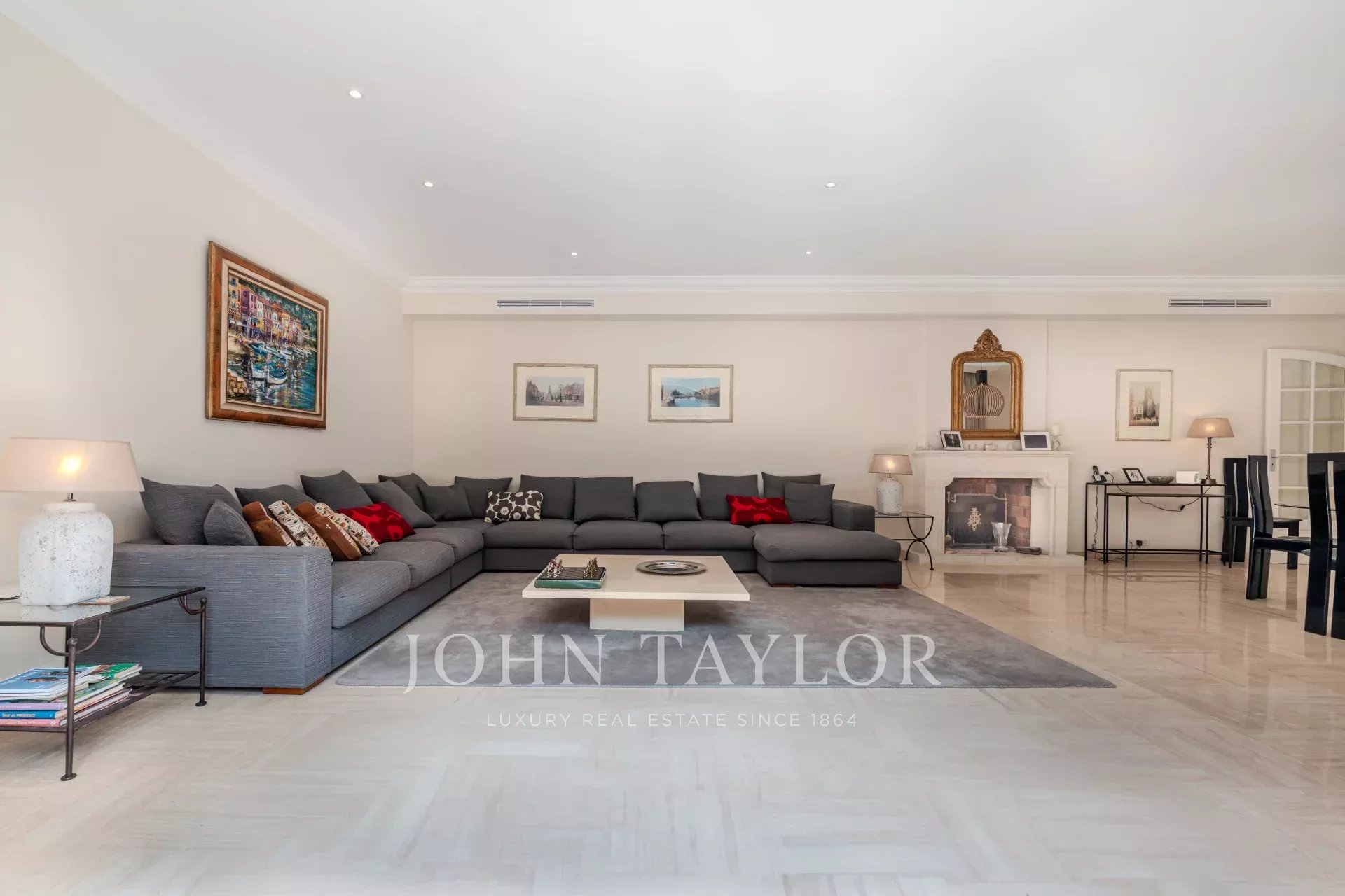 Les espaces de réception, baignés de lumière naturelle, comprennent un vaste salon et une salle à manger sublimés par de larges baies vitrées à galandage, créant une atmosphère raffinée et conviviale.