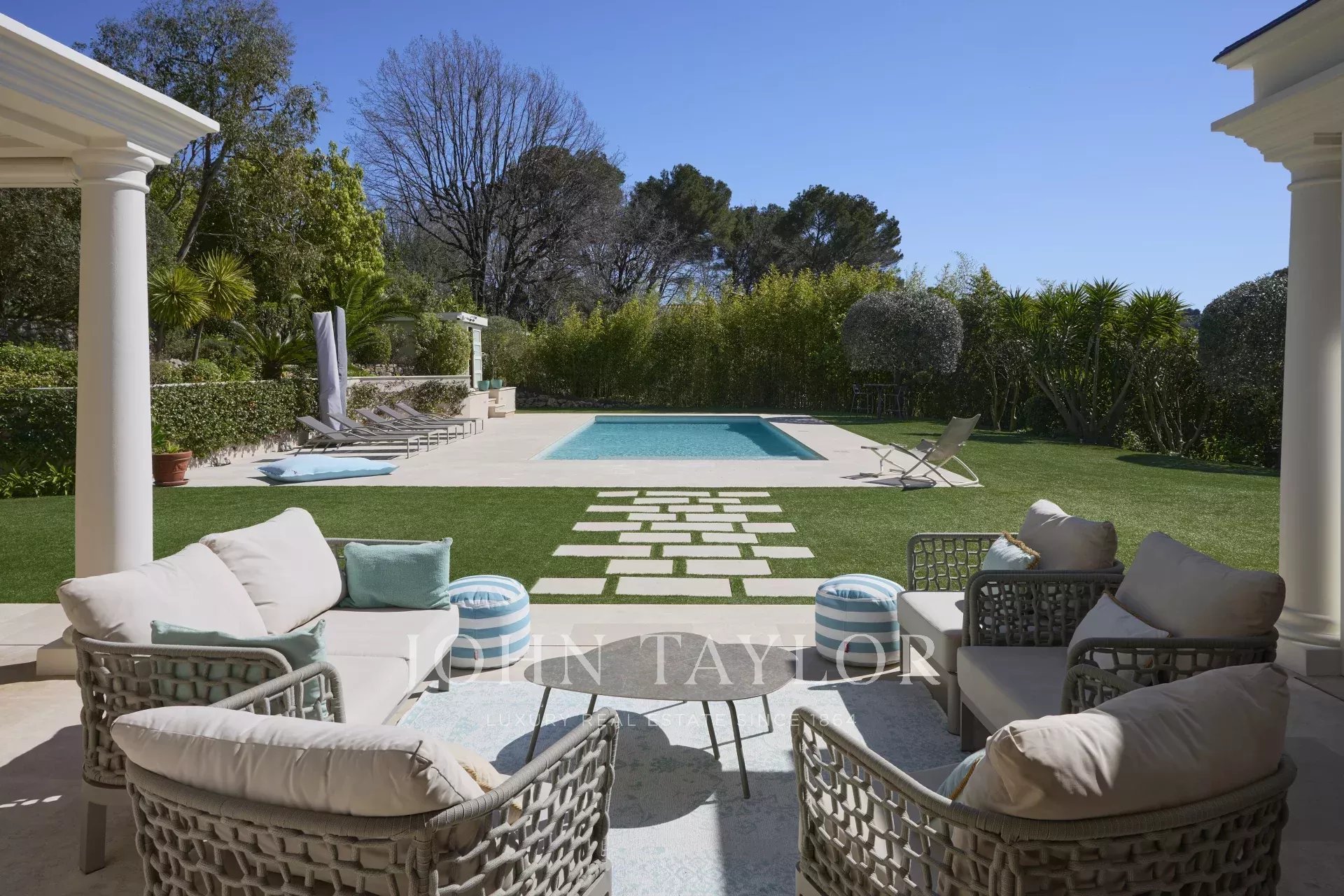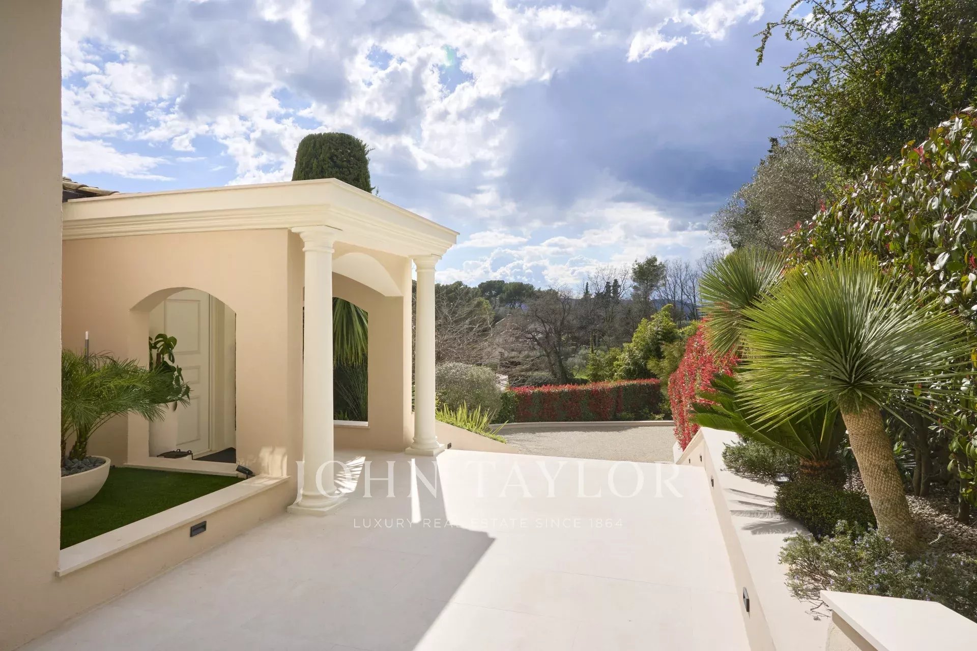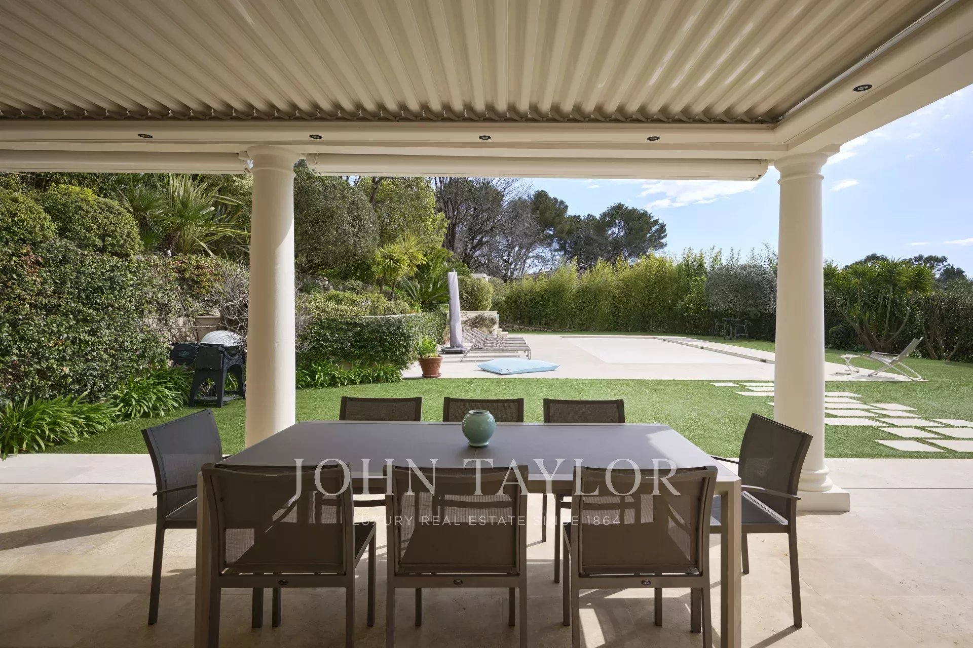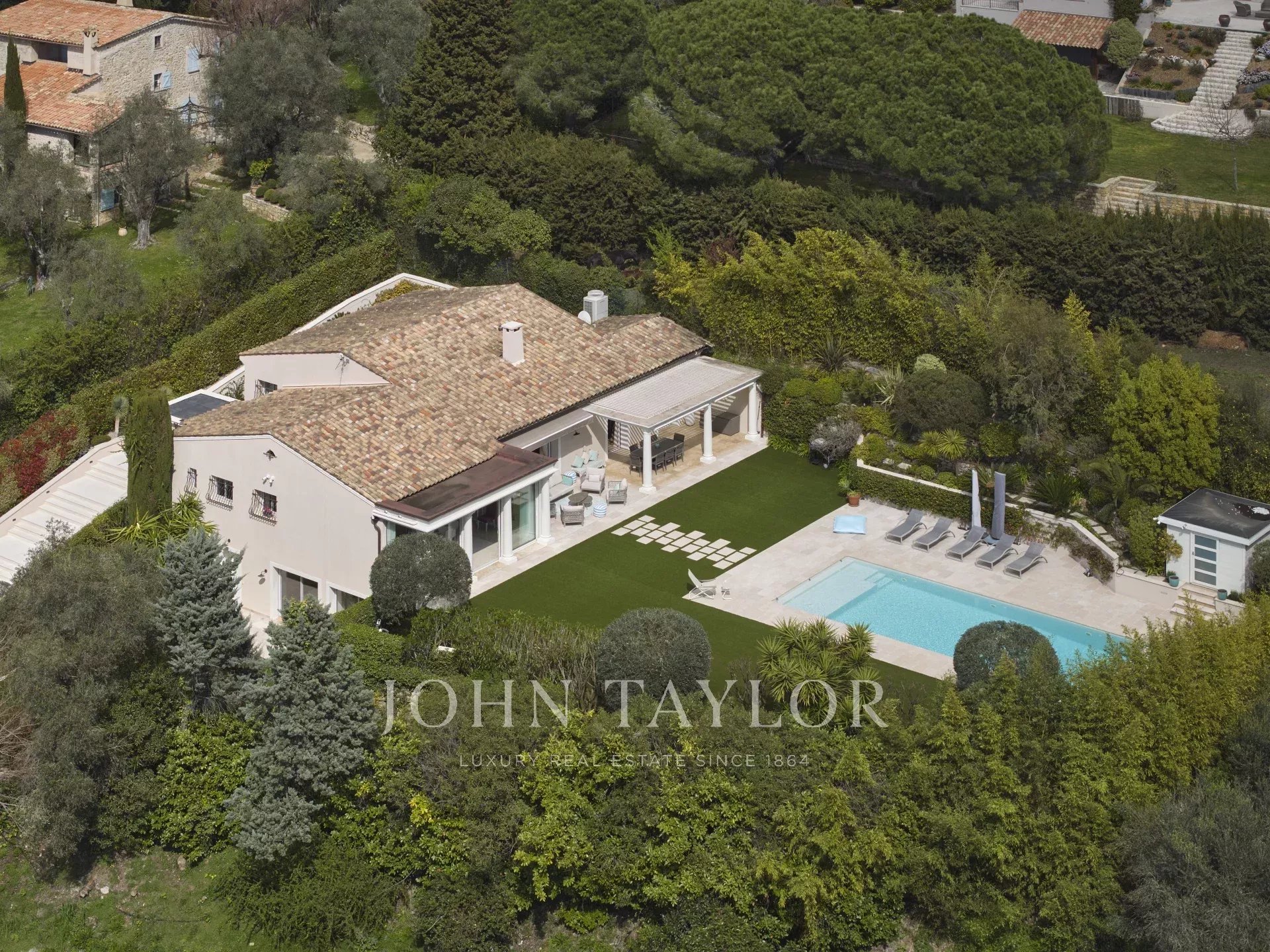 Le jardin, d’une superficie d’environ 3 800 m², a été entièrement paysagé avec soin et planté d’essences méditerranéennes. La propriété jouit d’une vue dégagée et remarquable sur le village pittoresque de Mougins, sublimant ainsi ce cadre de vie d’exception.