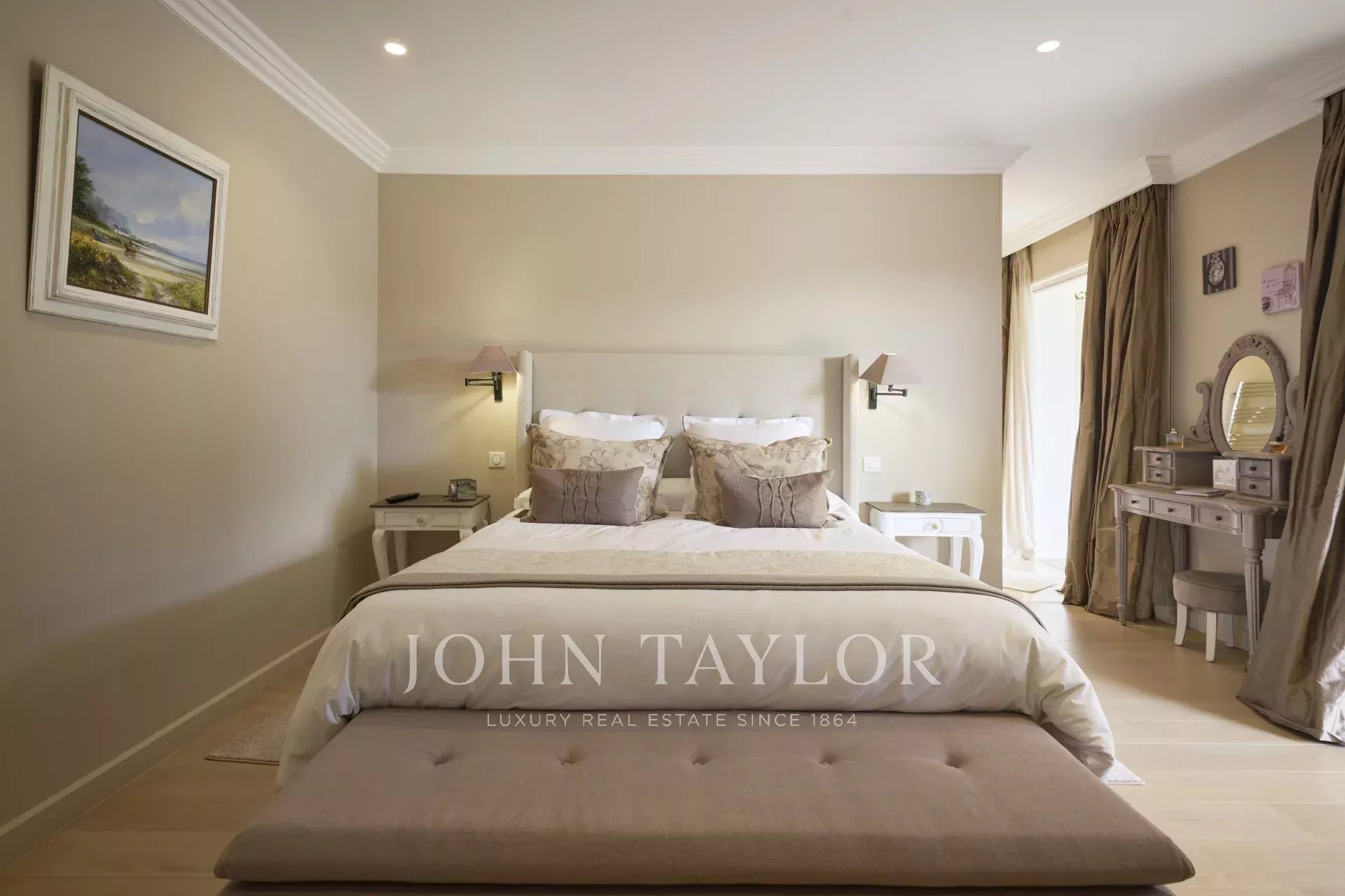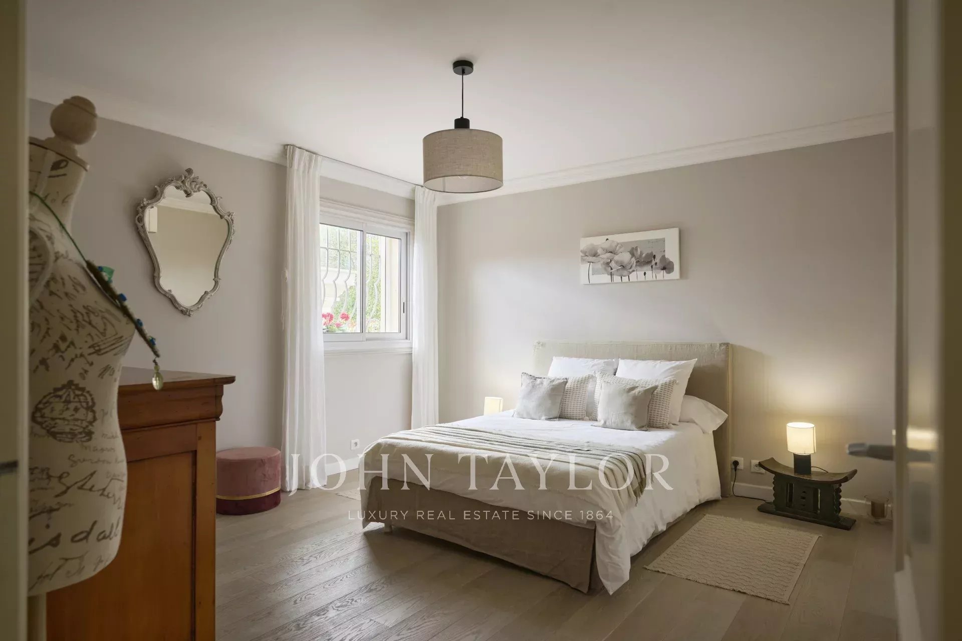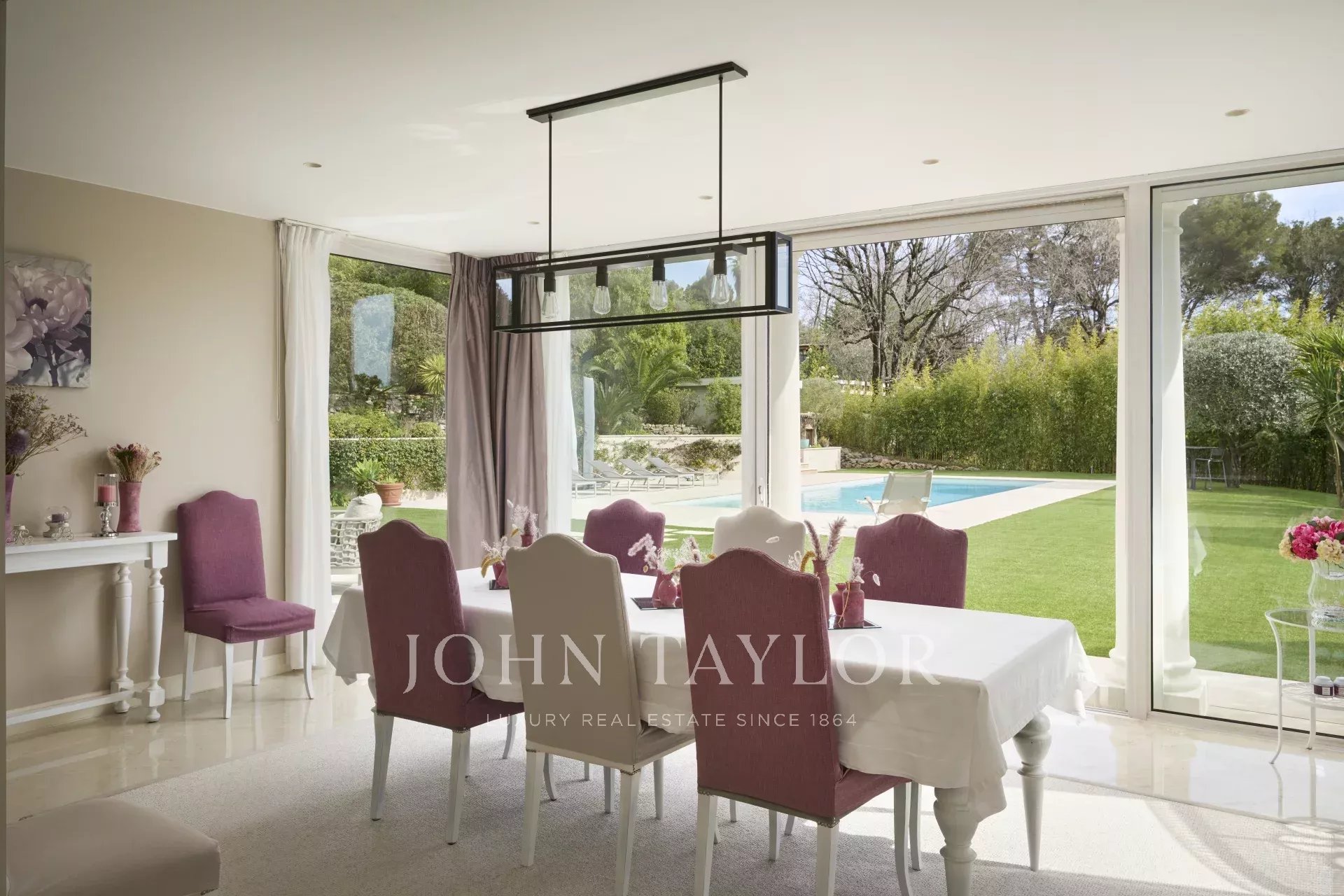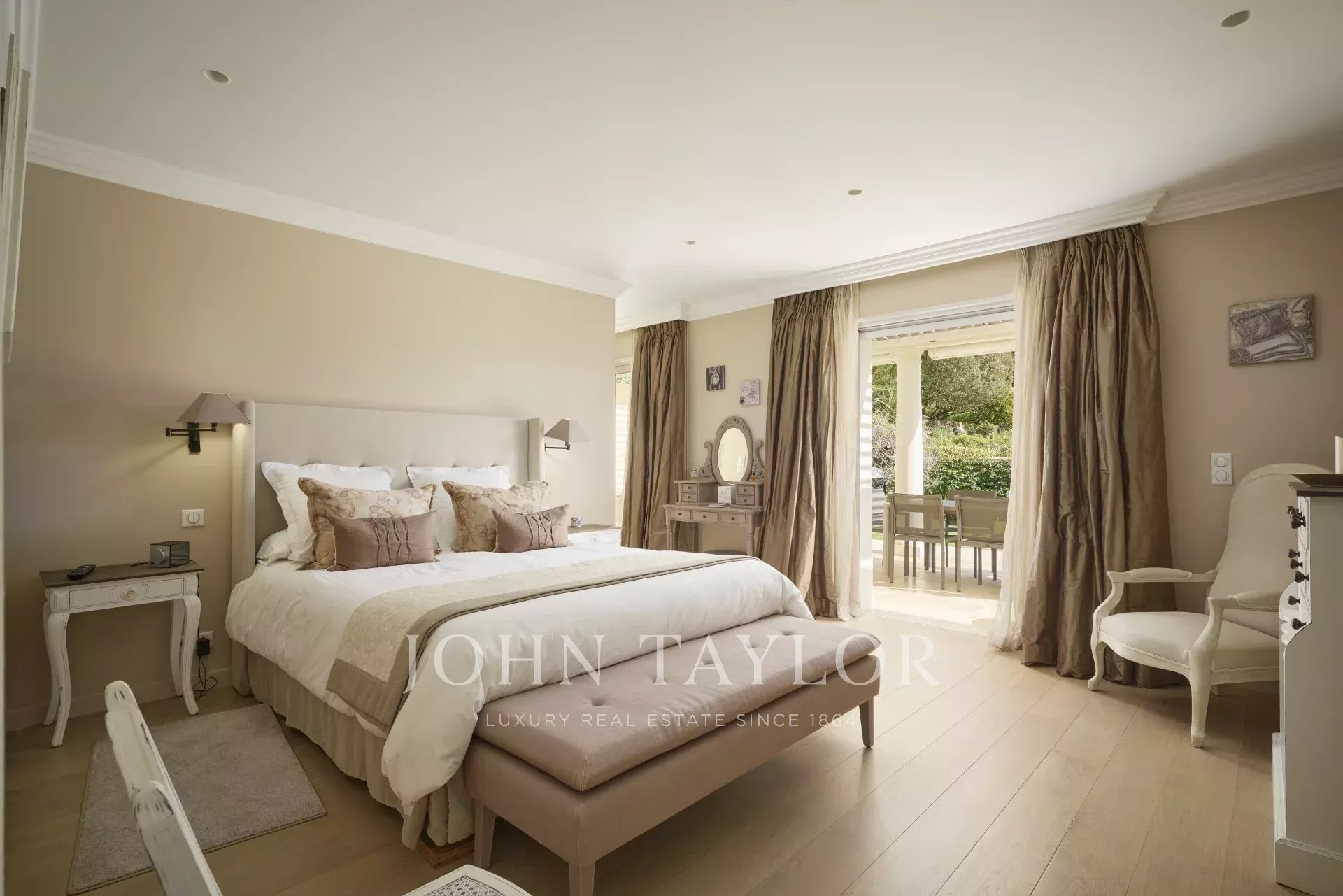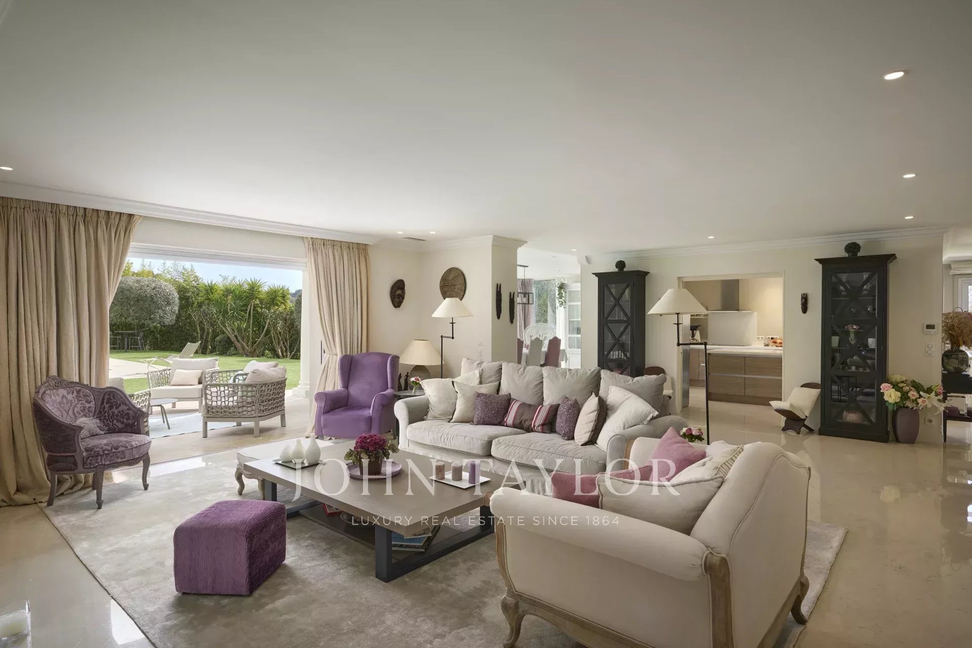 Le jardin, d’une superficie d’environ 3 800 m², a été entièrement paysagé avec soin et planté d’essences méditerranéennes. La propriété jouit d’une vue dégagée et remarquable sur le village pittoresque de Mougins, sublimant ainsi ce cadre de vie d’exception.