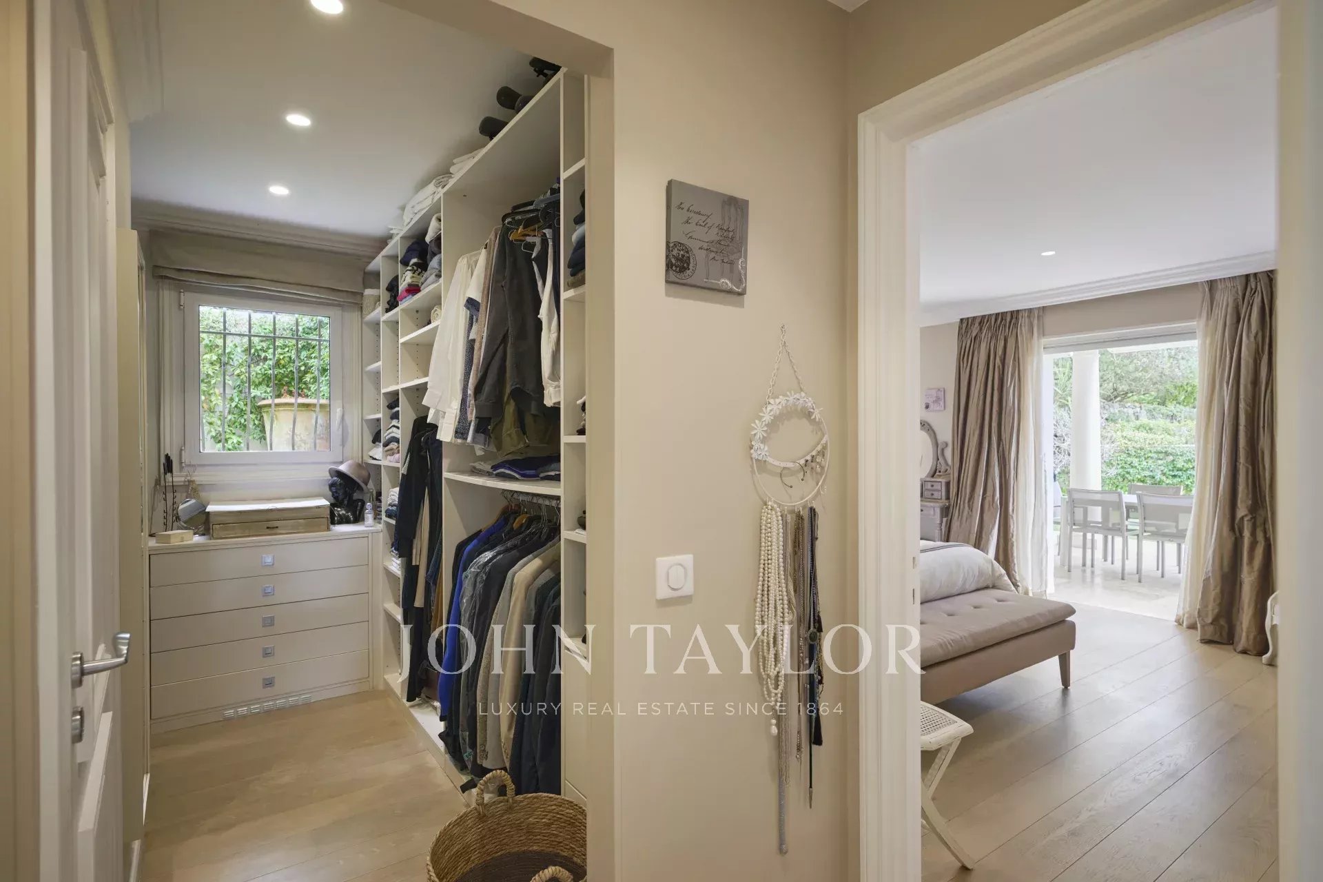 Le niveau principal accueille un vaste séjour baigné de lumière, agrémenté d’une cheminée, ainsi qu’une élégante salle à manger. La cuisine, entièrement équipée, s’intègre avec fluidité à cet espace convivial. Ce niveau comprend également un wc pour les invités, ainsi que la suite principale, dotée d’un dressing spacieux et d’une salle de bains privative. Deux autres chambres, chacune pourvue de son propre dressing et salle de bains, complètent cet étage.