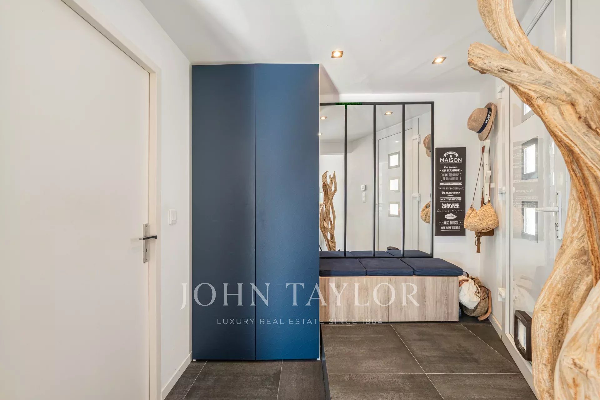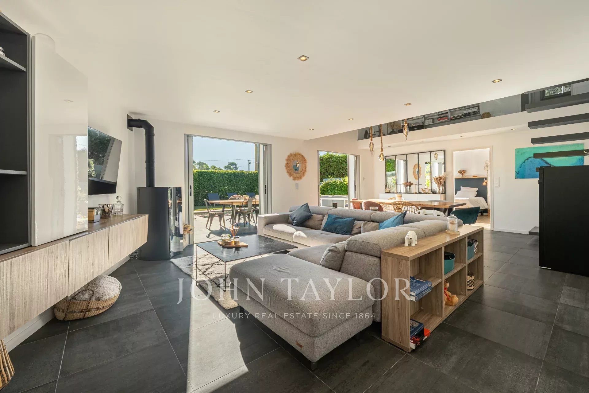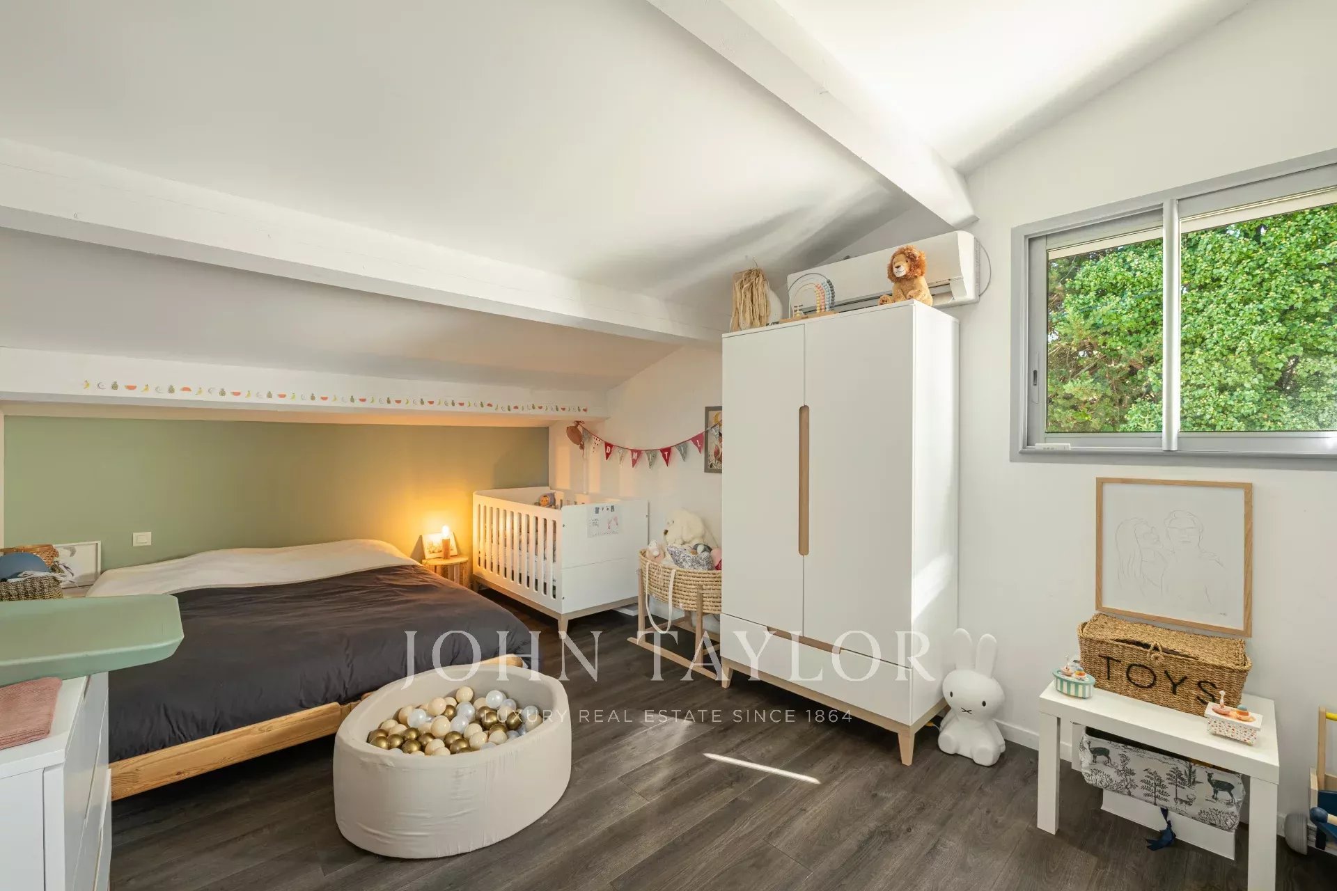 Au rez-de-chaussée, l’entrée avec dressing et toilettes invités ouvre sur un spacieux séjour baigné de lumière, une cuisine ouverte avec arrière-cuisine, ainsi qu’une chambre principale dotée d’une salle de bains avec douche et d’un sauna. À l’étage, une très grande mezzanine, idéale pour un bureau, dessert deux belles chambres avec leurs salles de douche privatives.