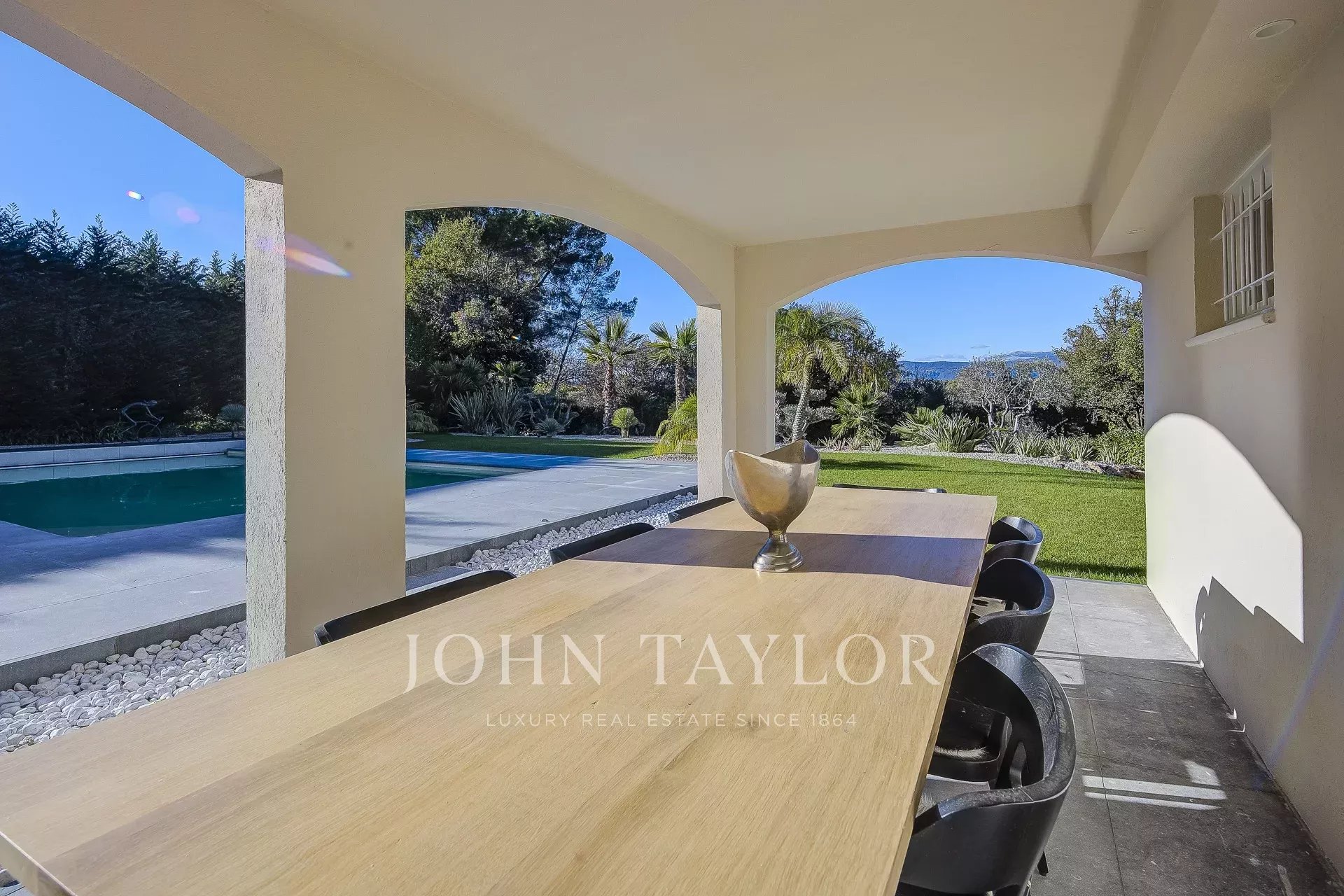 Nichée au sein du très prisé domaine sécurisé du Royal Mougins Golf Resort, cette élégante villa offre un cadre de vie exceptionnel alliant calme, nature et confidentialité.