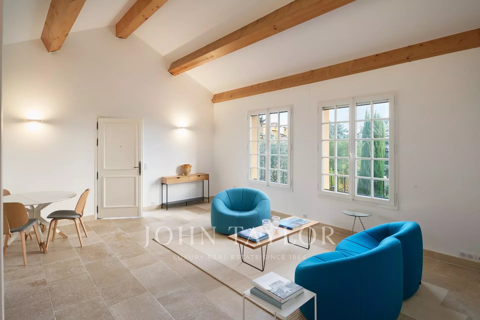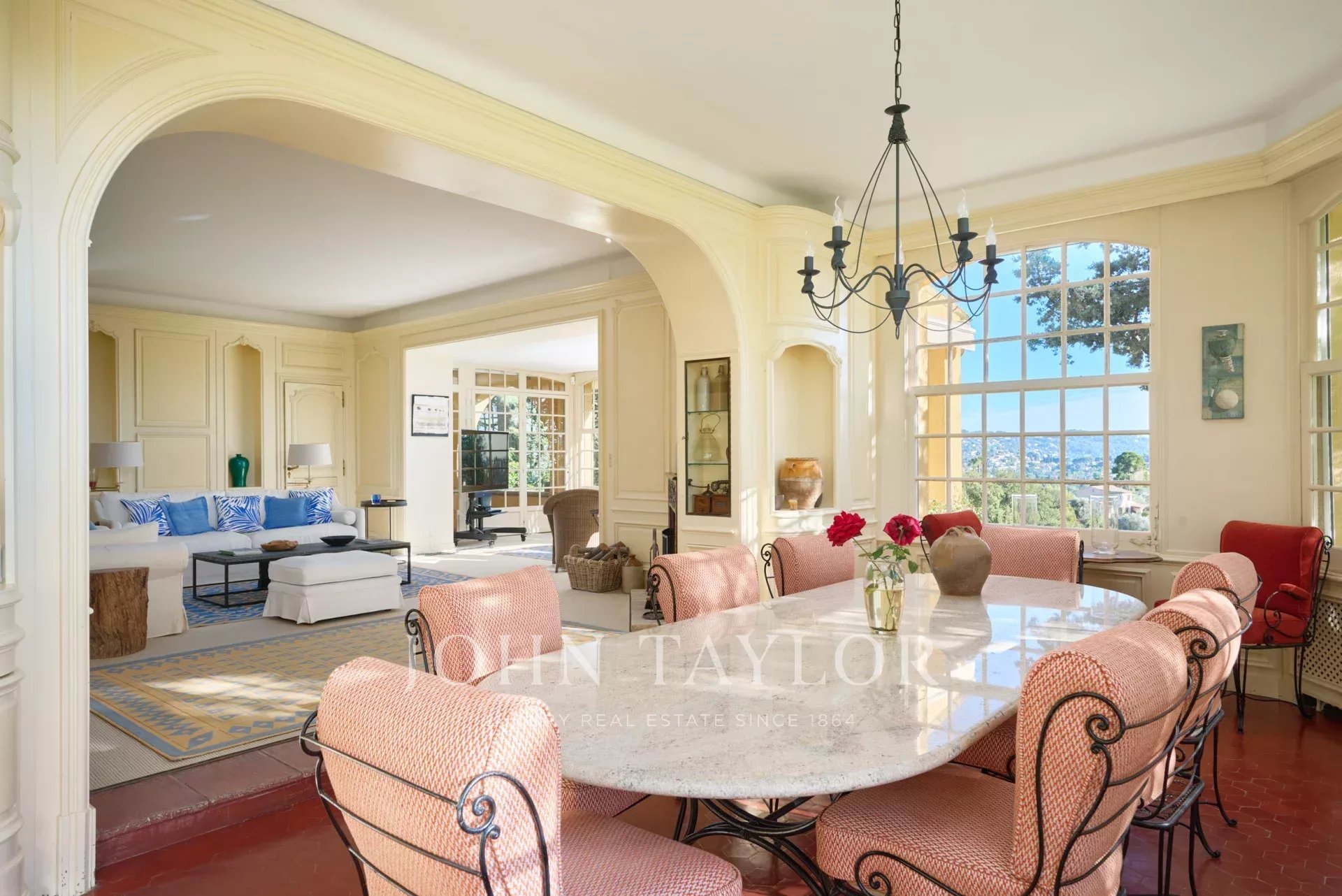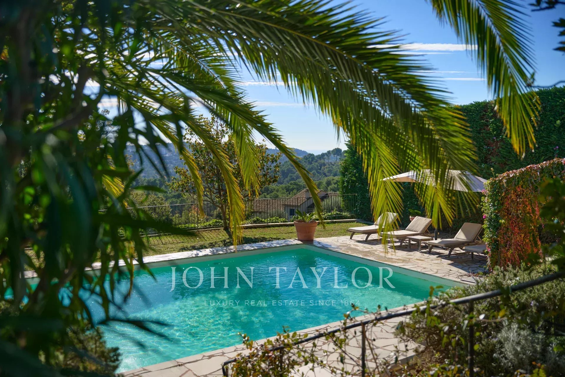Les jardins luxuriants qui entourent la propriété ajoutent une dimension magique. Des oliviers centenaires, des parterres de fleurs, une roseraie, un verger et une piscine chauffée créent un cadre idyllique pour des moments de détente et de divertissement sous le soleil de la Côte d'Azur. La vue panoramique sur les collines verdoyantes de Mougins, la mer et l’Esterel complètent cette expérience exceptionnelle.