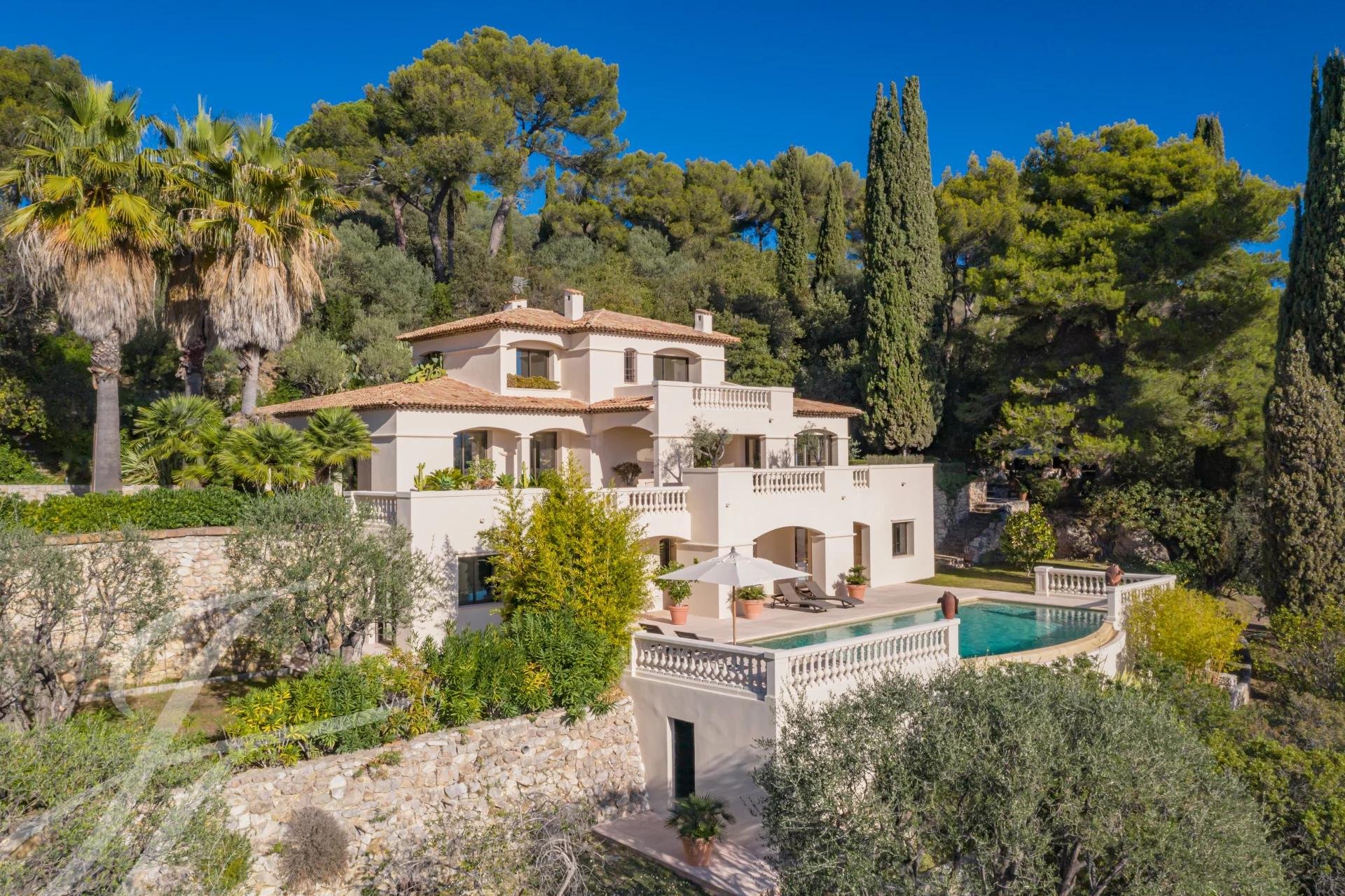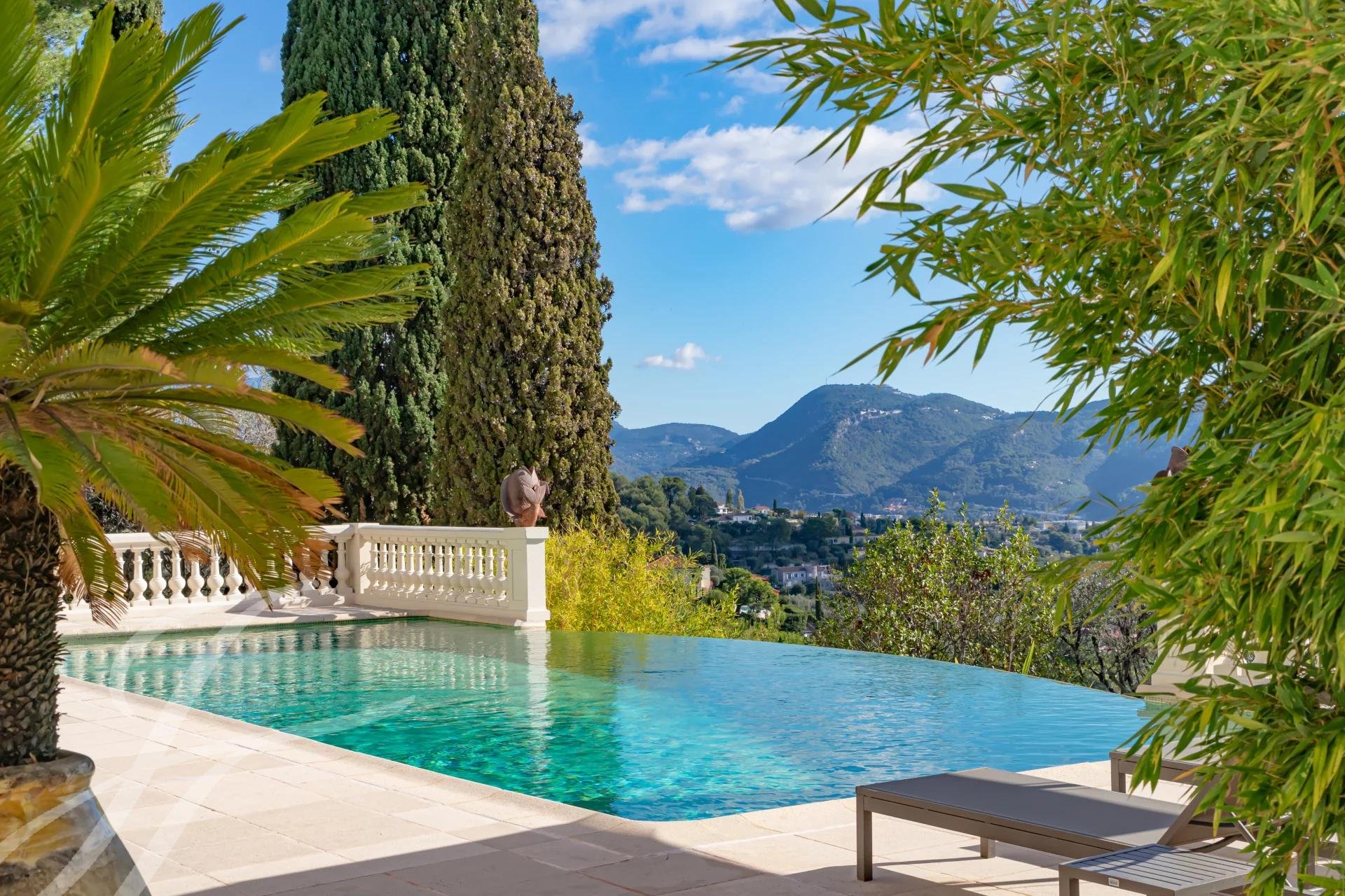 Située dans un domaine discret et privilégié, en position dominante exposée Sud-Est, cette propriété de style moderne, parfaitement entretenue, offre une vue panoramique imprenable sur la Méditerranée jusqu’au Cap d’Antibes ainsi que sur les collines niçoises des Monts Vinaigrier et Mont Boron et bien au-delà.