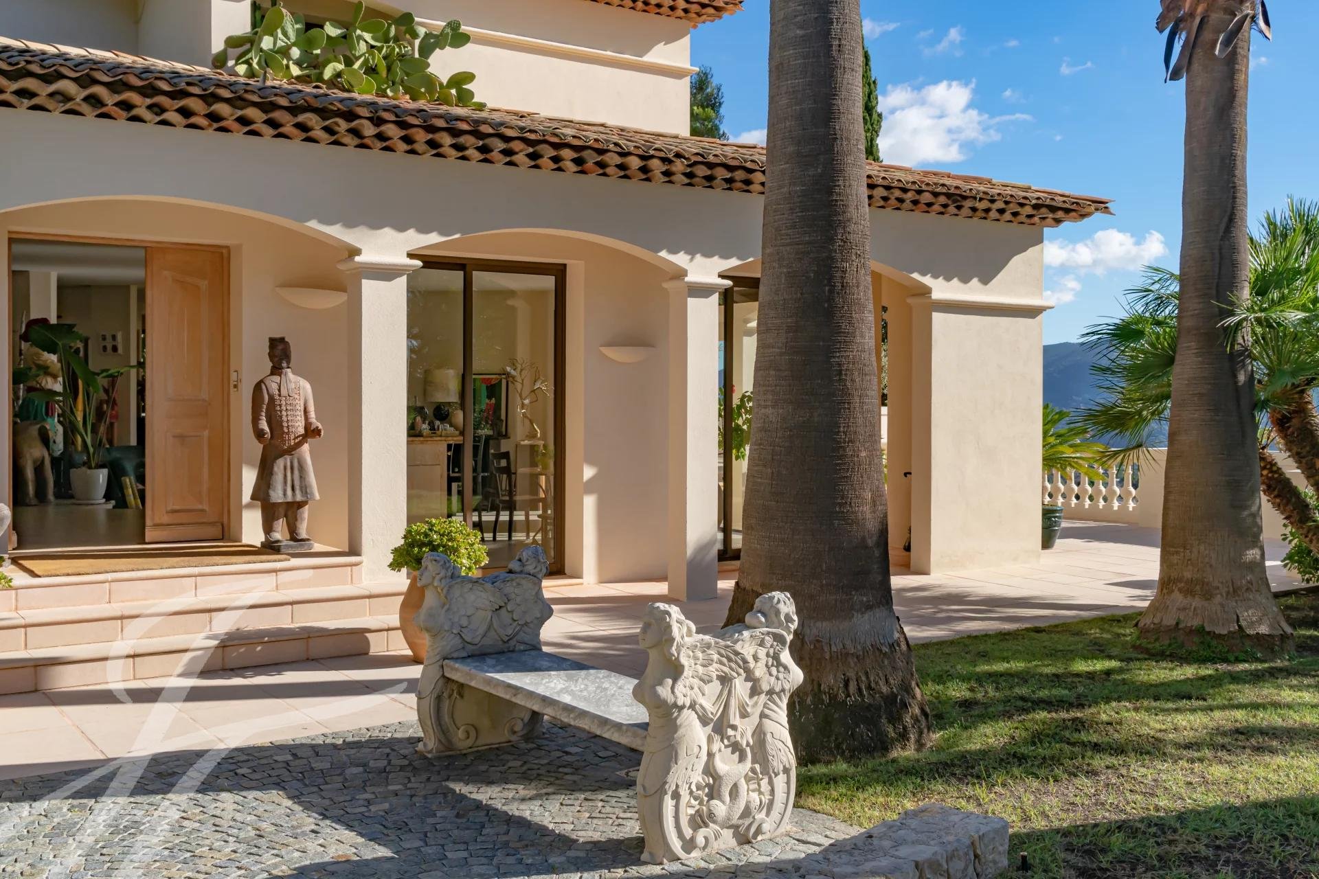 Située dans un domaine discret et privilégié, en position dominante exposée Sud-Est, cette propriété de style moderne, parfaitement entretenue, offre une vue panoramique imprenable sur la Méditerranée jusqu’au Cap d’Antibes ainsi que sur les collines niçoises des Mont Vinaigrier – Mont Boron et bien au-delà.