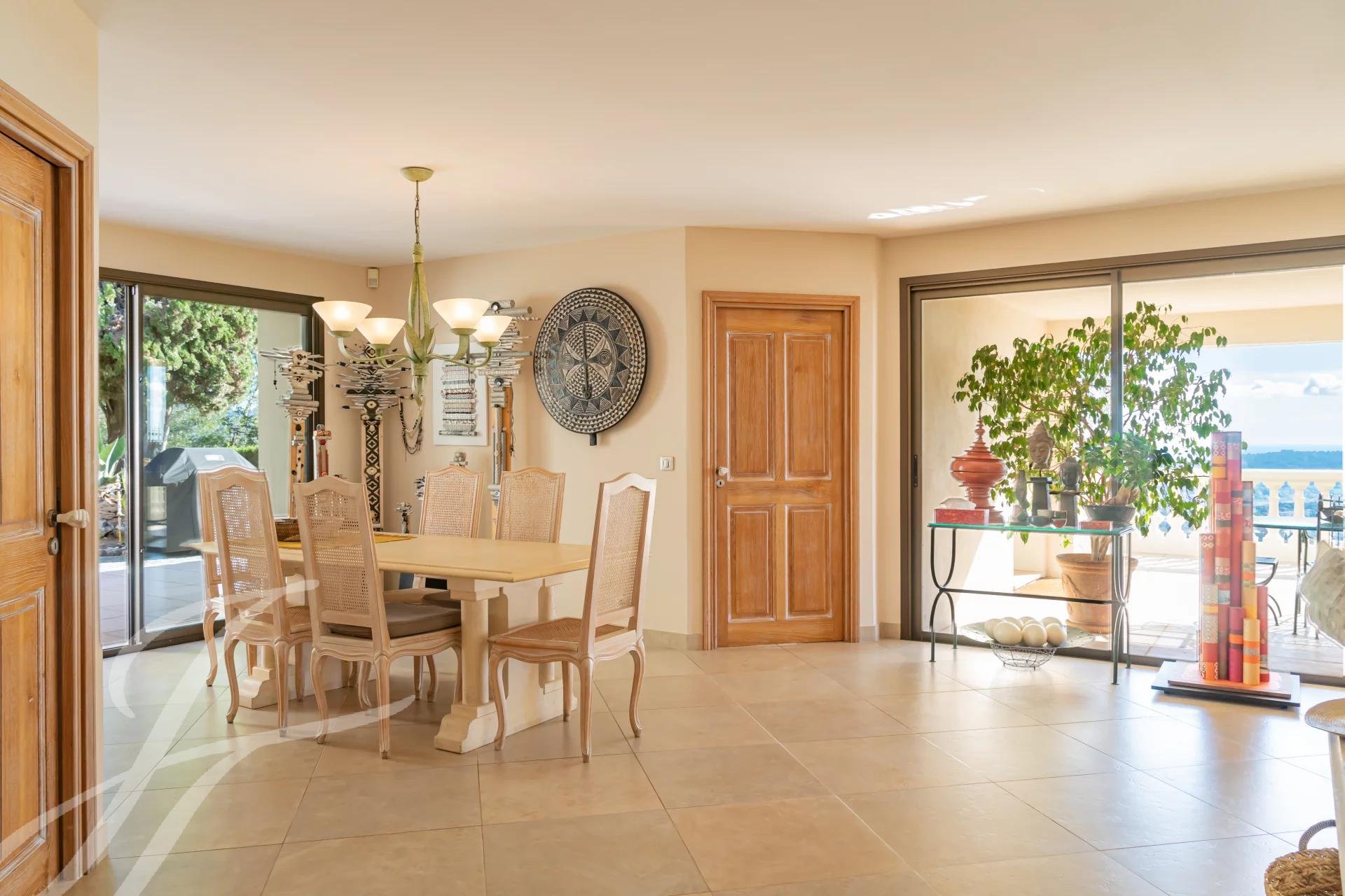. un vaste séjour/salle à manger (d’environ 105 m²) très accueillant, baigné de lumière naturelle à travers les multiples baies vitrées ouvrant sur l’espace extérieur, composé d’une large terrasse circulaire semi-abritée,