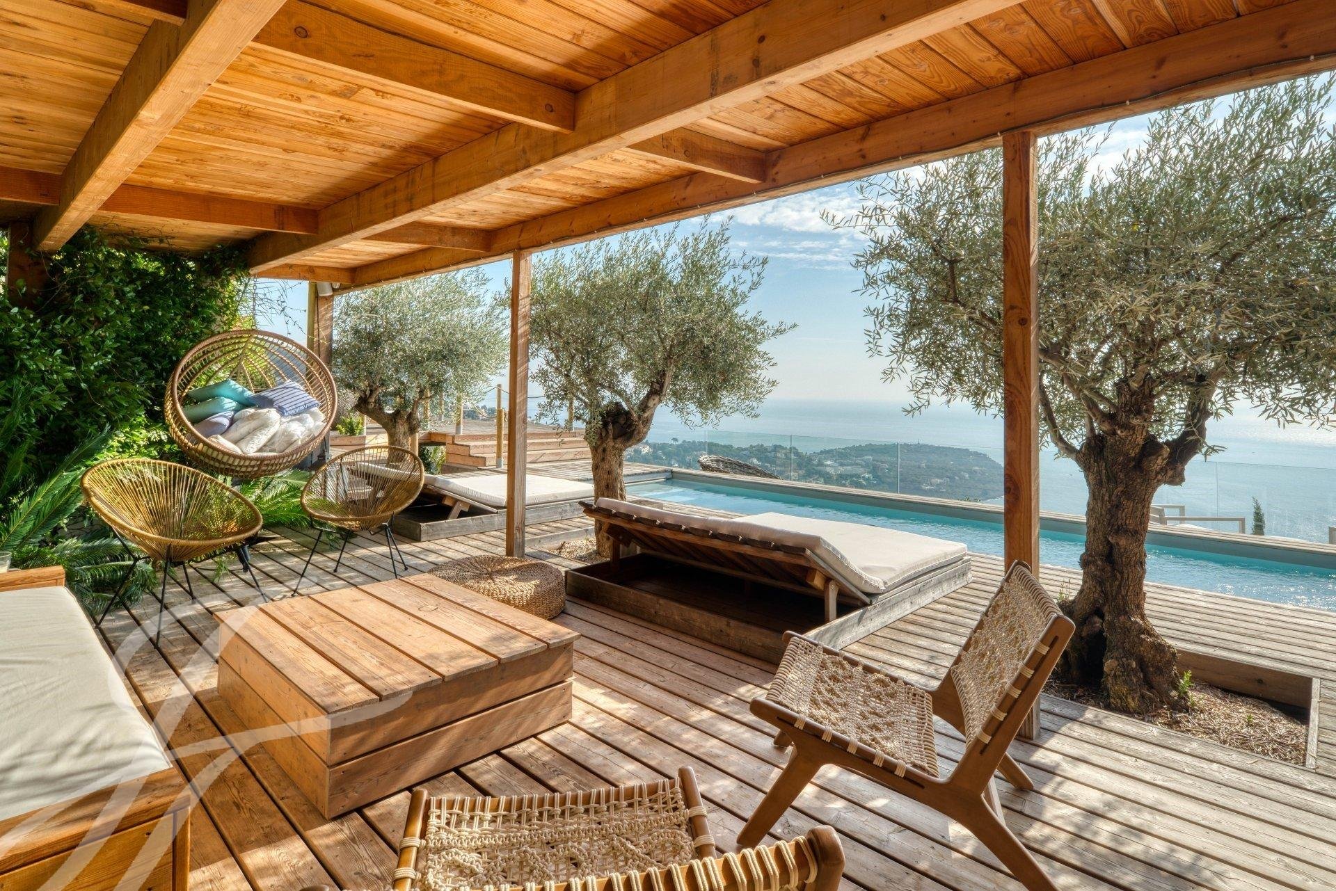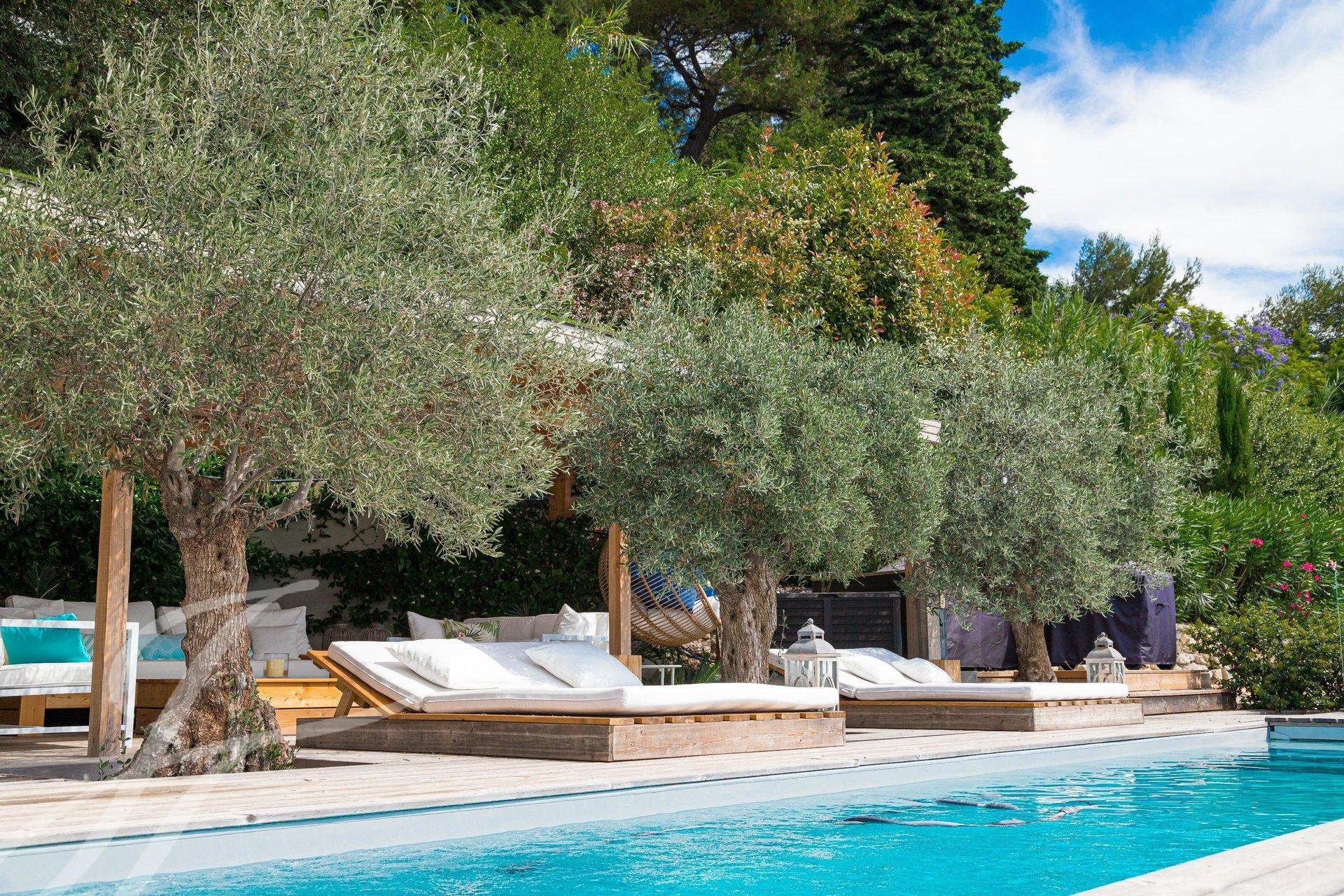 Bénéficiant d'un cadre de vie hors du temps, cette villa dispose de vastes terrasses comprenant un très bel espace piscine avec pool house et salon d'été, une terrasse surélevée avec une vue mer féérique, un espace salle à manger extérieur au charme de la Provence vue mer panoramique.