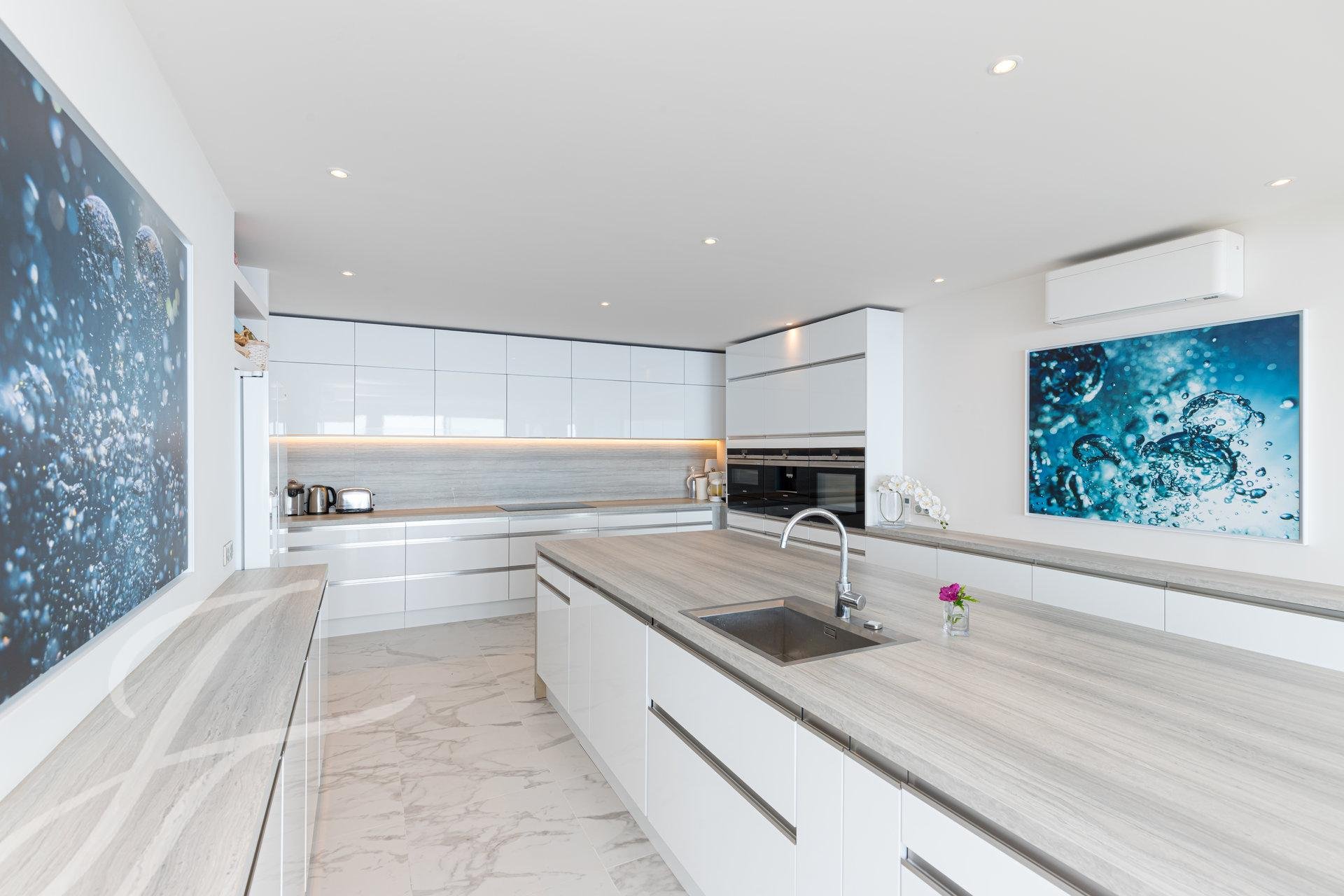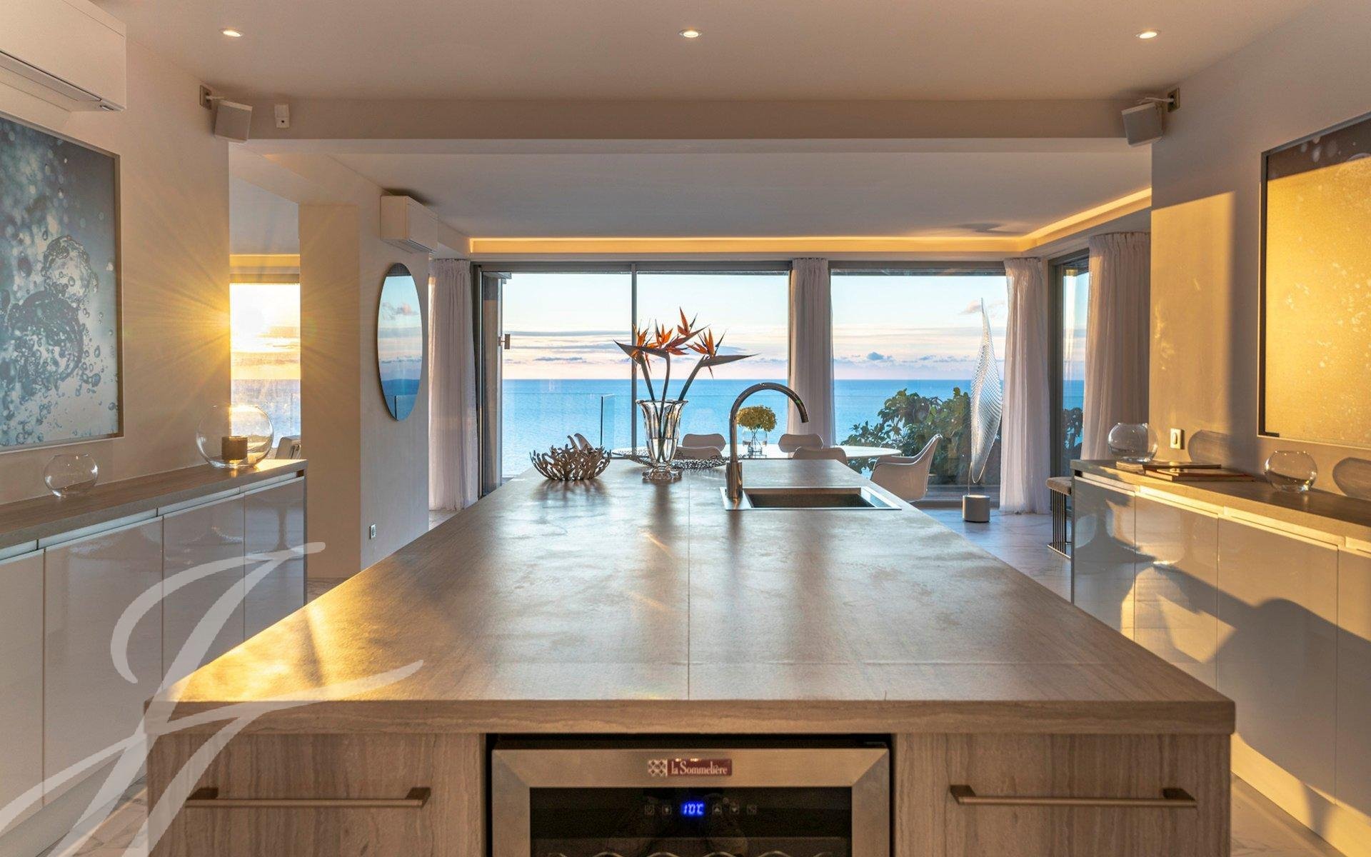 Entrée sur un triple séjour dont un salon télé avec sa cheminée, (insert double face), un second salon, une salle à manger, une cuisine américaine haut de gamme entièrement équipée, le tout ouvrant sur une terrasse vue mer.