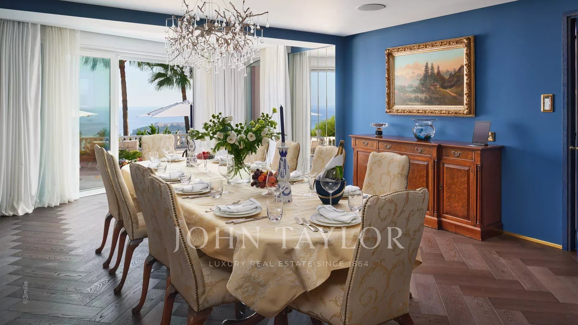La villa comprend une salle à manger pouvant accueillir jusqu'à 22 convives, une cuisine professionnelle et un salon.