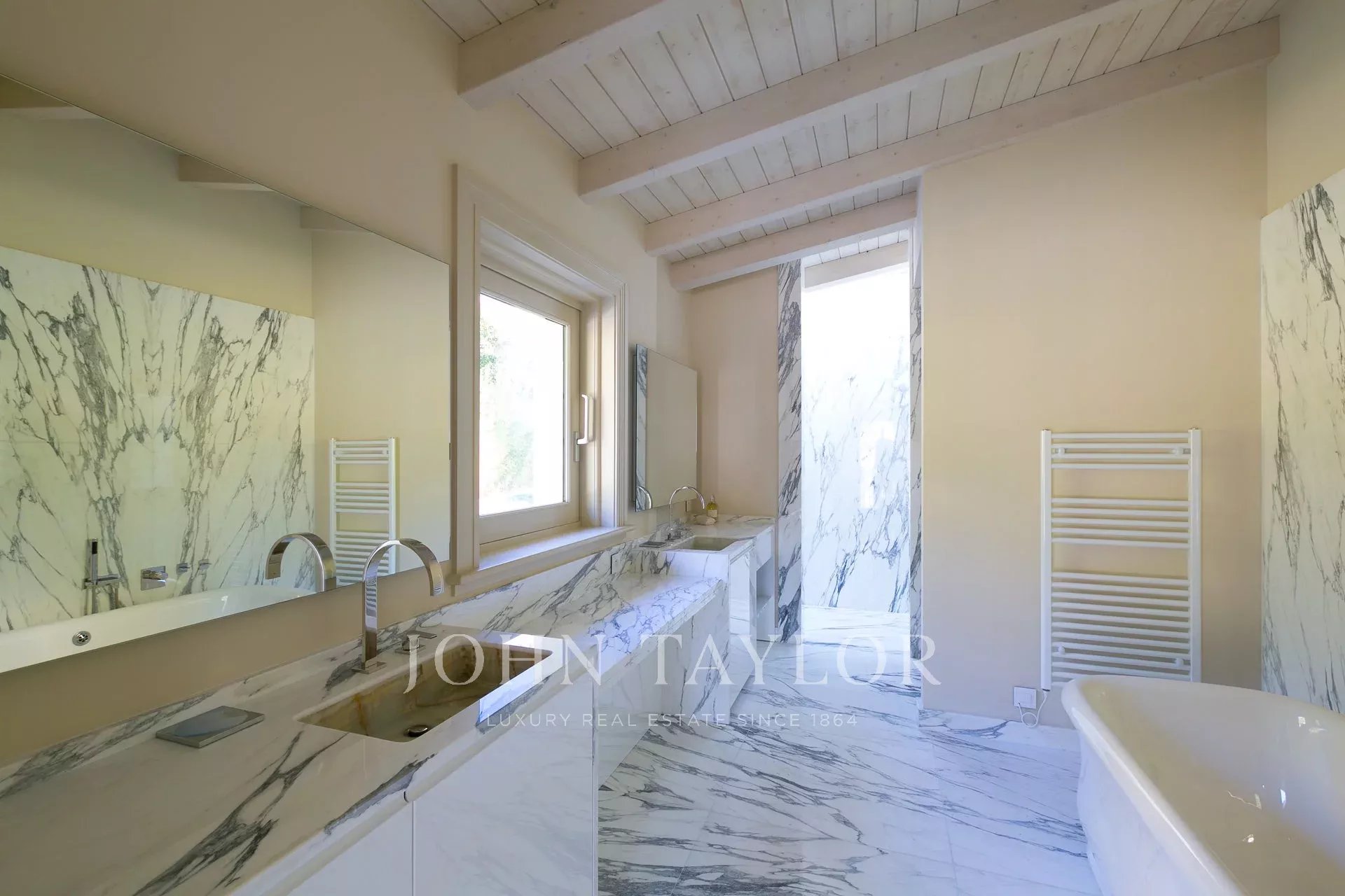 La villa principale, entièrement domotisée, offre un salon / salle à manger / cuisine entièrement équipée Gaggenau, 6 chambres avec salles de bains, salle de fitness, spa avec hammam et salle de massage, salle de cinéma, salle de jeux, cave à vin.