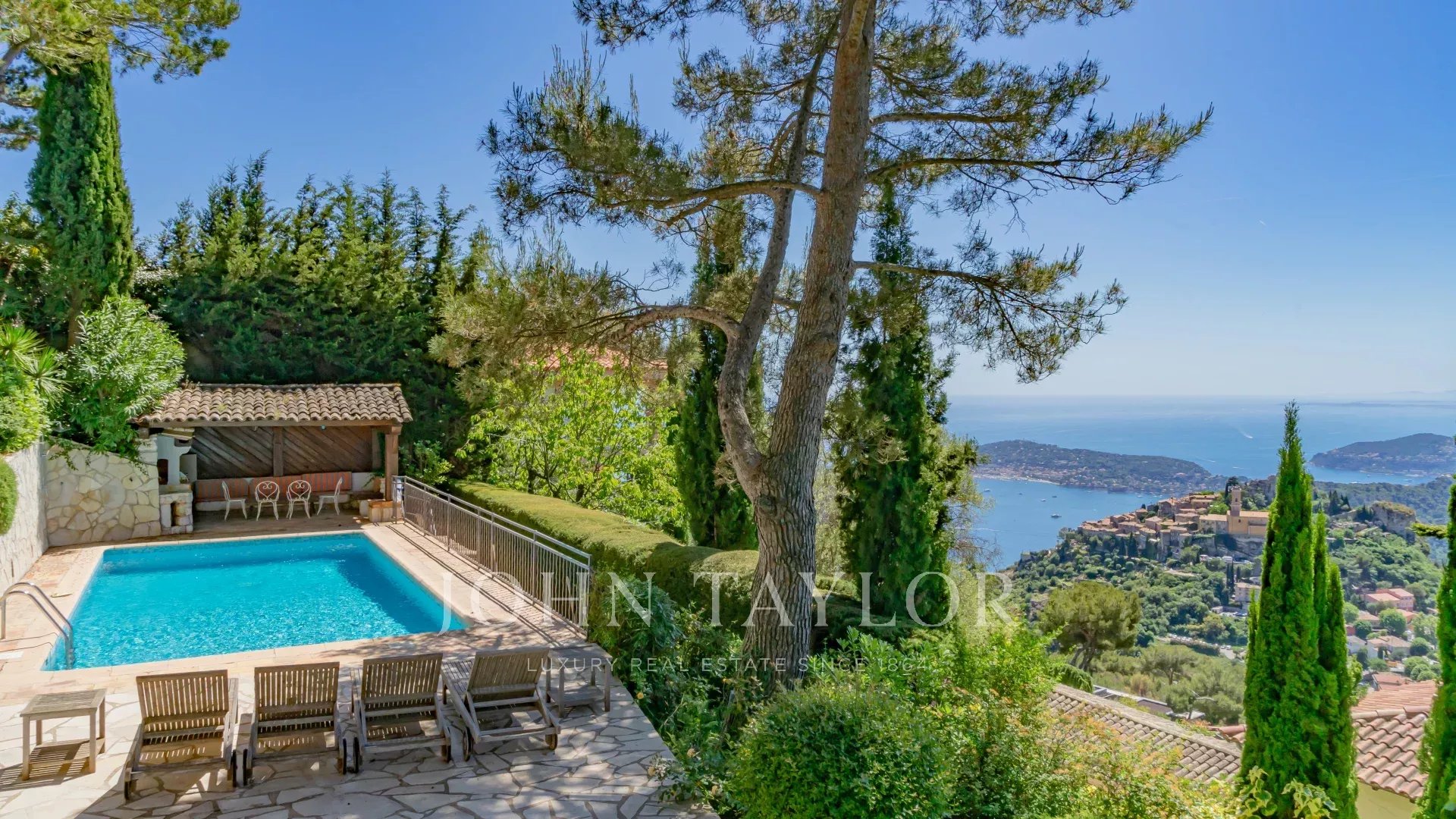 Située sur les hauteurs de Èze, dans un environnement calme, cette villa de 240 m² sur un terrain de 1400 m² offre une superbe vue sur la Mer Méditerranée et sur Eze-Village. Elle dispose également d’une piscine et d’une cuisine d’été, idéale pour profiter pleinement du climat méditerranéen.