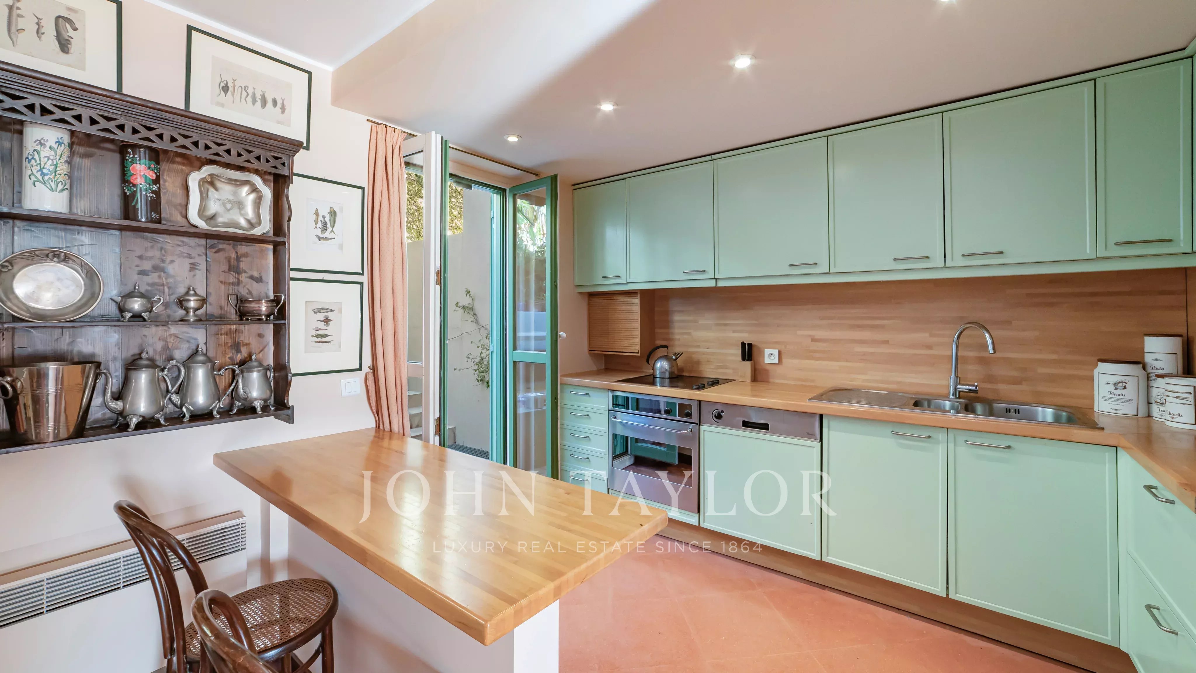 La salle à manger et la cuisine, situées plus en retrait, donnent accès à une seconde terrasse prolongée par un jardinet, offrant un espace extérieur calme et intimiste.