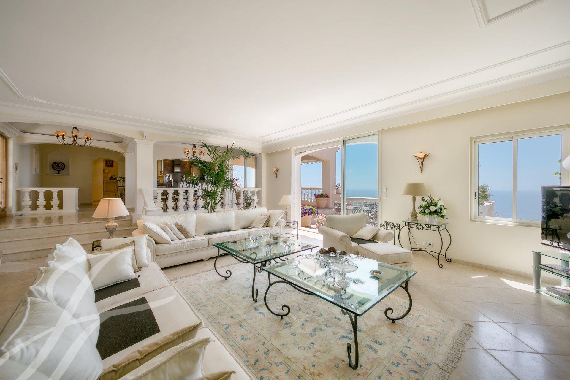 Édifiée sur un terrain arboré d’environ 1 900 m² avec piscine, elle propose un vaste salon/salle à manger, 5 chambres dont une suite parentale, un salon TV et une salle de sport. Toutes les pièces de vie et de nuit sont orientées vers la mer. Espaces de stationnement.