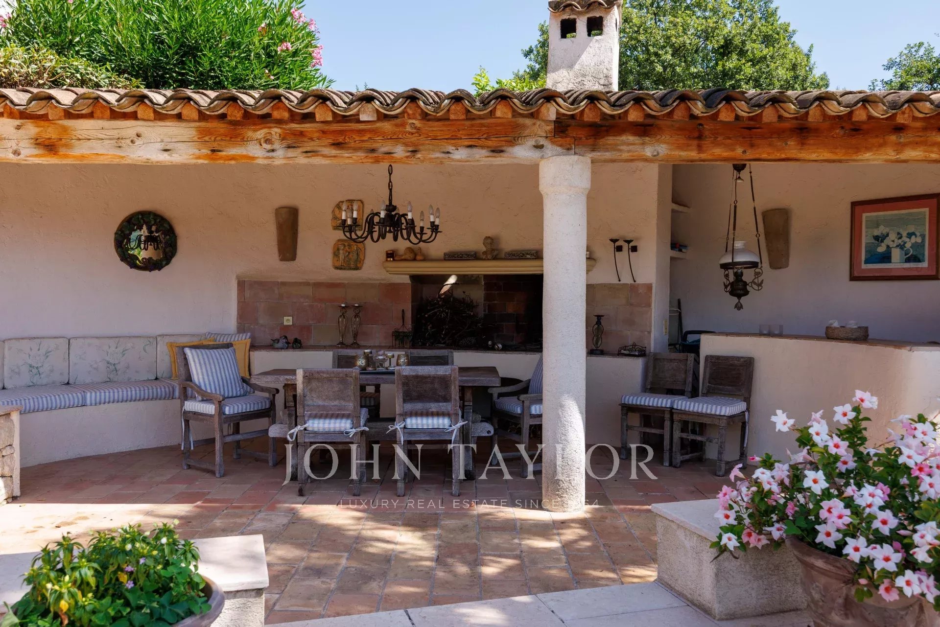Le jardin, majoritairement plat, est magnifiquement paysagé et offre plusieurs espaces de détente et de jeu. Le pool house, proche de la villa, offre un espace abrité du soleil à tout moment et bénéficie de tout le confort requis : barbecue, réfrigérateur, bar et évier.