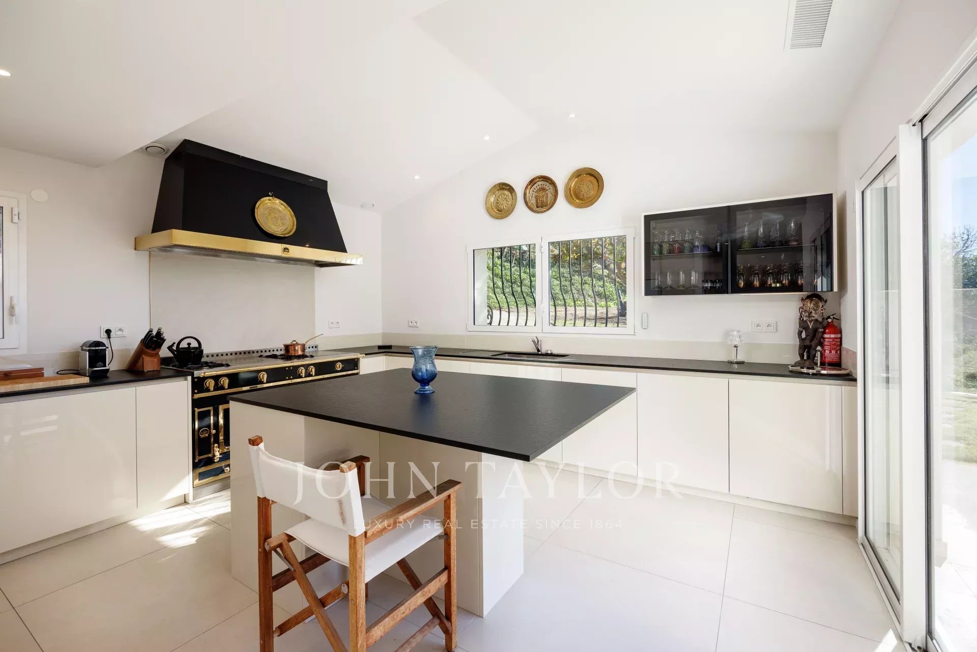Au rez-de-chaussée, on trouve un spacieux salon lumineux avec cheminée et baies vitrées donnant sur une large terrasse offrant une vue sur le village, ainsi qu’une salle à manger, une cuisine et deux suites parentales. Le niveau inférieur accueille une bibliothèque, trois suites avec salle de douche et kitchenettes, une buanderie, une salle de sport, une cave et une pièce pouvant être aménagée en salle de cinéma.