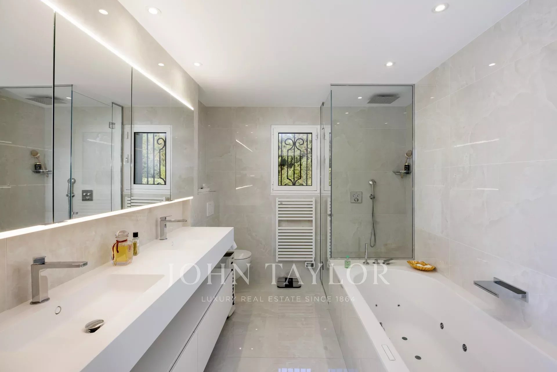 Les prestations sont haut de gamme : ascenseur desservant tous les niveaux et différences de hauteur, climatisation réversible encastrée par pompe à chaleur, chauffage au sol dans toutes les salles de bains, domotique complète, système de sécurité avec caméras et alarme, portail électrique et piscine chauffée par pompe à chaleur.