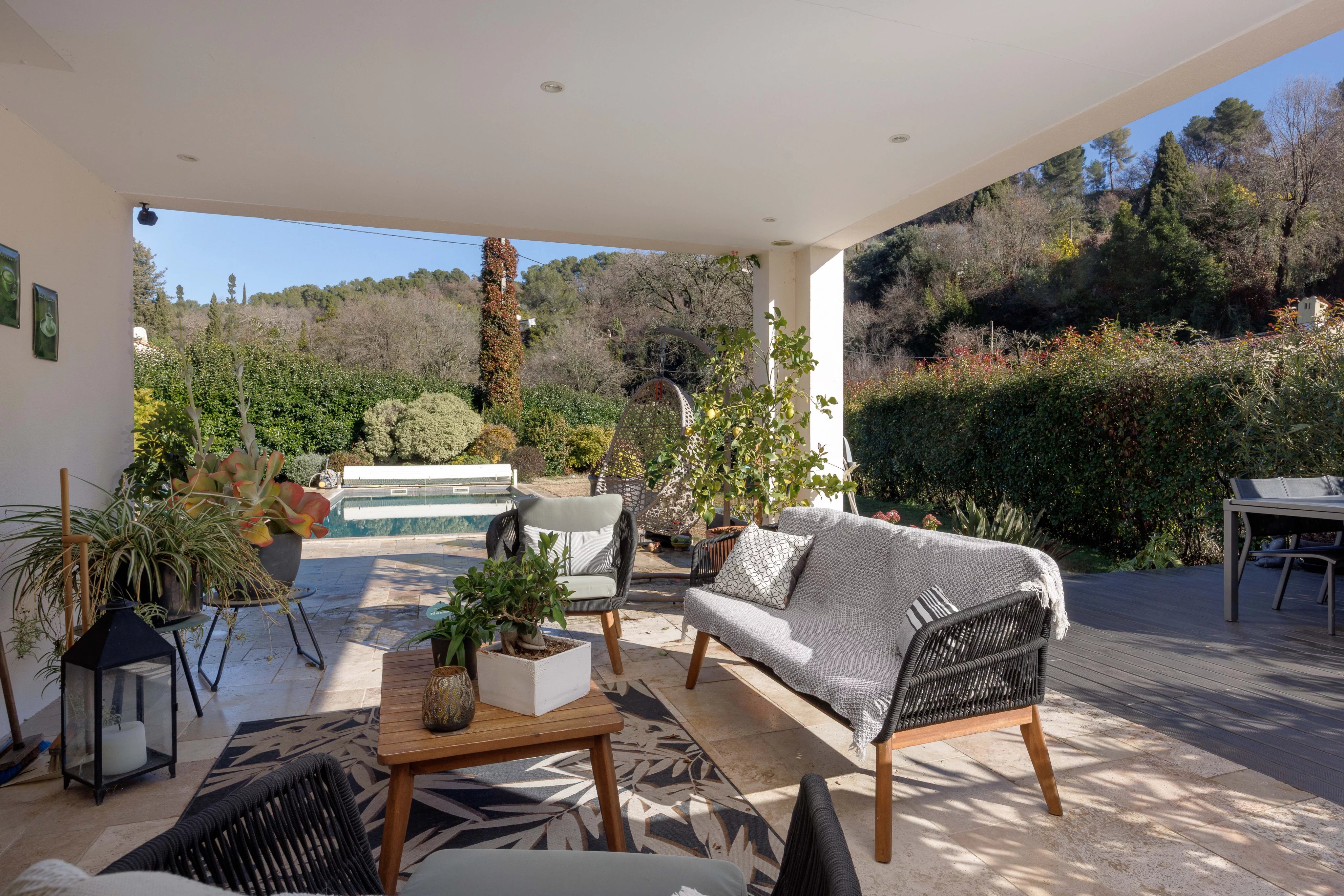 À l’extérieur, le jardin paysager, soigneusement entretenu, accueille une piscine chauffée, sécurisée par un volet roulant.