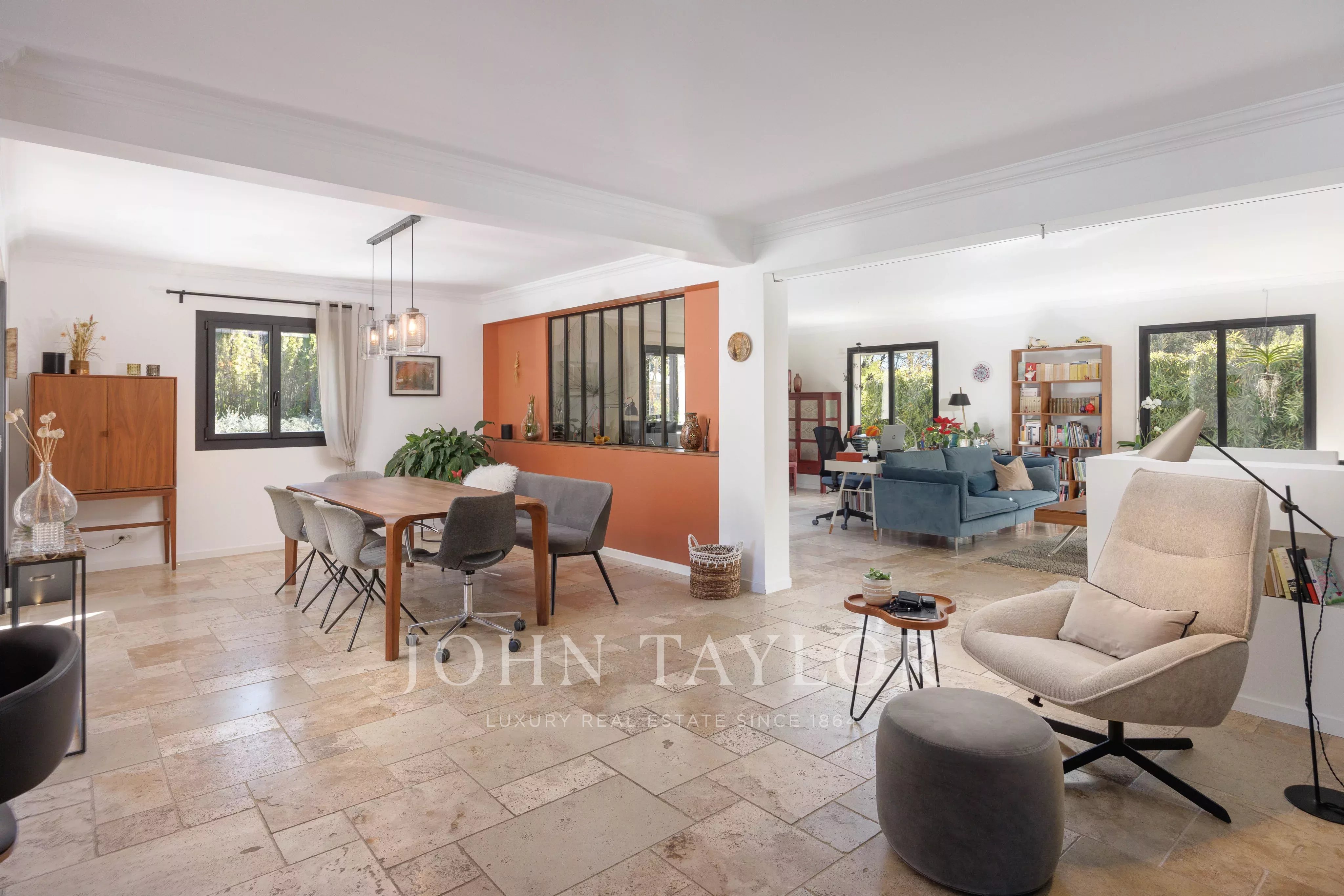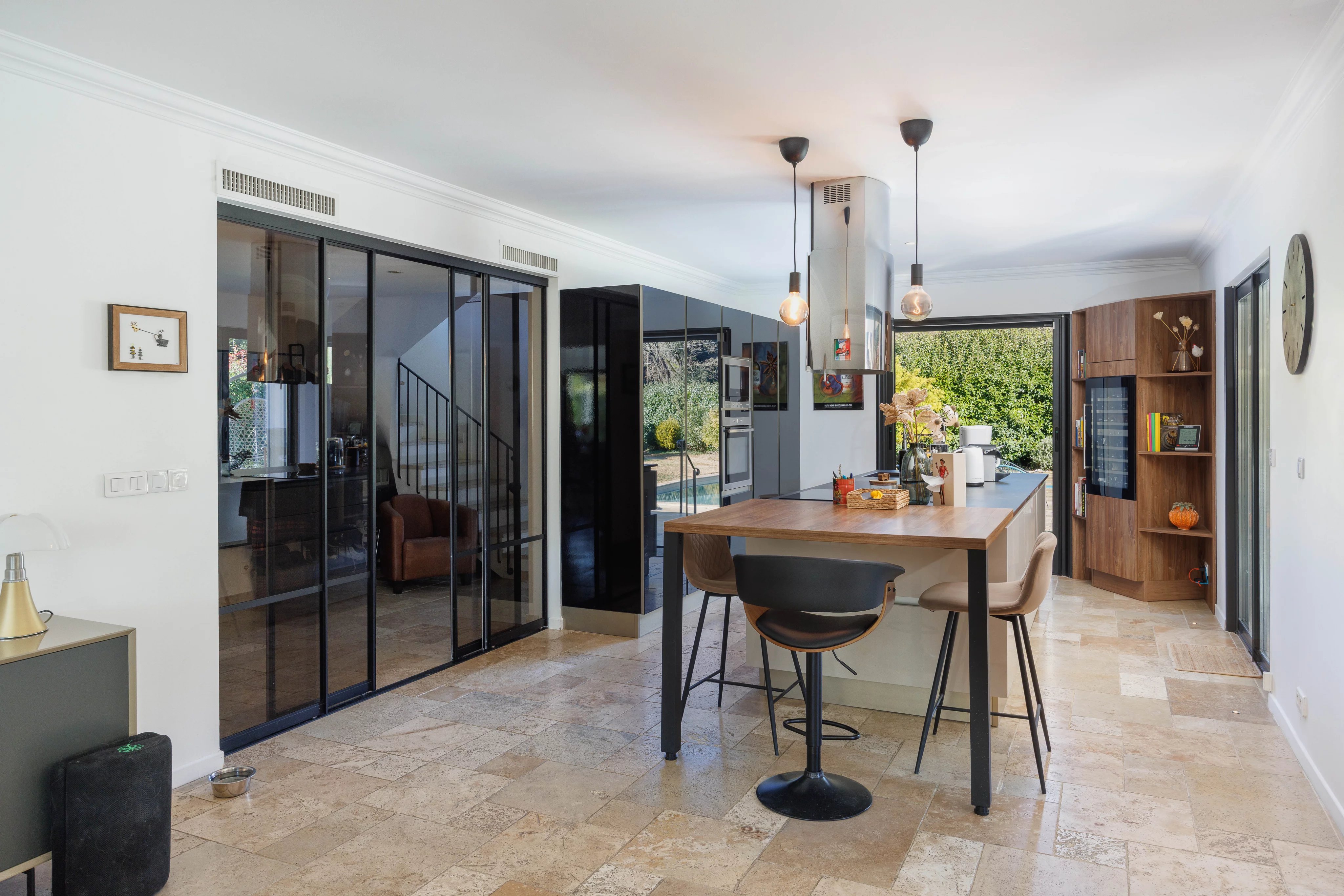 L’entrée s’ouvre sur un vaste espace de vie baigné de lumière, comprenant un séjour et une cuisine ouverte avec îlot central, largement ouverts sur l’extérieur grâce à de grandes baies vitrées à galandage. La salle à manger est élégamment séparée du séjour par une verrière d’atelier, apportant fluidité, perspective et luminosité à l’ensemble.