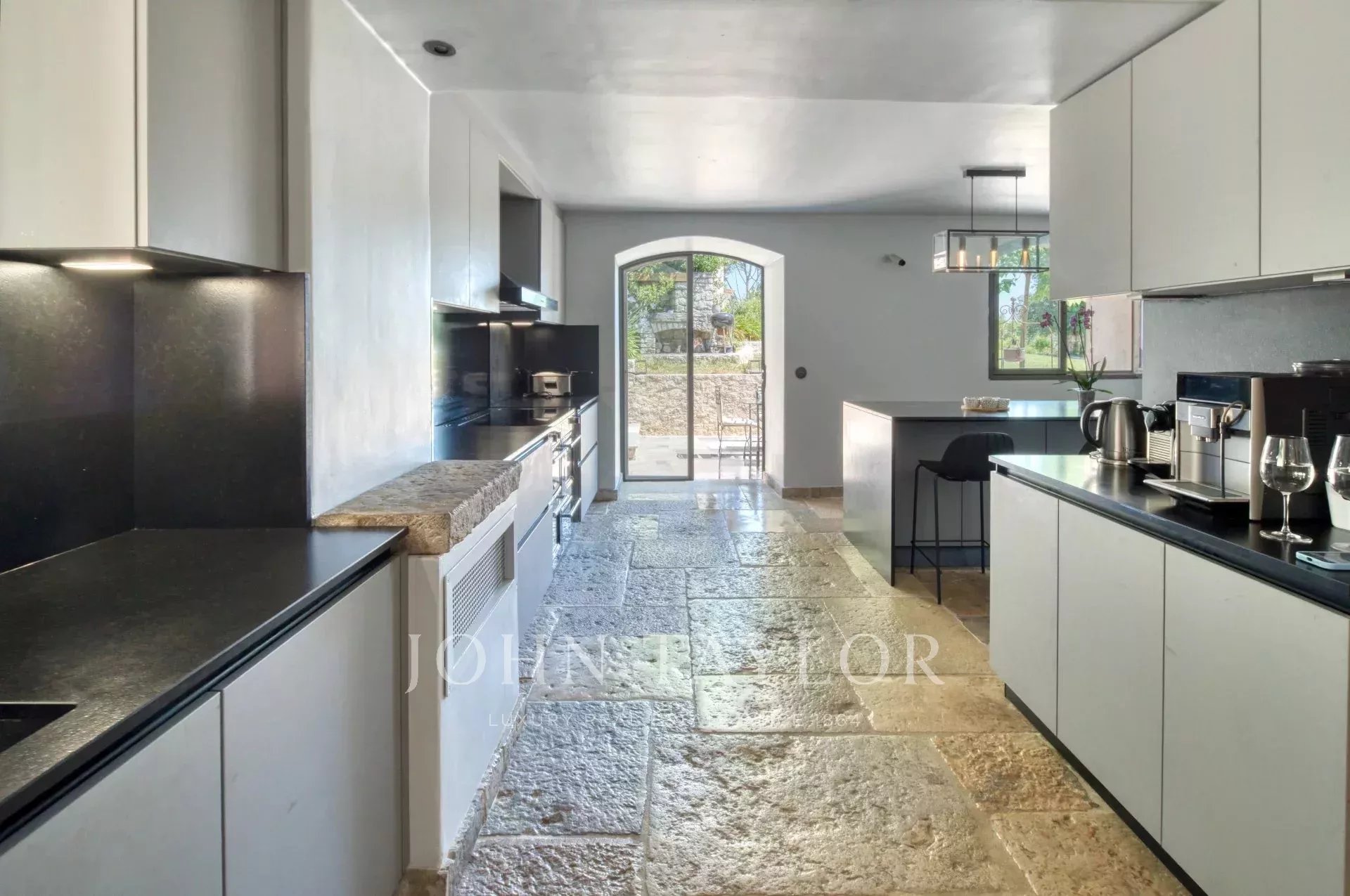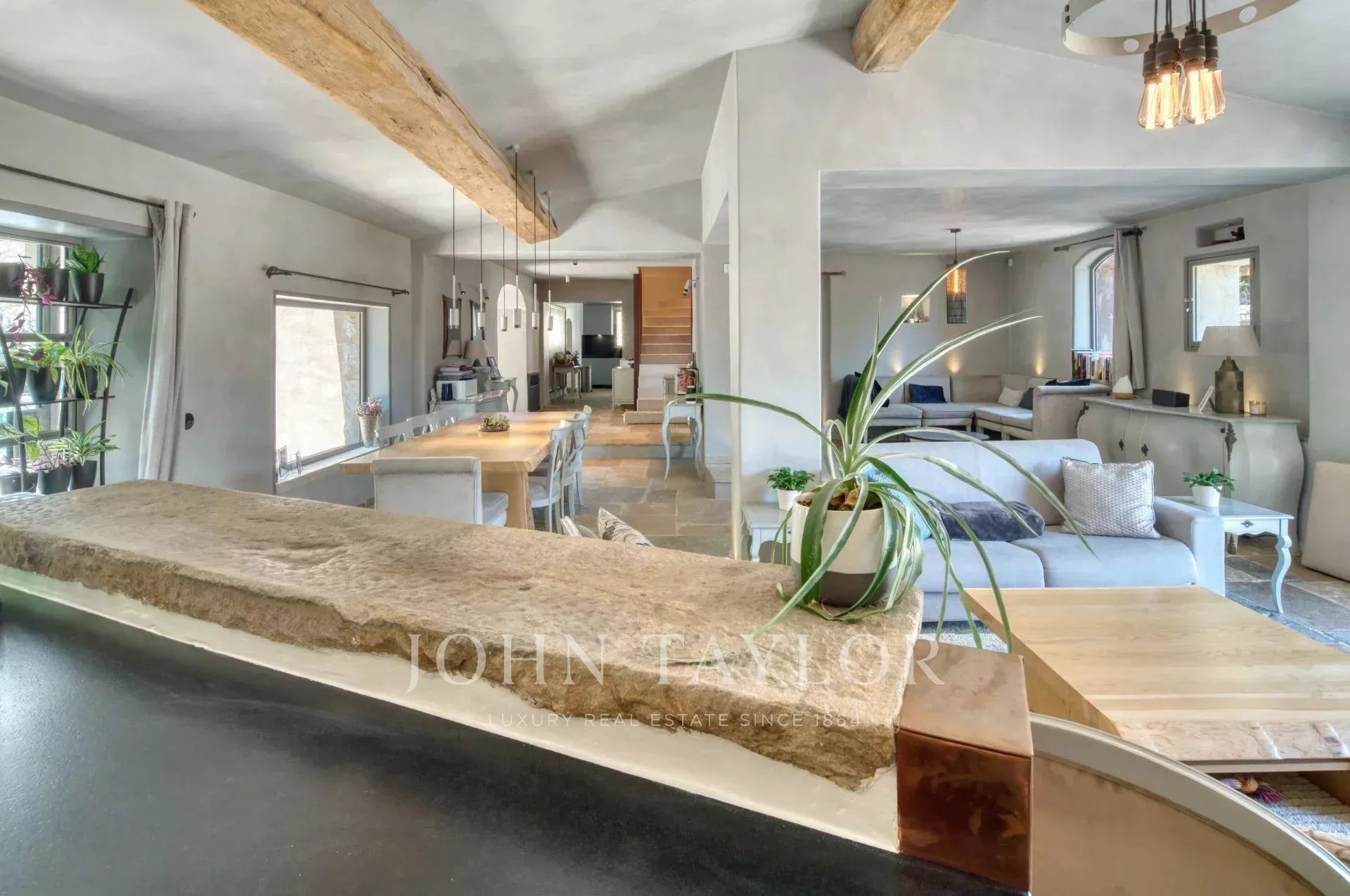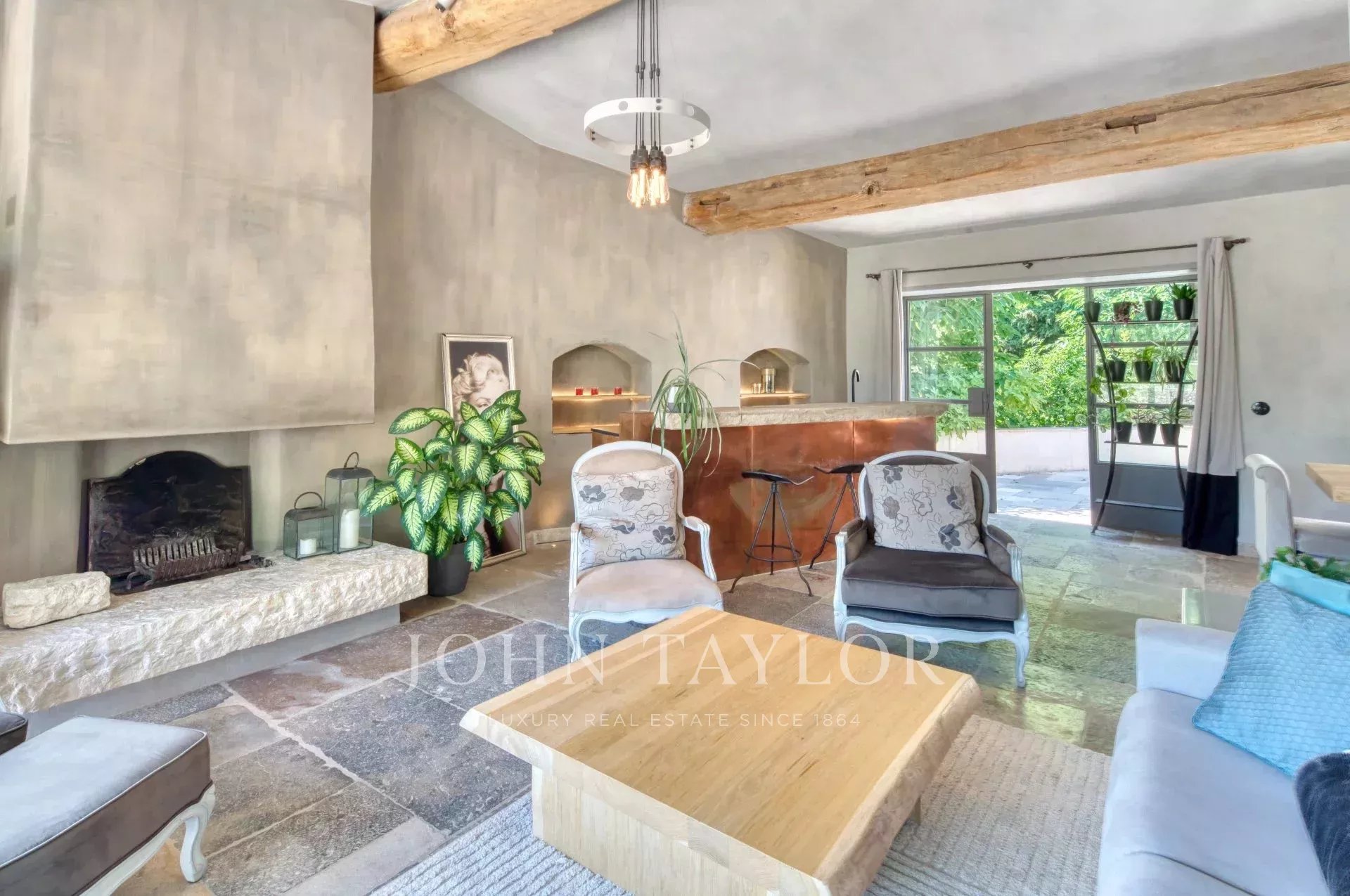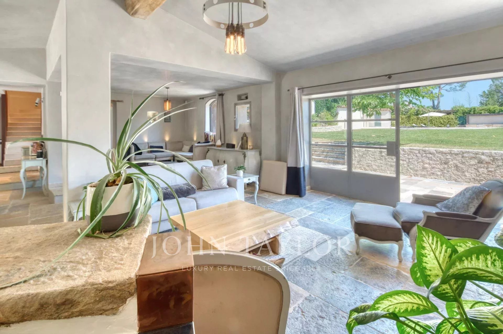 Bastide historique en pierres, située à pied du village de Saint-Paul-de-Vence, entièrement rénovée avec des prestations haut de gamme. Elle offre environ 300 m² habitables sur un jardin plat et paysagé de 2 890 m², alliant charme provençal et confort moderne.