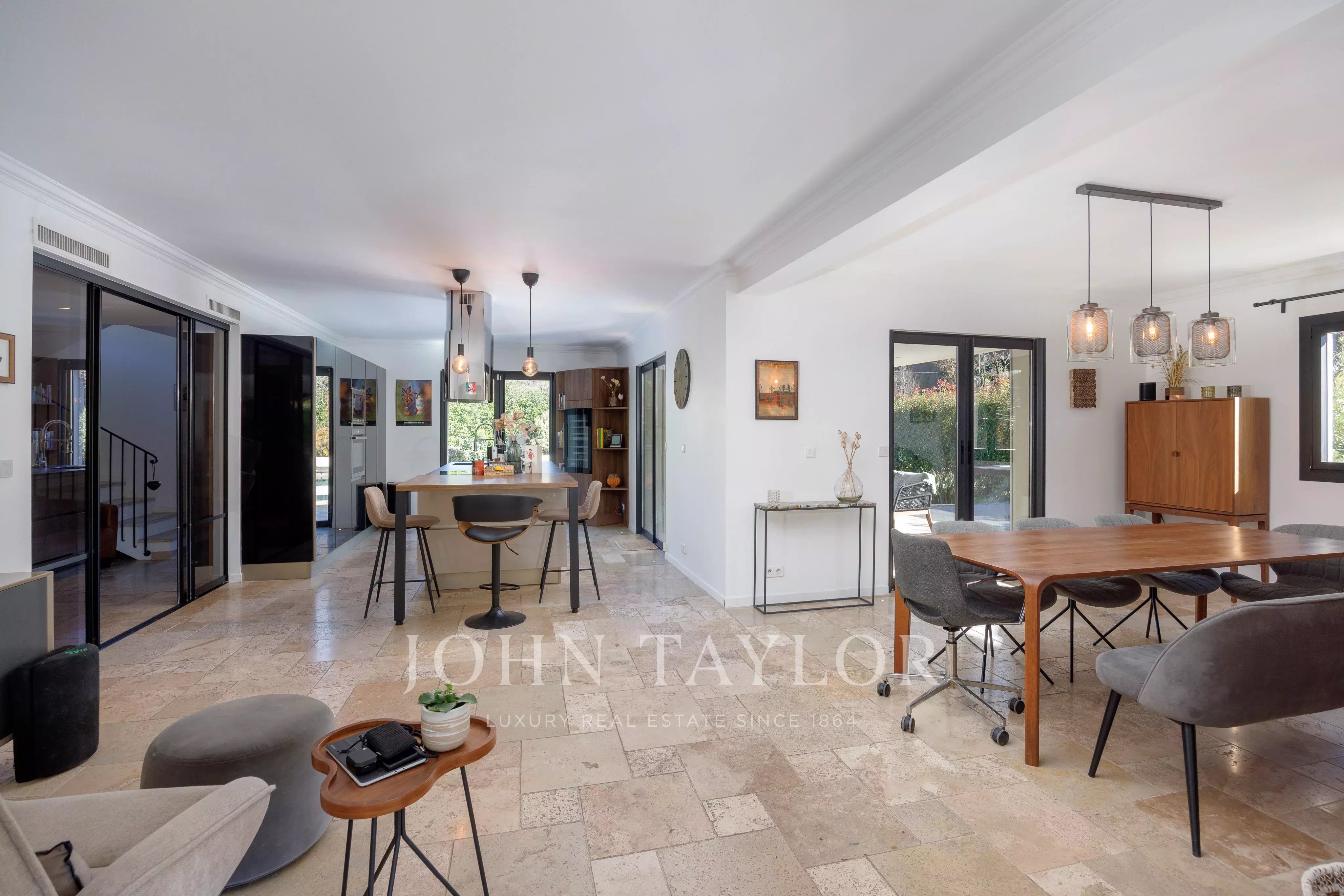 L’entrée s’ouvre sur un vaste espace de vie baigné de lumière, comprenant un séjour et une cuisine ouverte avec îlot central, largement ouverts sur l’extérieur grâce à de grandes baies vitrées à galandage. La salle à manger est élégamment séparée du séjour par une verrière d’atelier, apportant fluidité, perspective et luminosité à l’ensemble.