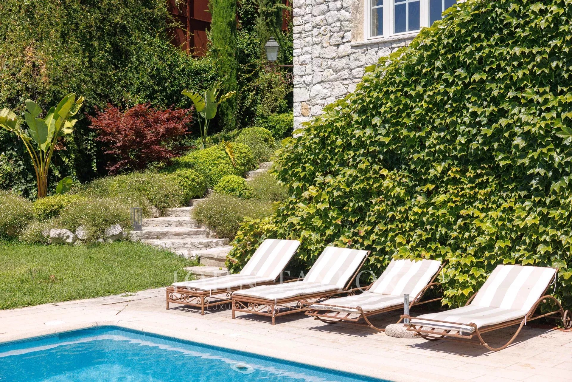 Le jardin a été intégralement dessiné par le célèbre architecte paysagiste Jean Mus et offre plusieurs espaces, notamment une grande court avec abri pour deux véhicules et fontaine, un espace repas connecté à la cuisine avec vue mer Cap d'Antibes, la belle terrasse du séjour et l'espace piscine avec pool house et terrasse, idéal pour la détente et les jeux entre amis et famille !