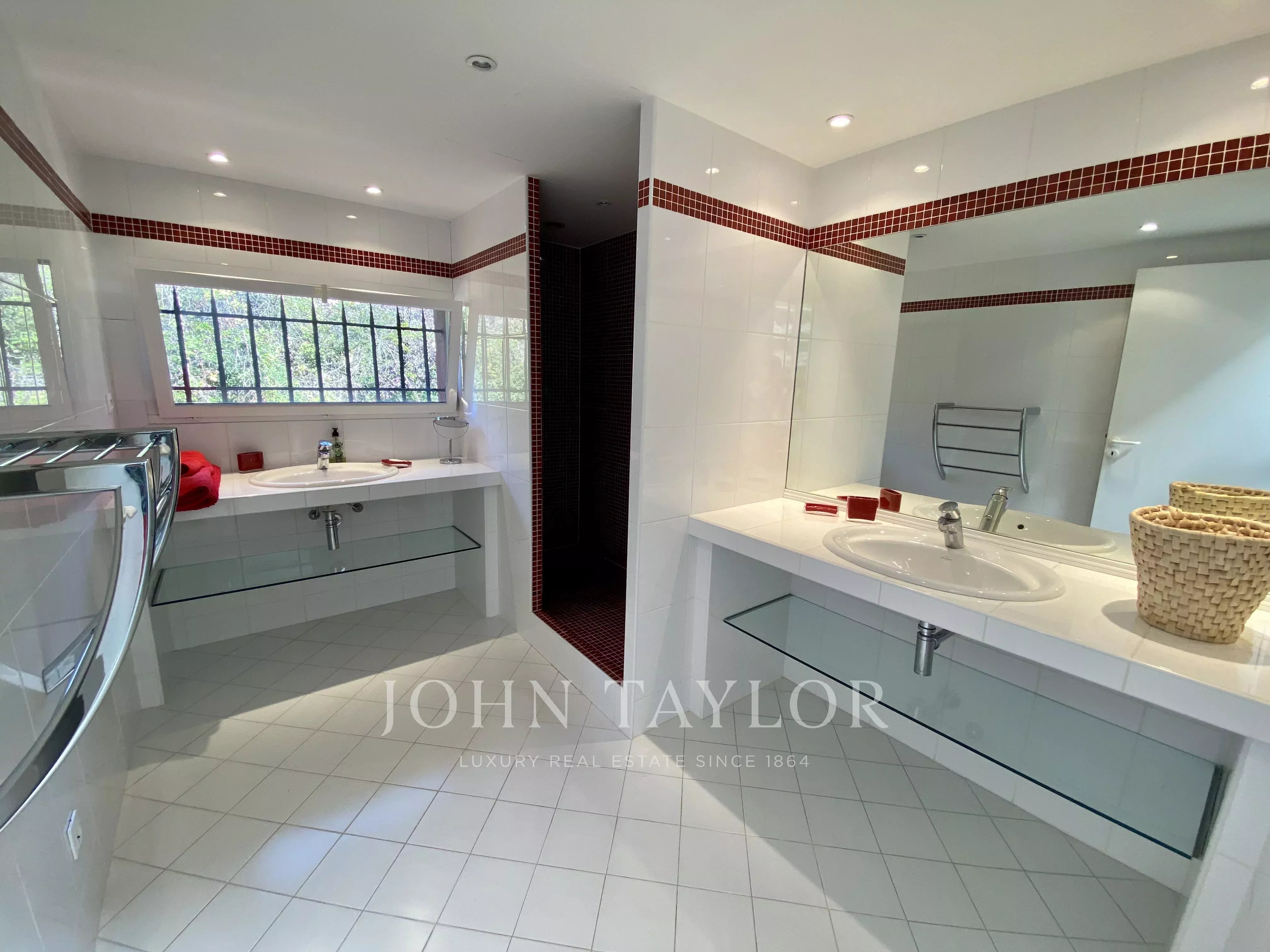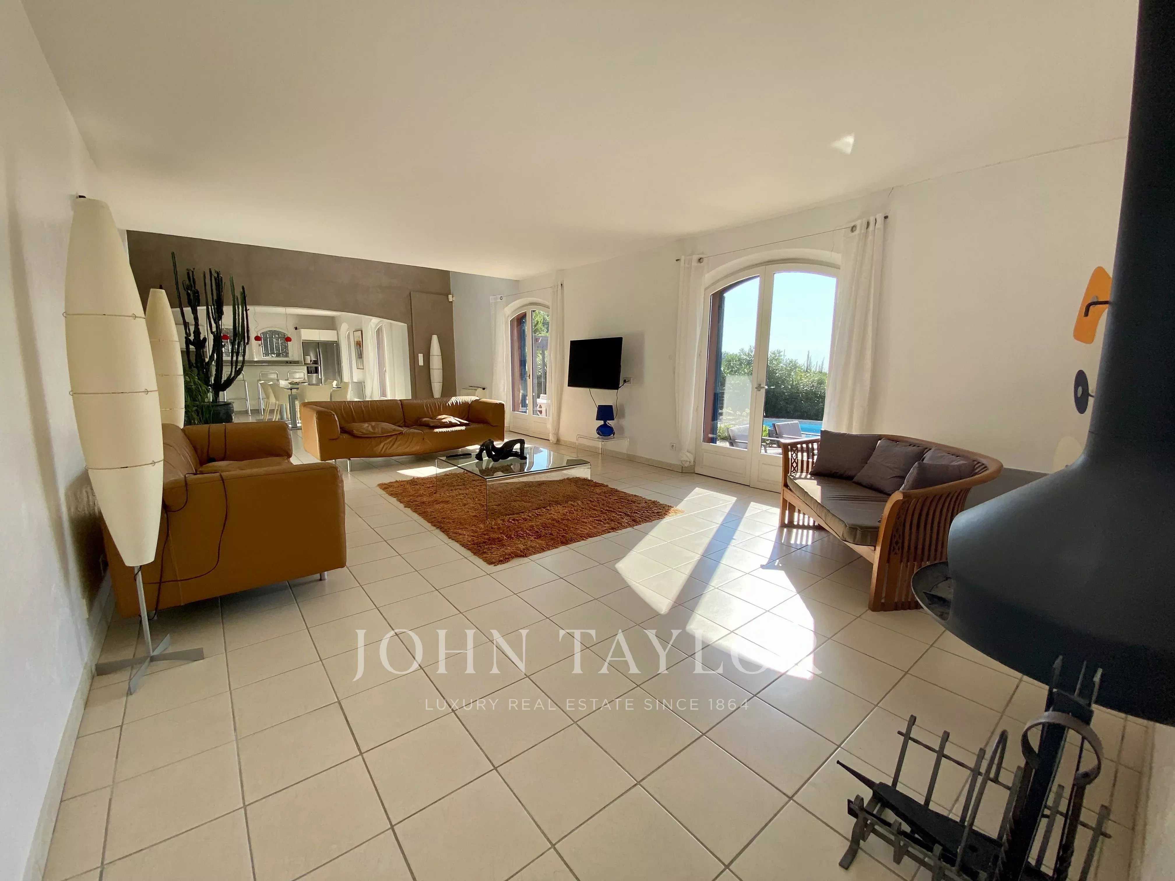Située à quelques centaines de mètres du centre-ville de Vence et bénéficiant d'une vue panoramique sur le Baou et jusqu'à la mer, cette propriété moderne d'environ 230 m2 bénéficie d'un beau jardin plat d'environ 1 700 m2 avec piscine et garage.