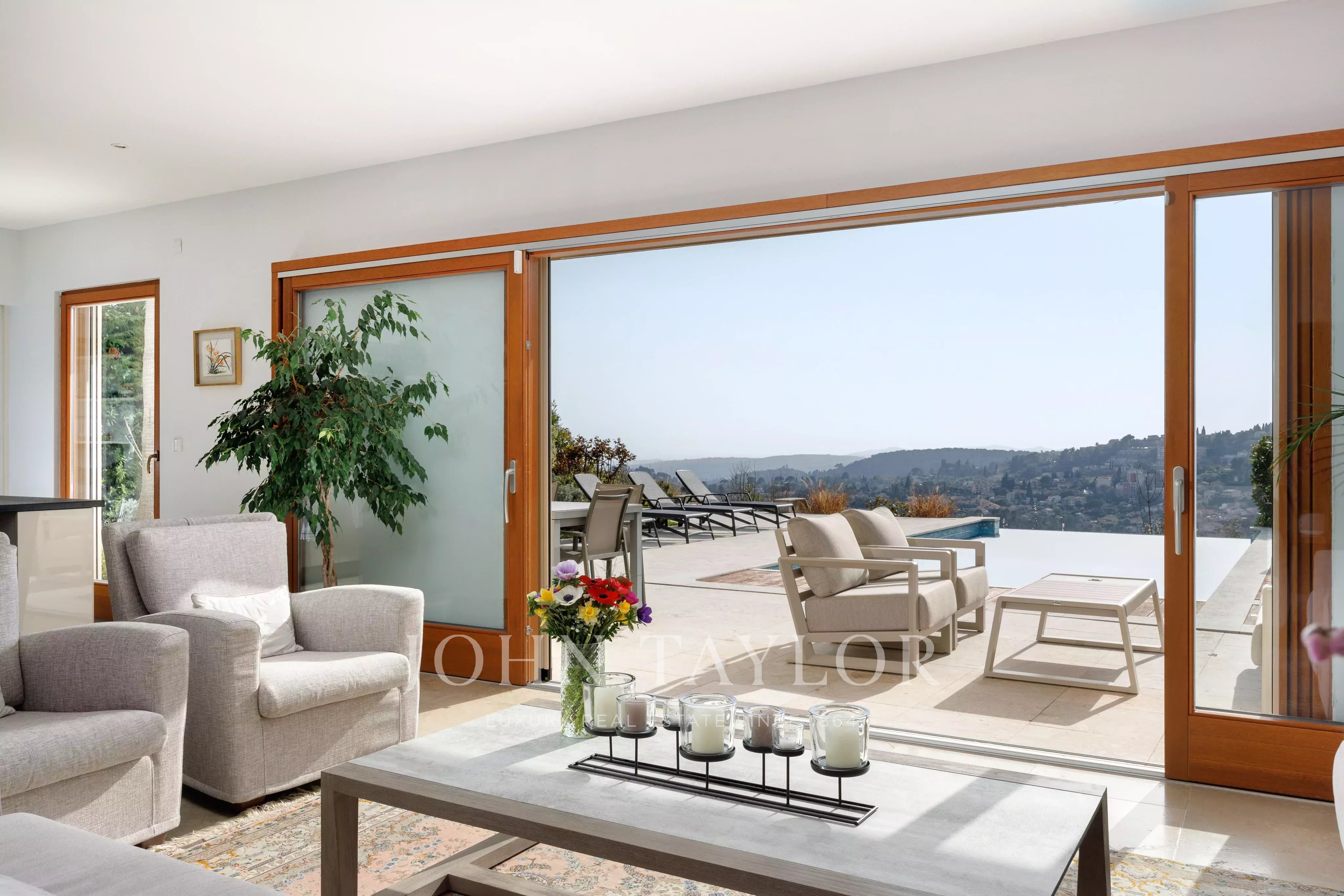Au calme de la campagne Vençoise, à quelques minutes des axes principaux, cette belle propriété contemporaine de 318 m² exposée sud-ouest offre une vue panoramique jusqu’à la mer, le Cap d’Antibes et les villages de Saint-Paul et Vence.