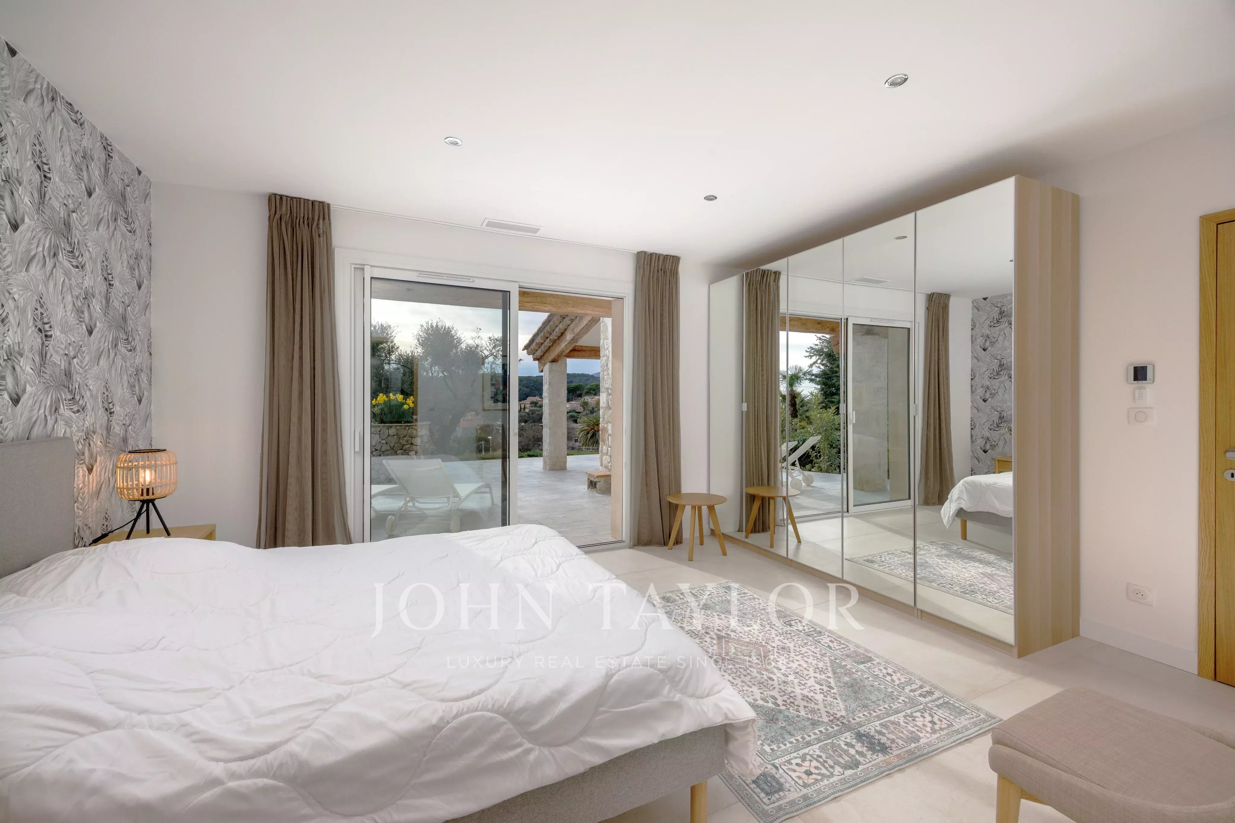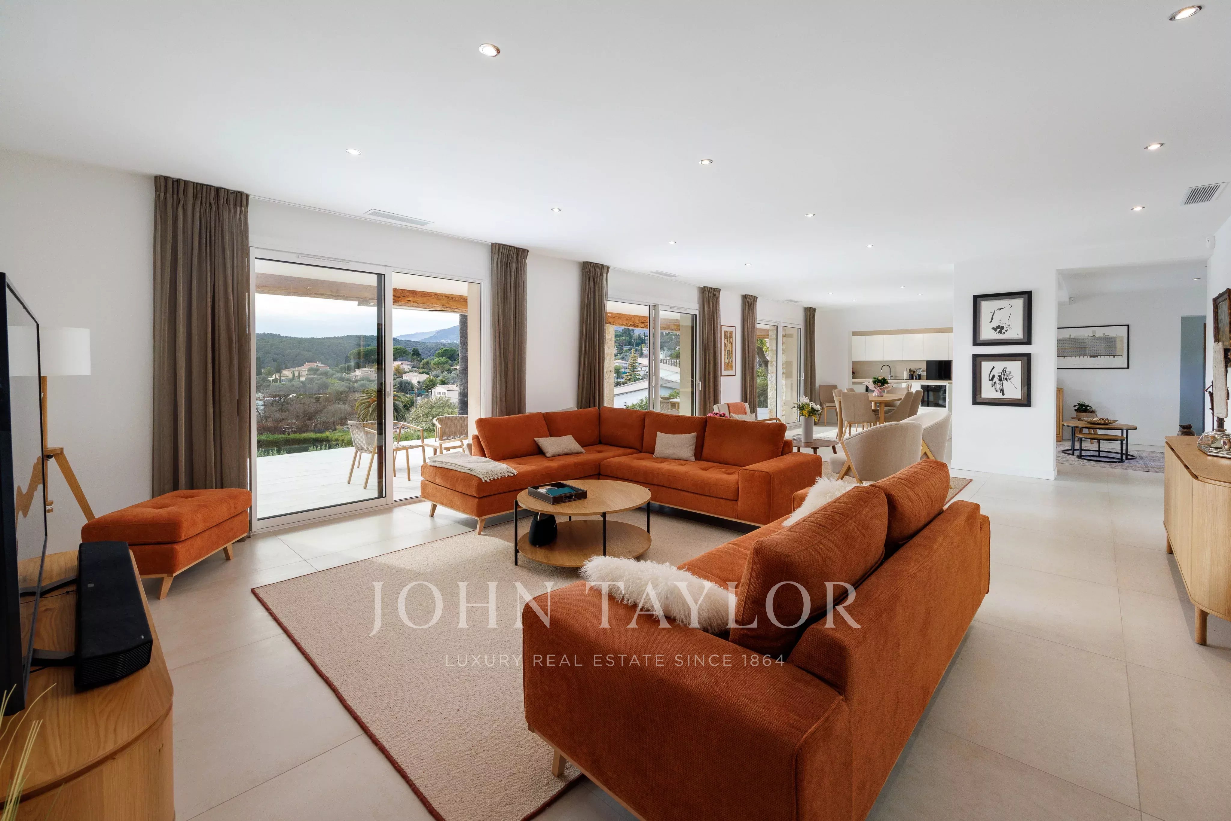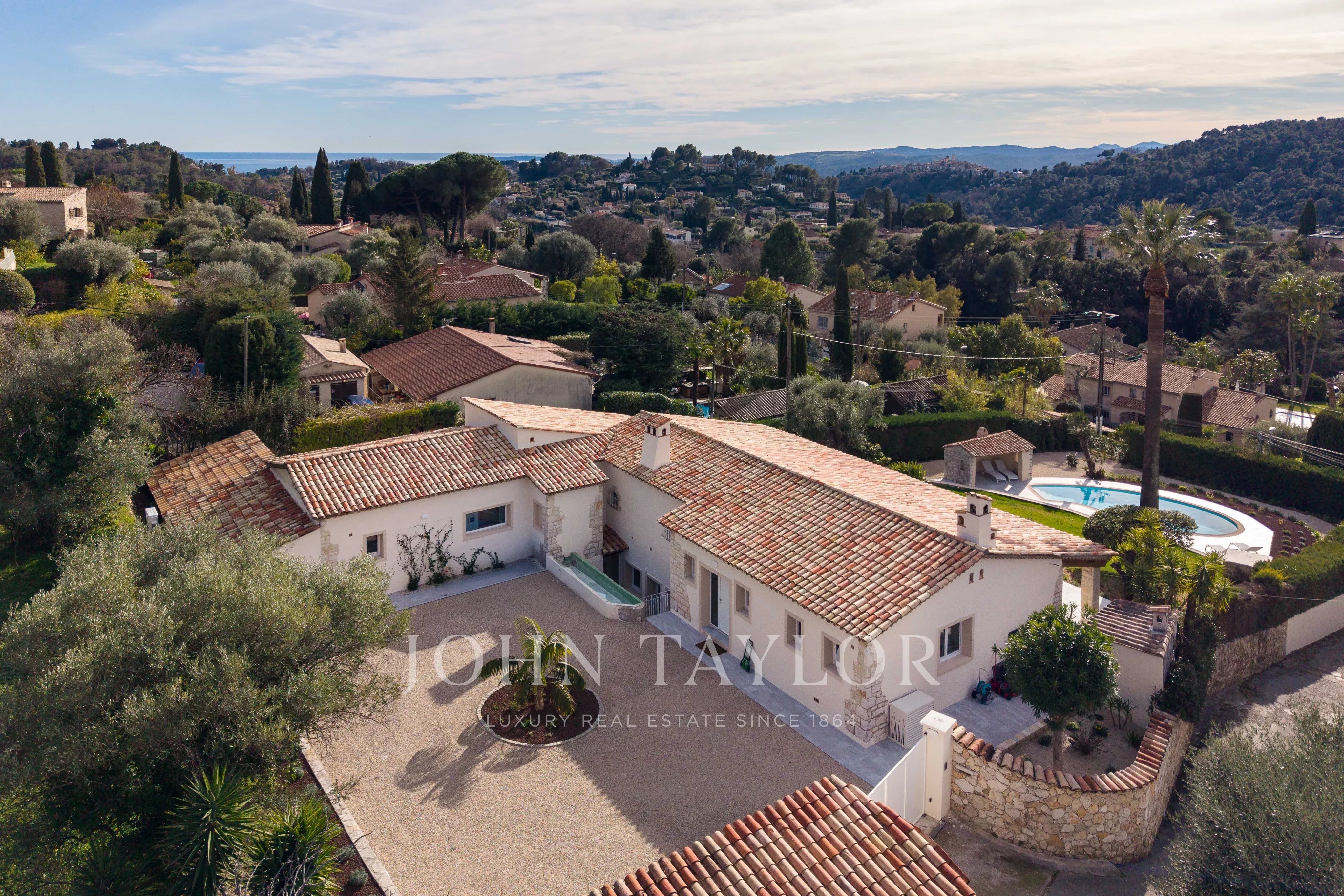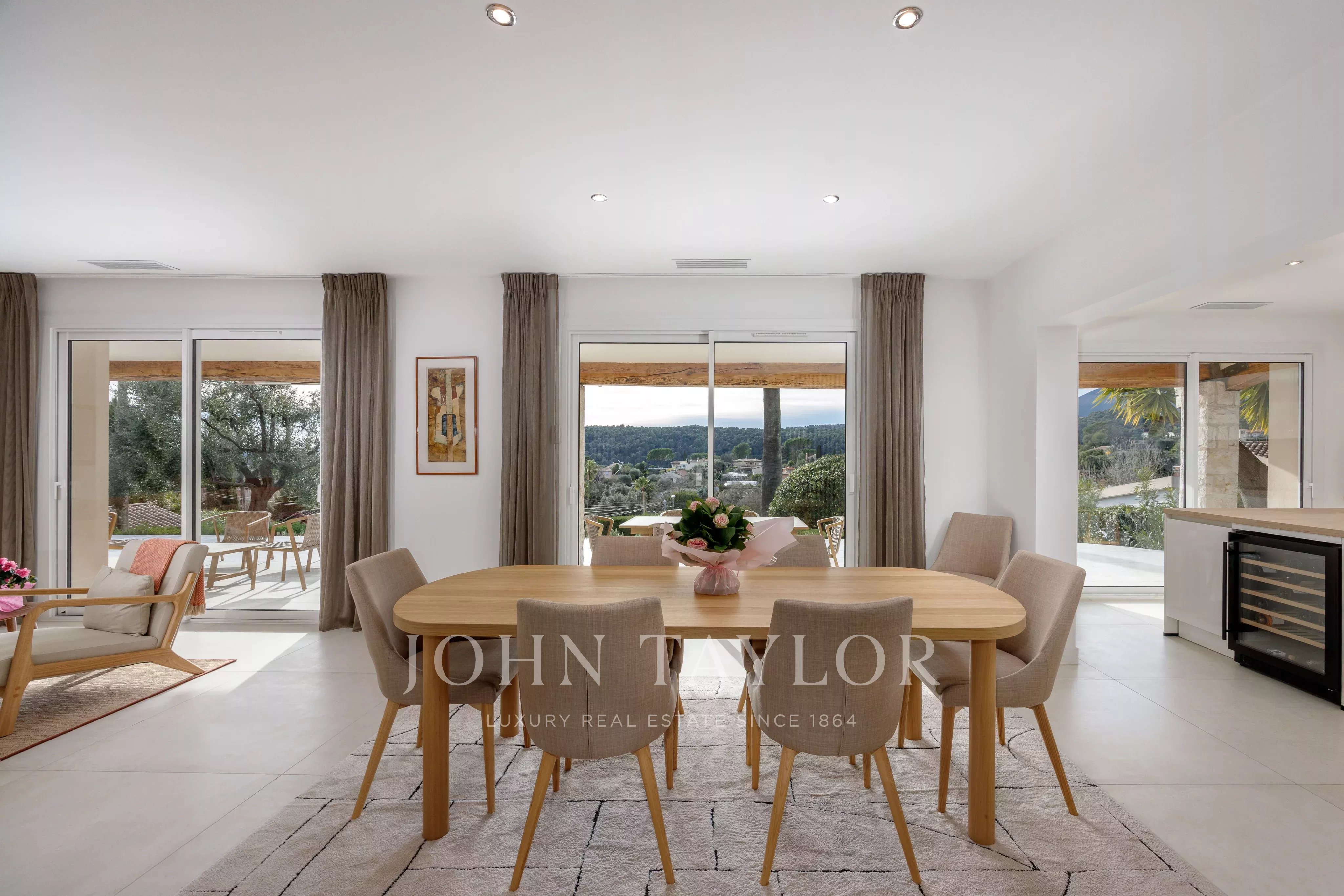 Maison de plain-pied entièrement rénovée, située dans un quartier résidentiel calme avec vue panoramique dégagée sur le village de Saint-Paul-de-Vence, cette propriété d’environ 281 m² se déploie sur un terrain d’environ 2 120 m². Elle comprend six chambres, dont un appartement indépendant de type 3 pièces, une piscine et un abri voitures.