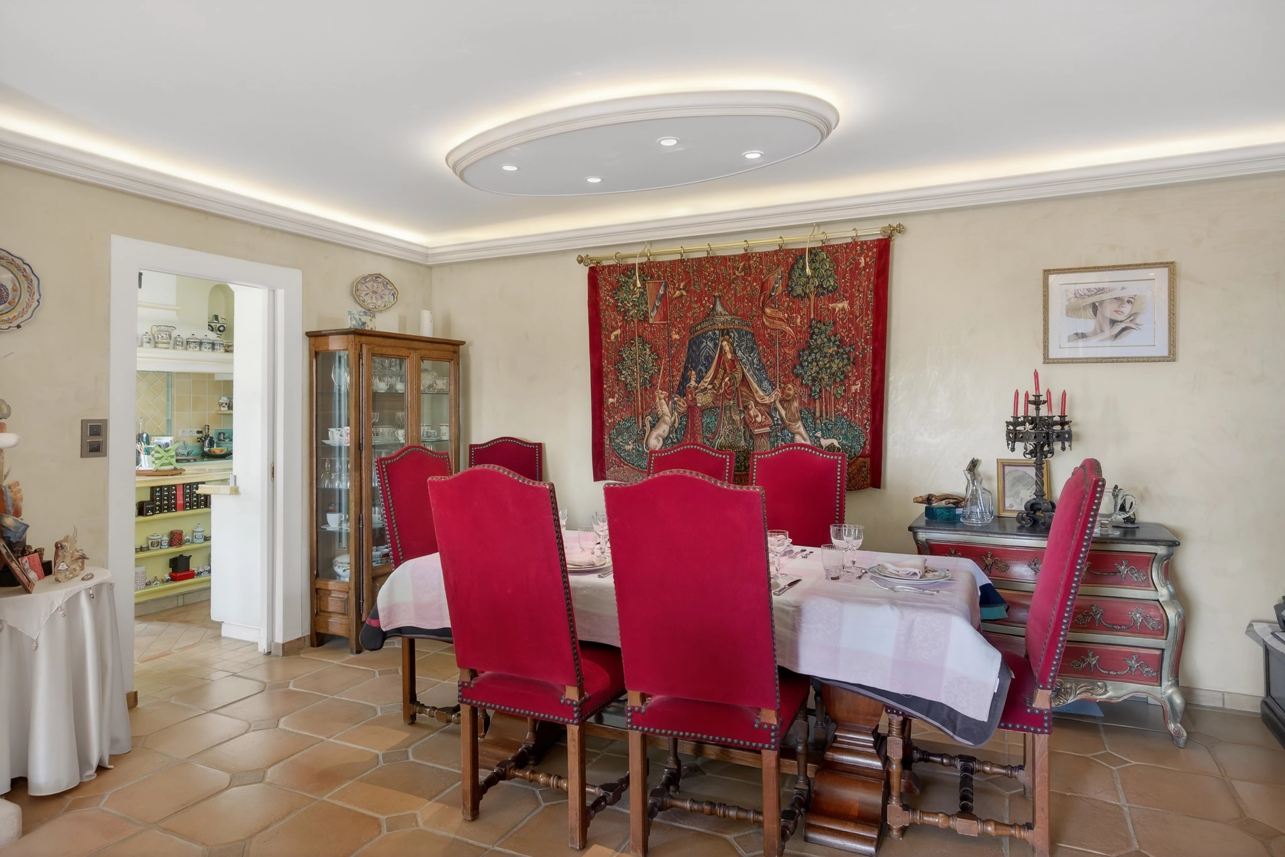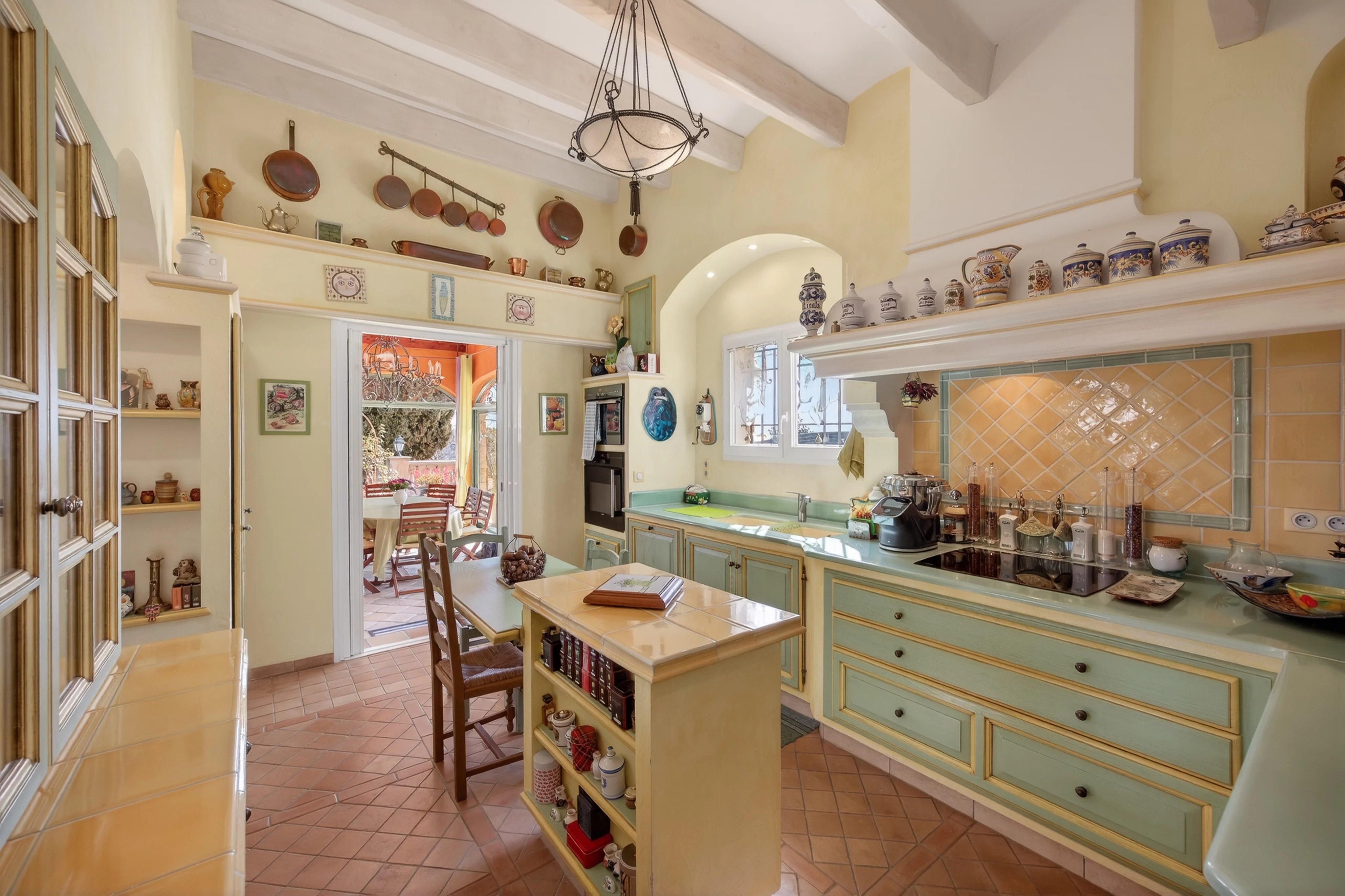 La cuisine indépendante, sublimée par de belles hauteurs sous plafond et des poutres apparentes, se prolonge par une véranda baignée de lumière, orientée Sud-Est, s’ouvrant largement pour devenir un véritable espace de vie aux beaux jours.