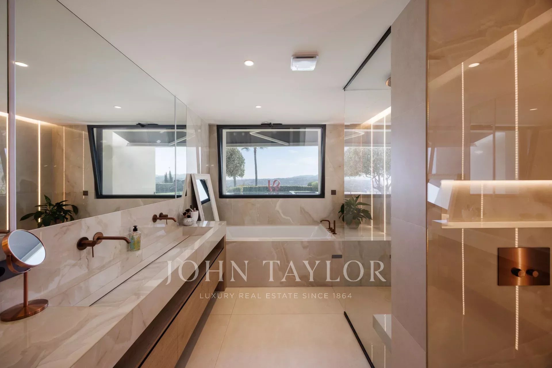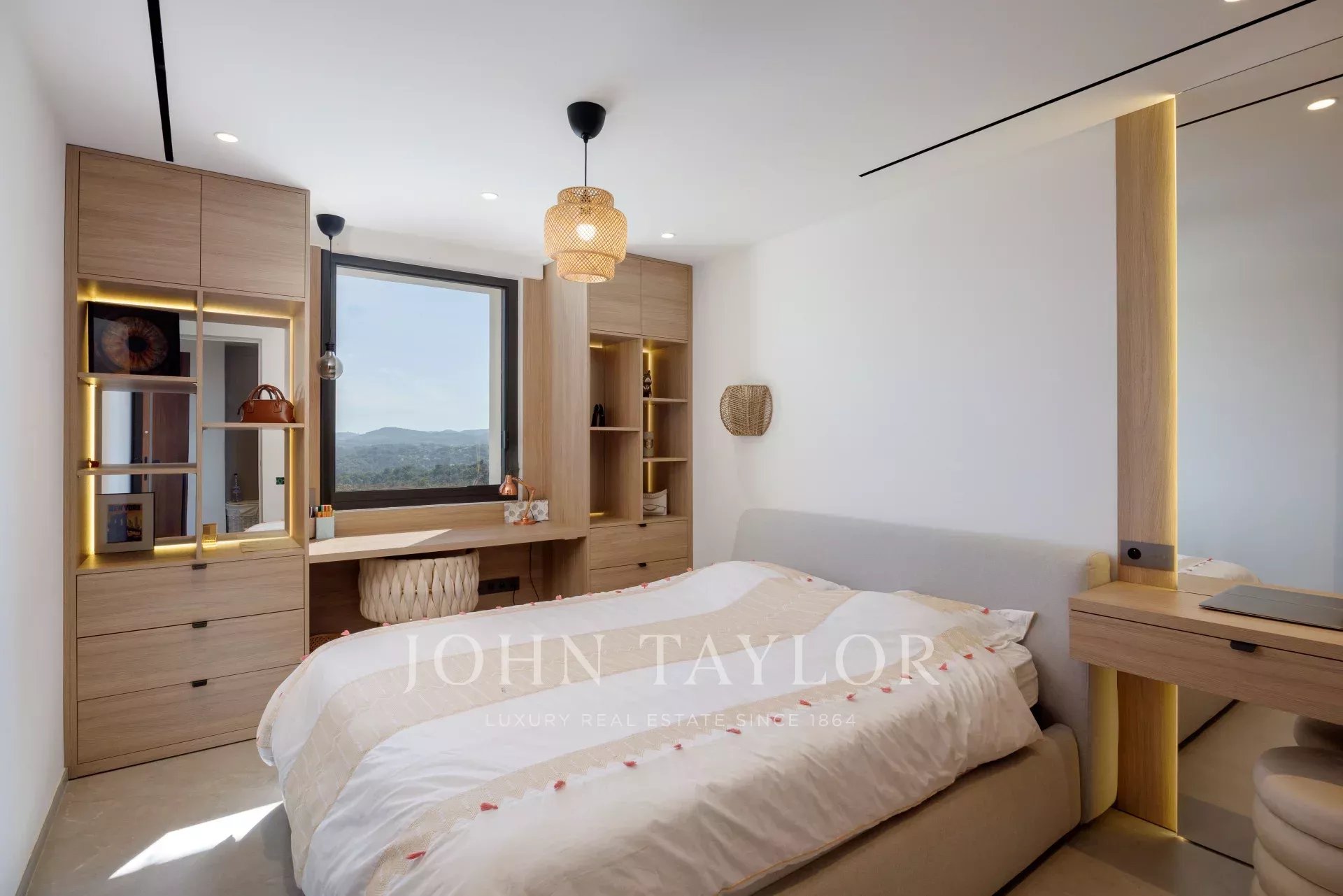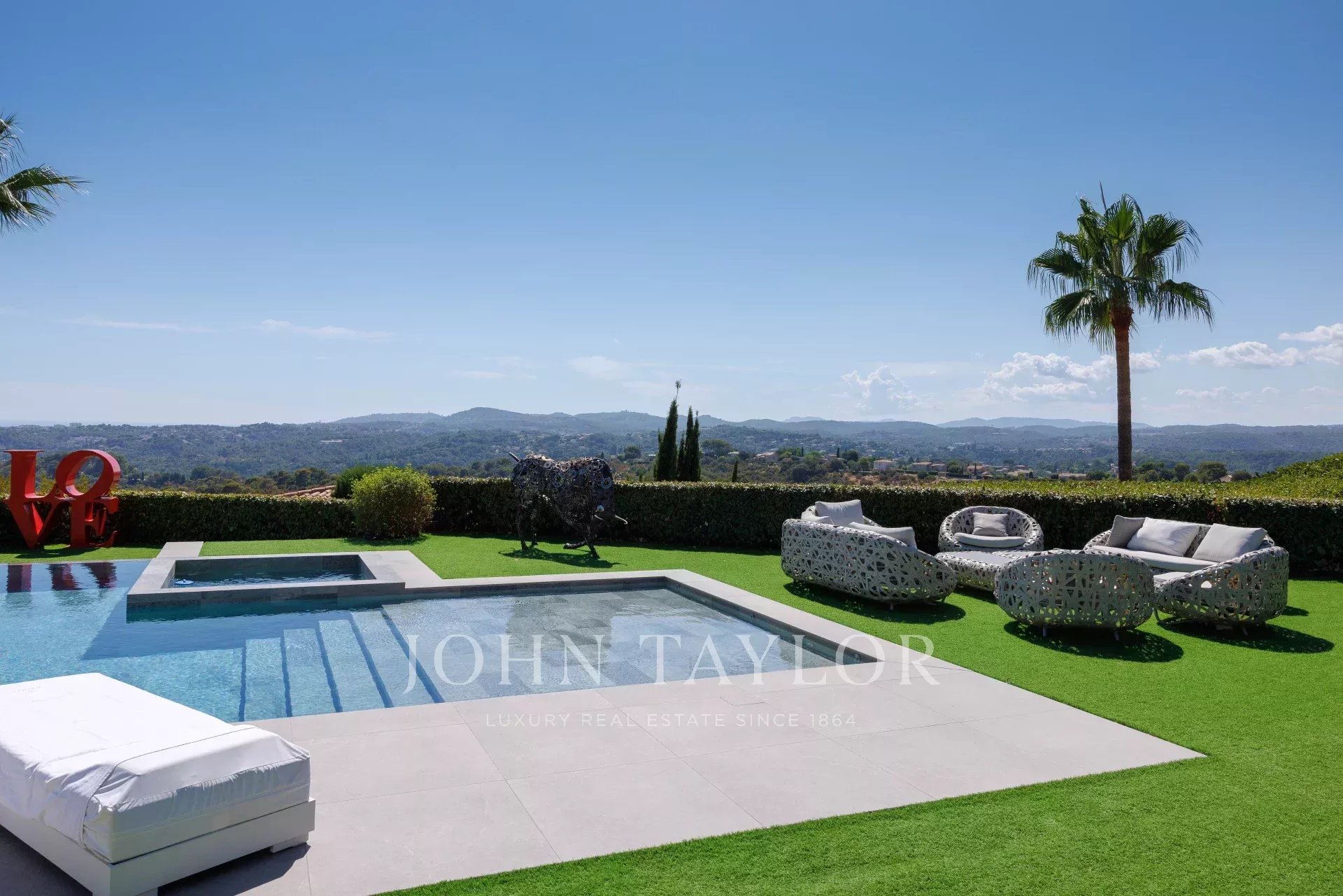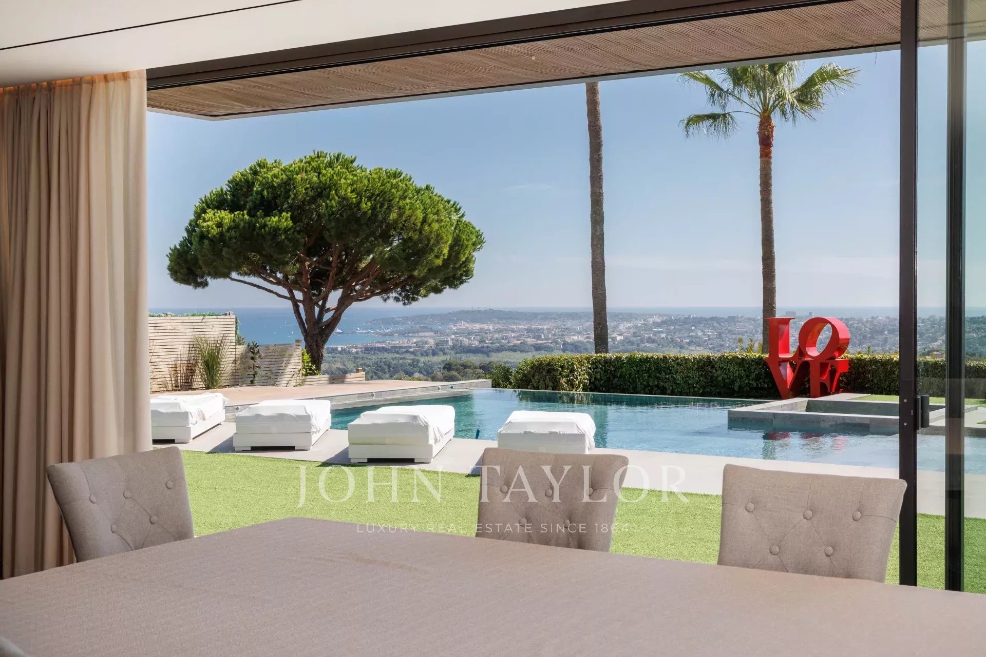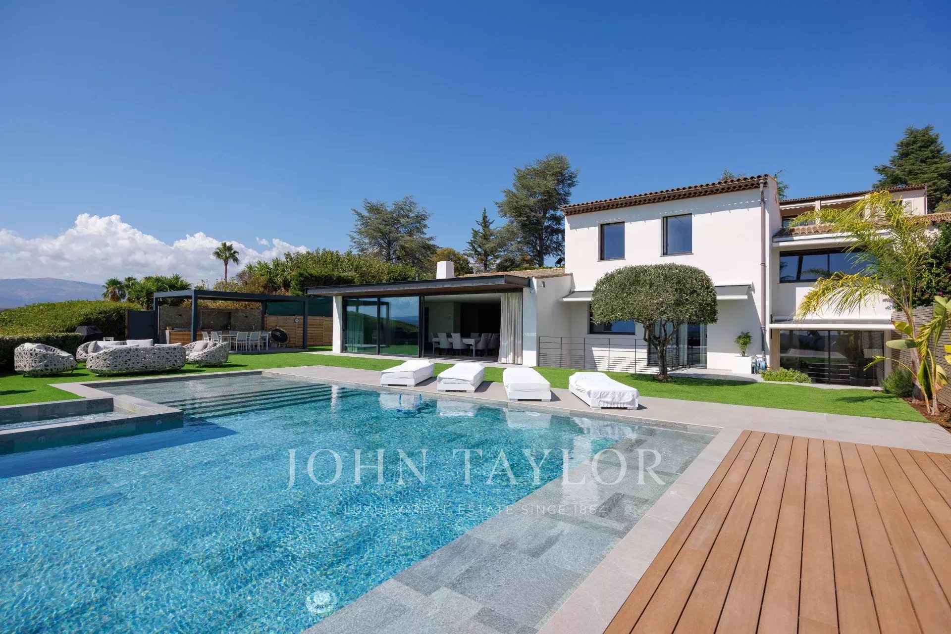 Au sein même de l'un des domaines le plus recherché de la Côte d'Azur, au calme absolu et comme perché sur la colline, cette villa intégralement reconstruite en 2024 de presque 400 m² avec grande piscine et jacuzzi et exposée Sud-Ouest offre un panorama à couper le souffle sur le Cap d'Antibes, la mer et les collines environnantes.
