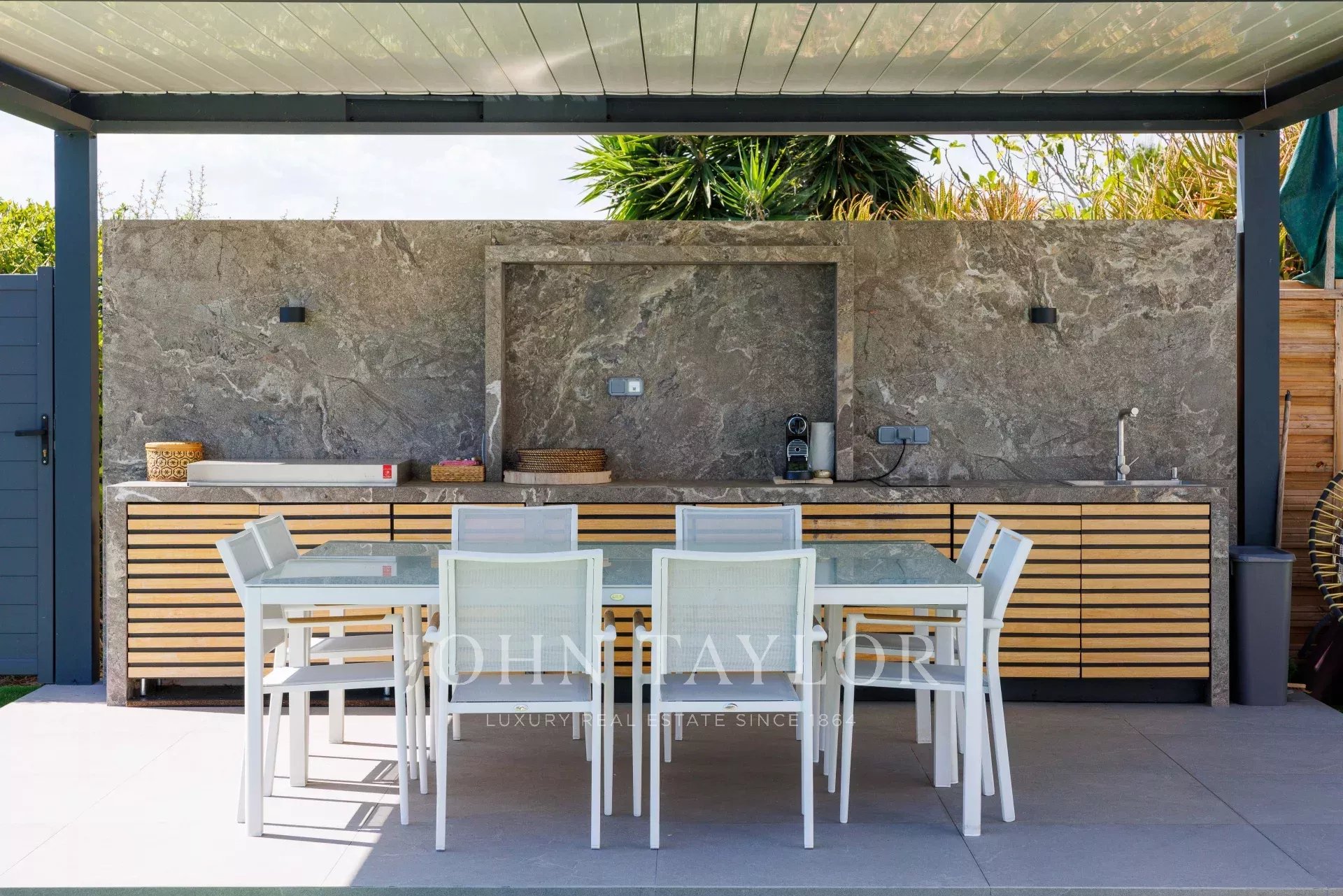 Le jardin est idéalement plat et offre une espace vert autour de la piscine et du jacuzzi, un espace cuisine d'été intégralement équipée et couvert ainsi que d'un espace ping pong, idéal pour les plus jeunes de la famille !