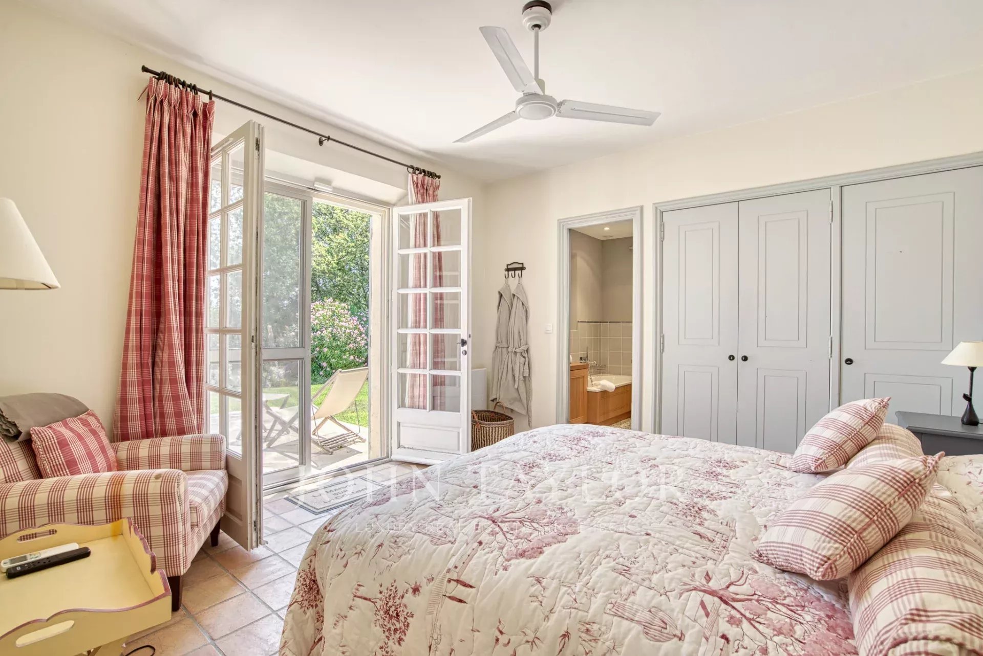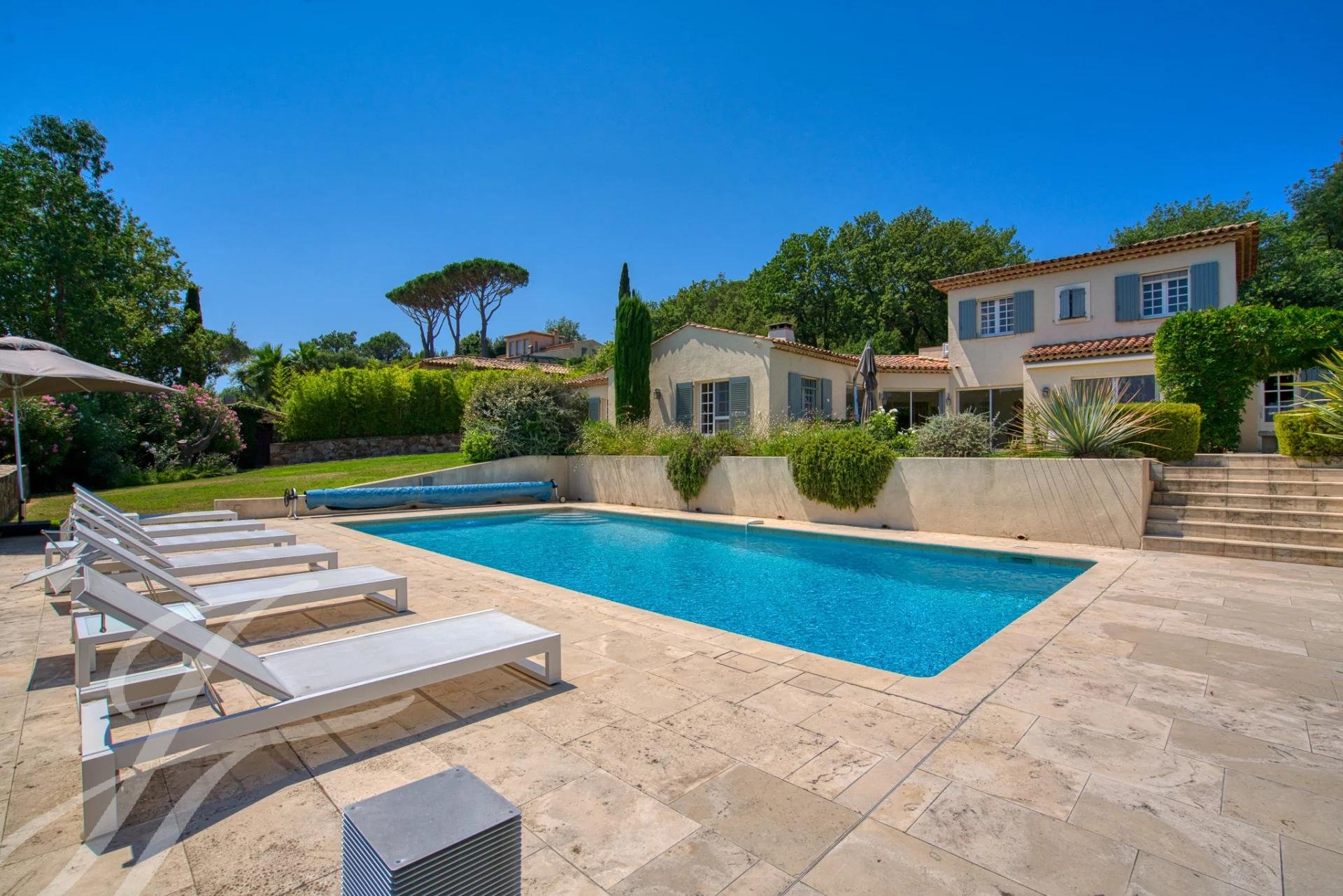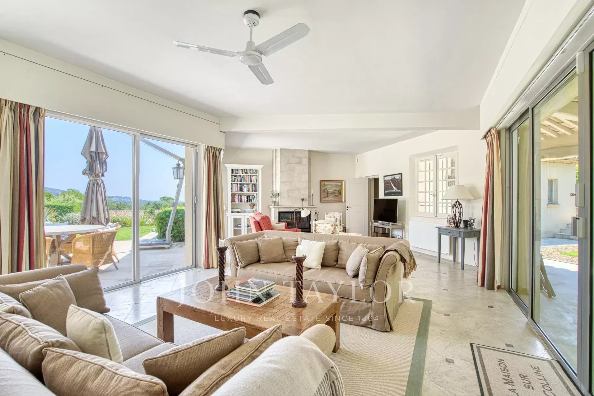 La villa principale propose un salon de près de 100 m², baignée de lumière grâce à sa double exposition, une salle à manger et une cuisine entièrement équipée ouverte sur une agréable terrasse ombragée. Vous disposerez de cinq chambres avec salles de bain ainsi qu’une suite parentale à l’étage, dotée d’un dressing et d’une terrasse tropézienne offrant une vue imprenable sur le golfe de Saint-Tropez.