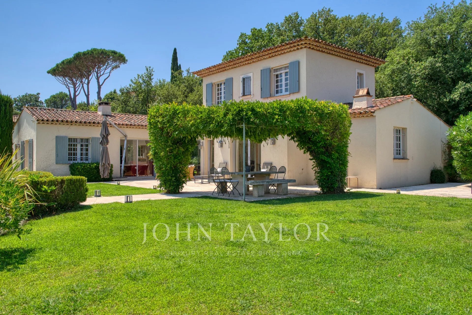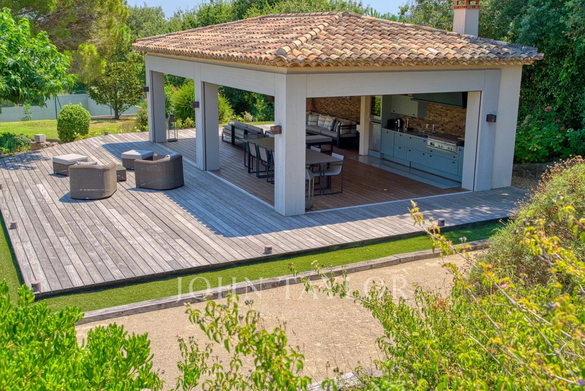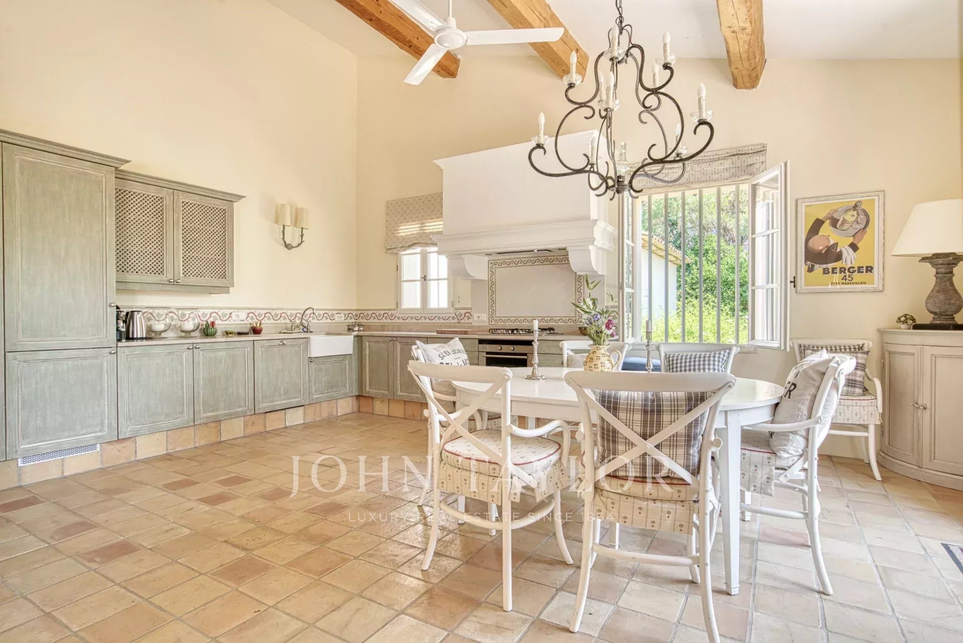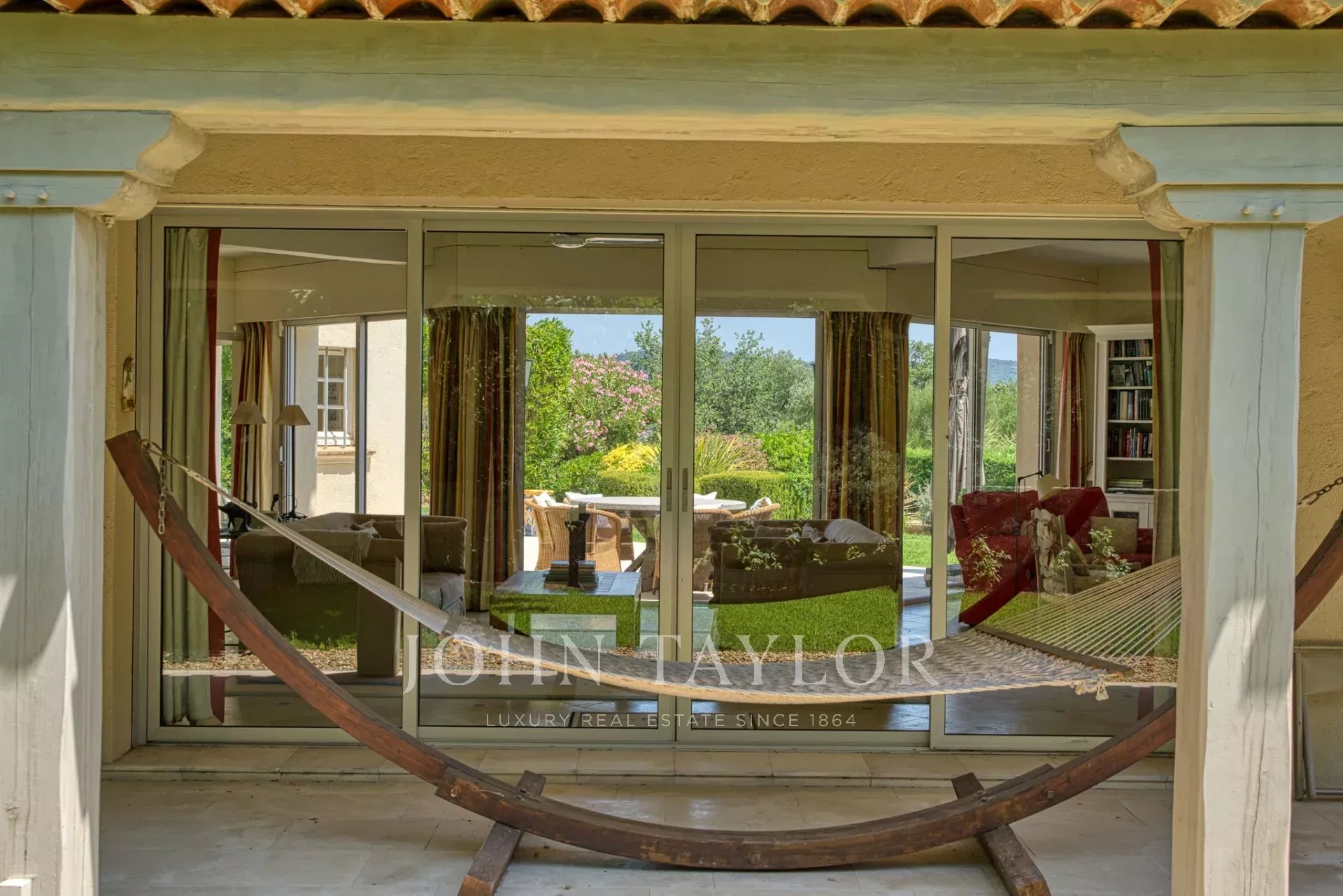 Idéalement située dans un petit domaine sécurisé, à proximité immédiate du village de Grimaud, elle séduit par ses prestations : court de tennis, terrain de pétanque, piscine chauffée, garage et un vaste espace extérieur aménagé en cuisine d’été avec salon.