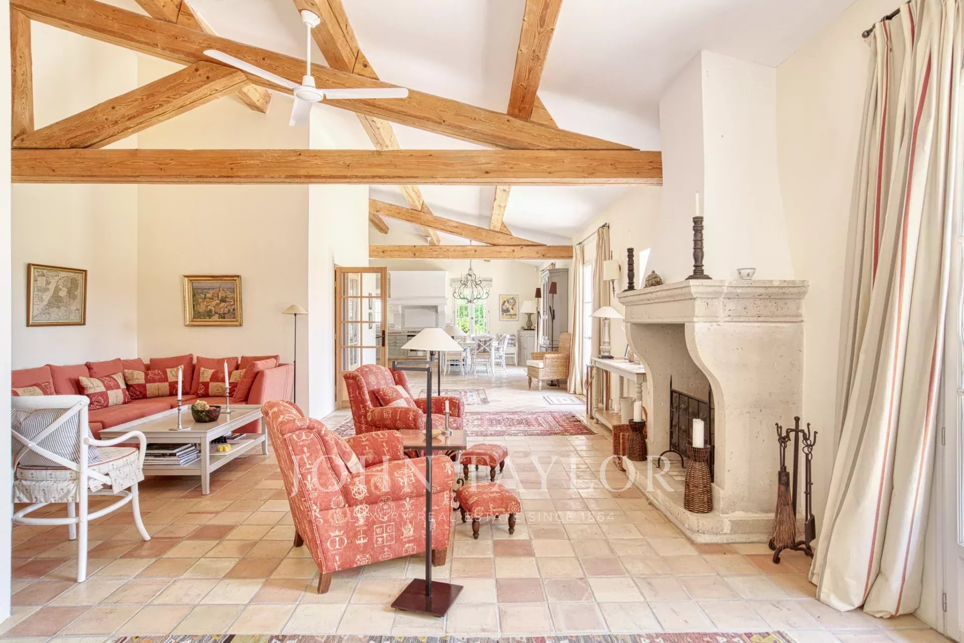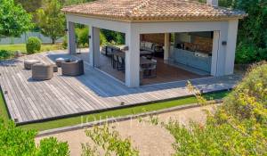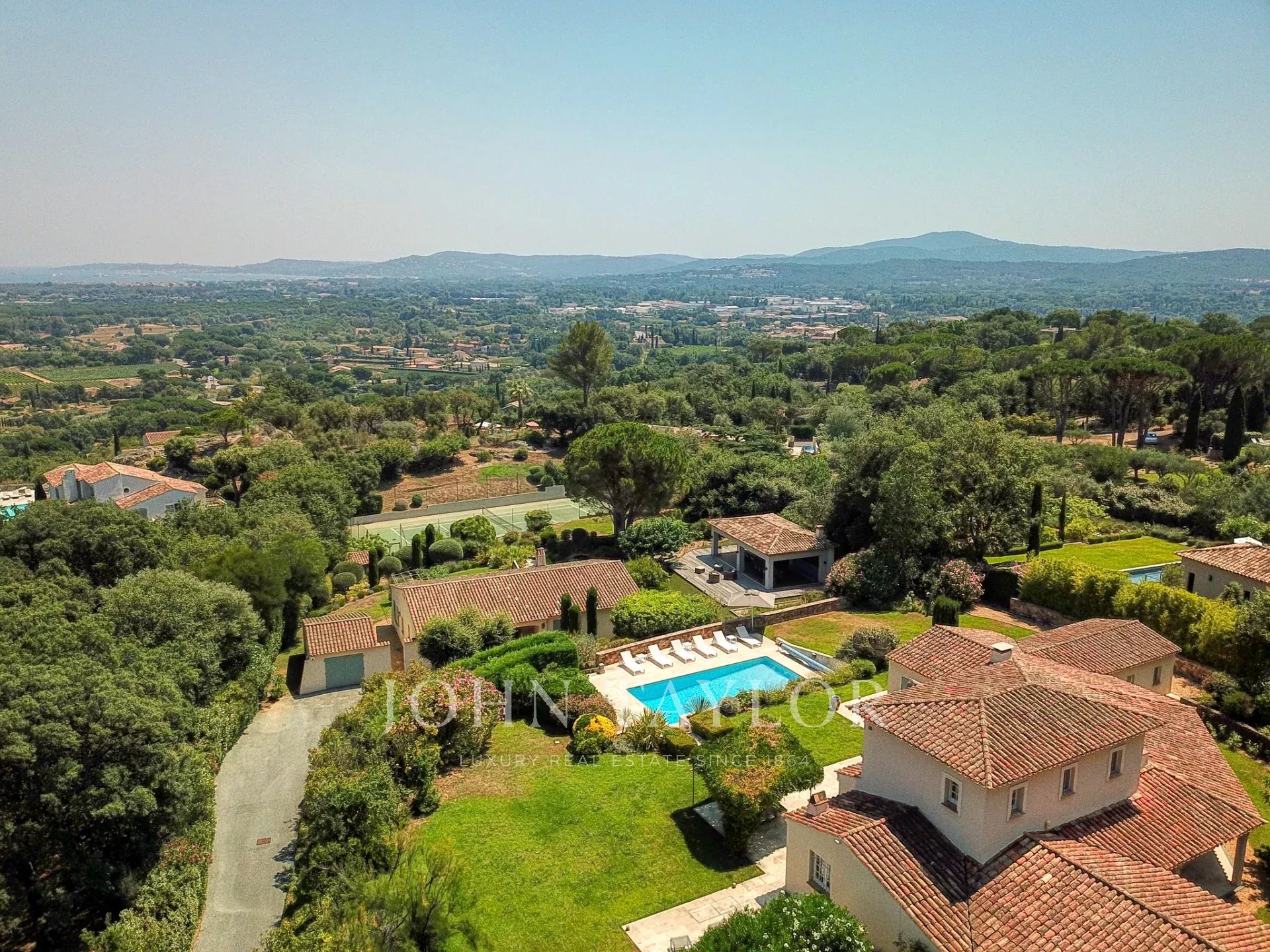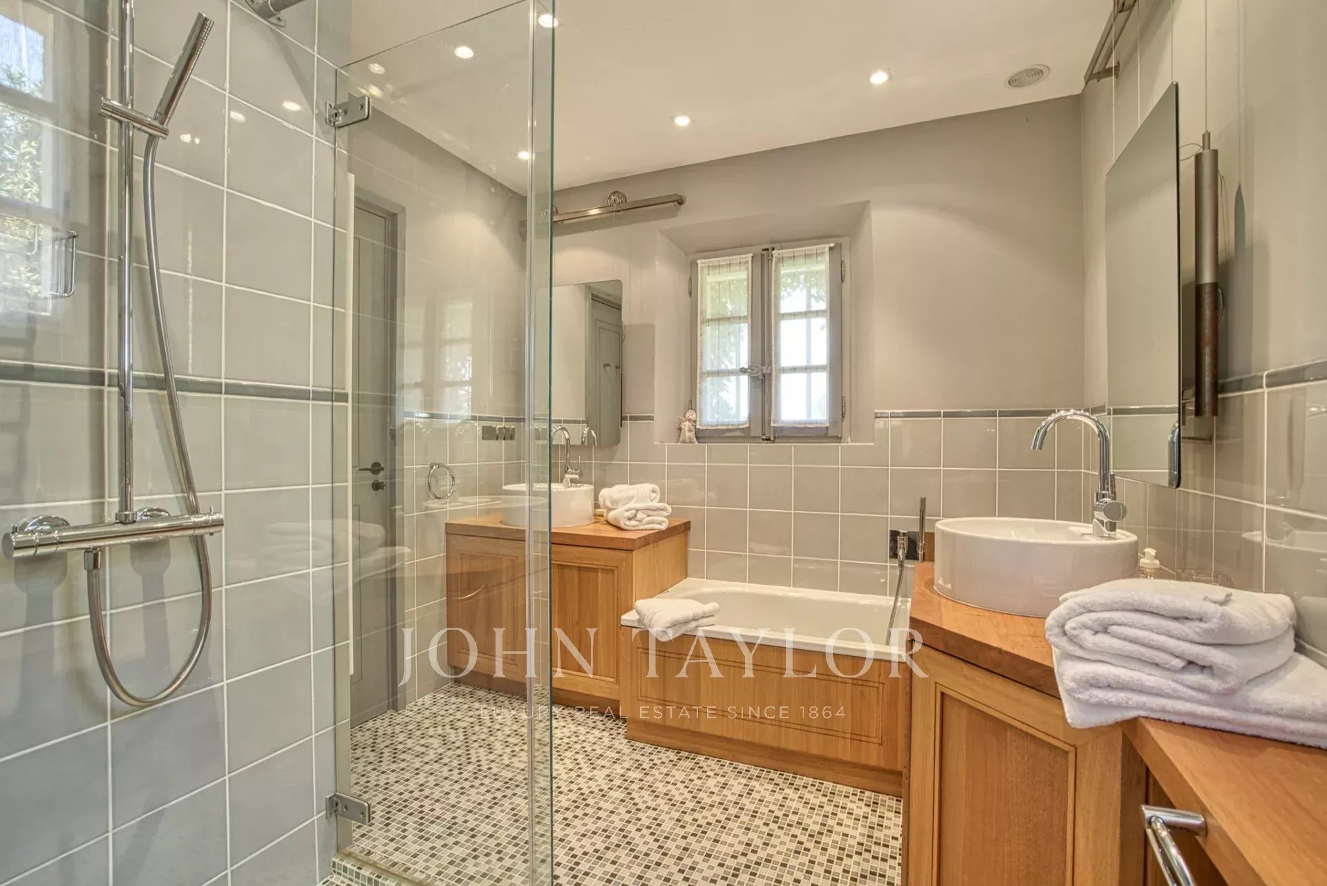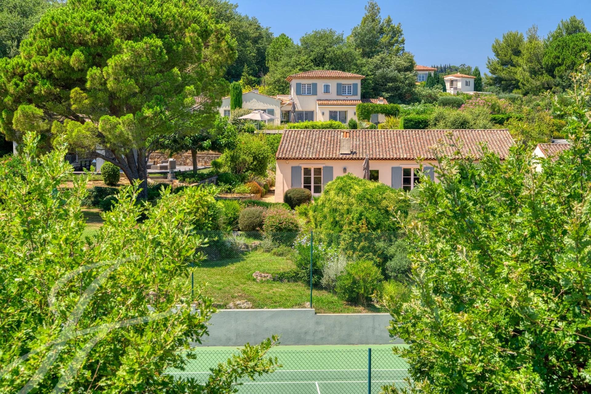 Idéalement située dans un petit domaine sécurisé, à proximité immédiate du village de Grimaud, elle séduit par ses prestations : court de tennis, terrain de pétanque, piscine chauffée, garage et un vaste espace extérieur aménagé en cuisine d’été avec salon.