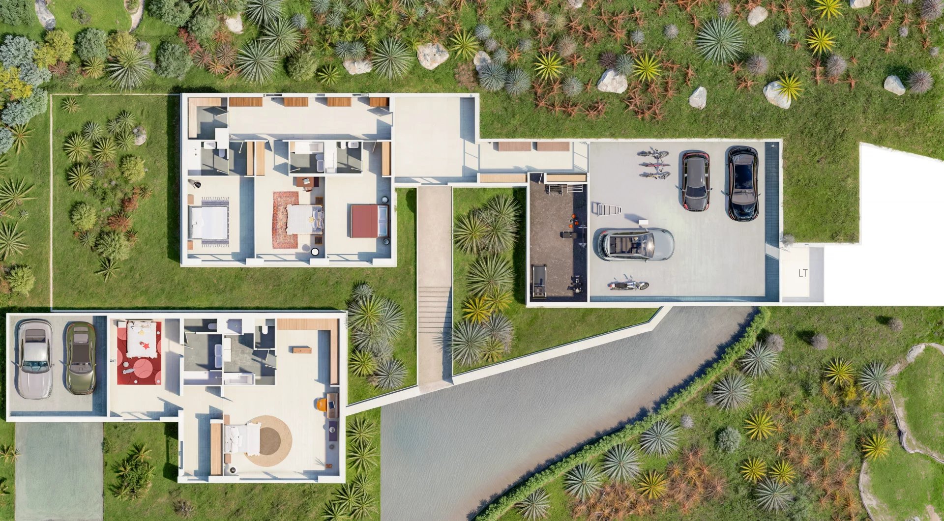 La villa principale s’ouvre sur un spacieux salon-séjour de 154 m² avec cuisine ouverte, baigné de lumière naturelle. Elle propose également une suite parentale de 44 m², plus trois chambres élégantes avec salles de bains attenantes, ainsi qu’une salle de sport de 30 m².