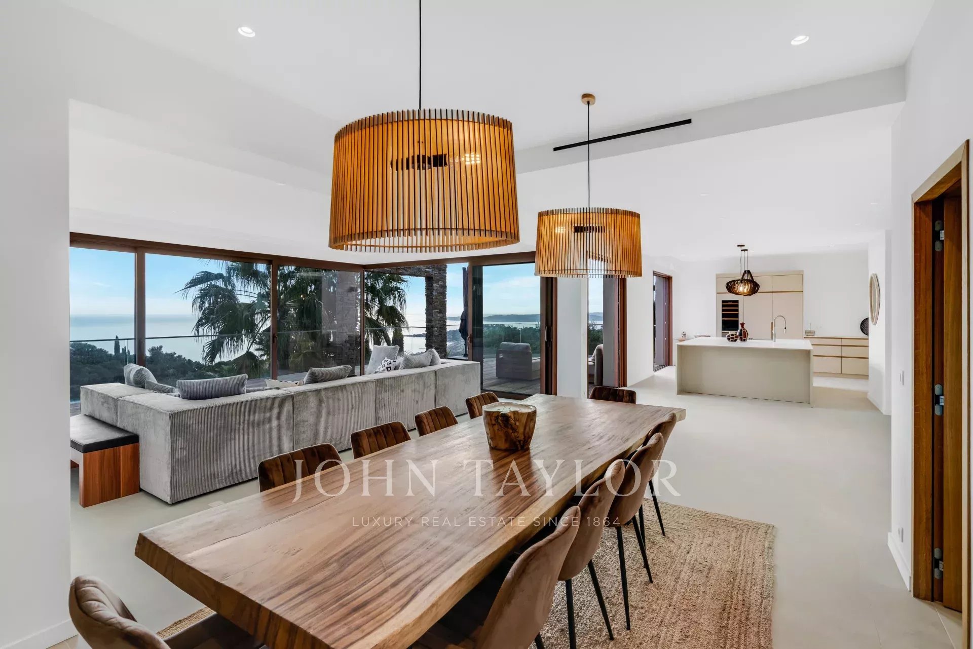 Le vaste salon-séjour s’ouvre sur de larges terrasses face à la mer, offrant une parfaite continuité entre intérieur et extérieur.
