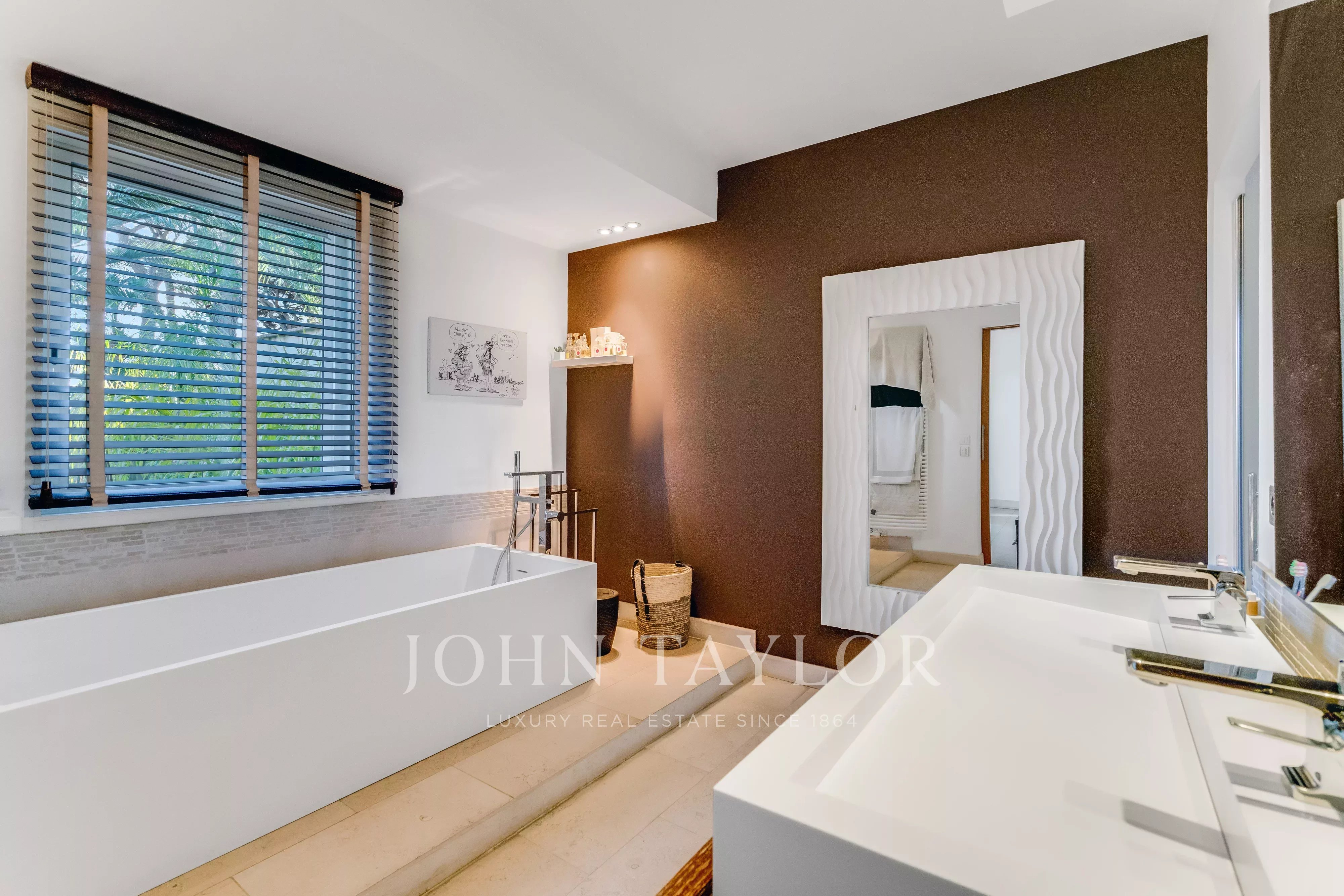 La partie nuit se compose d’une chambre de maître de 45 m², de cinq chambres supplémentaires et de quatre salles de bains, un bureau, un salon/bibliothèque.