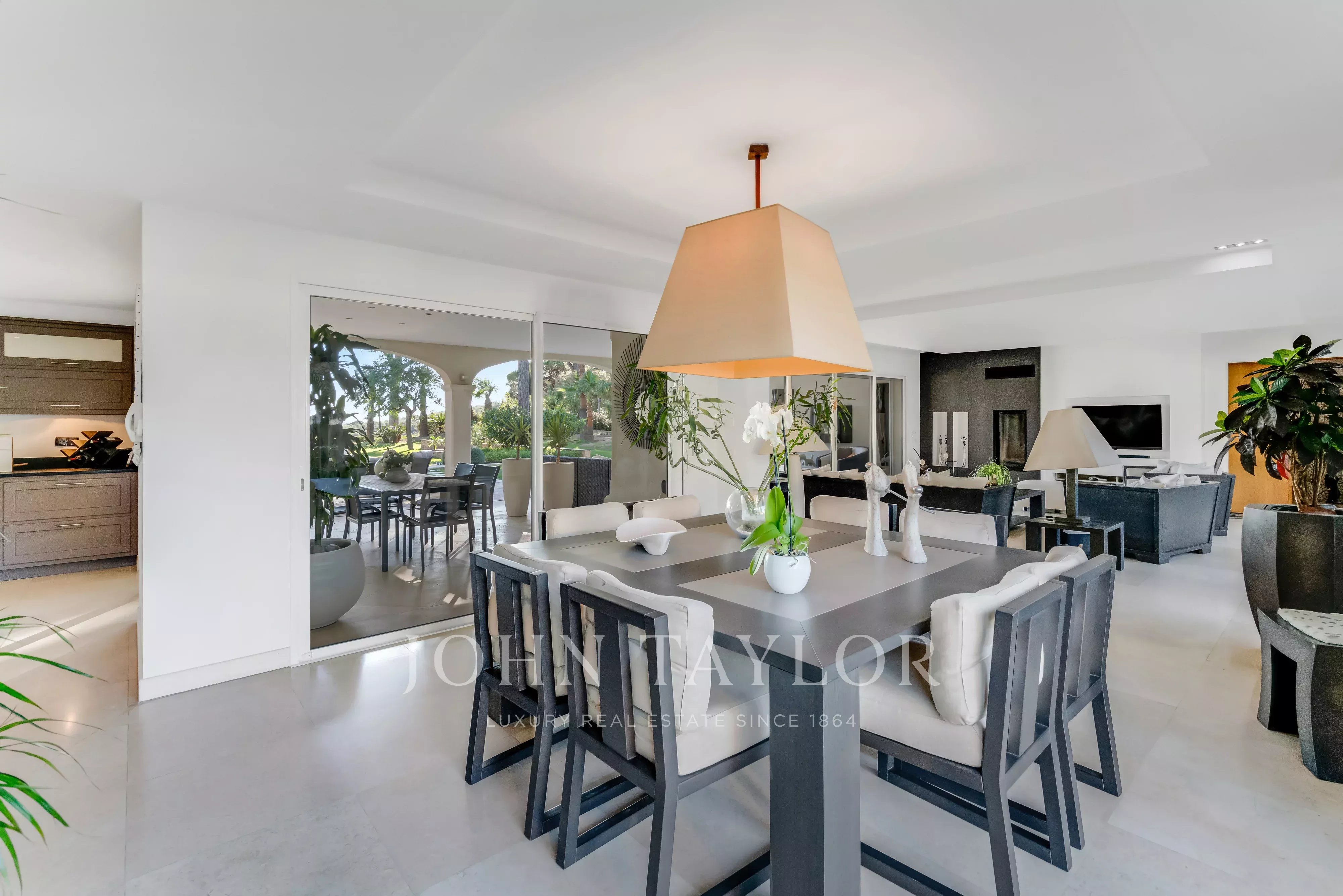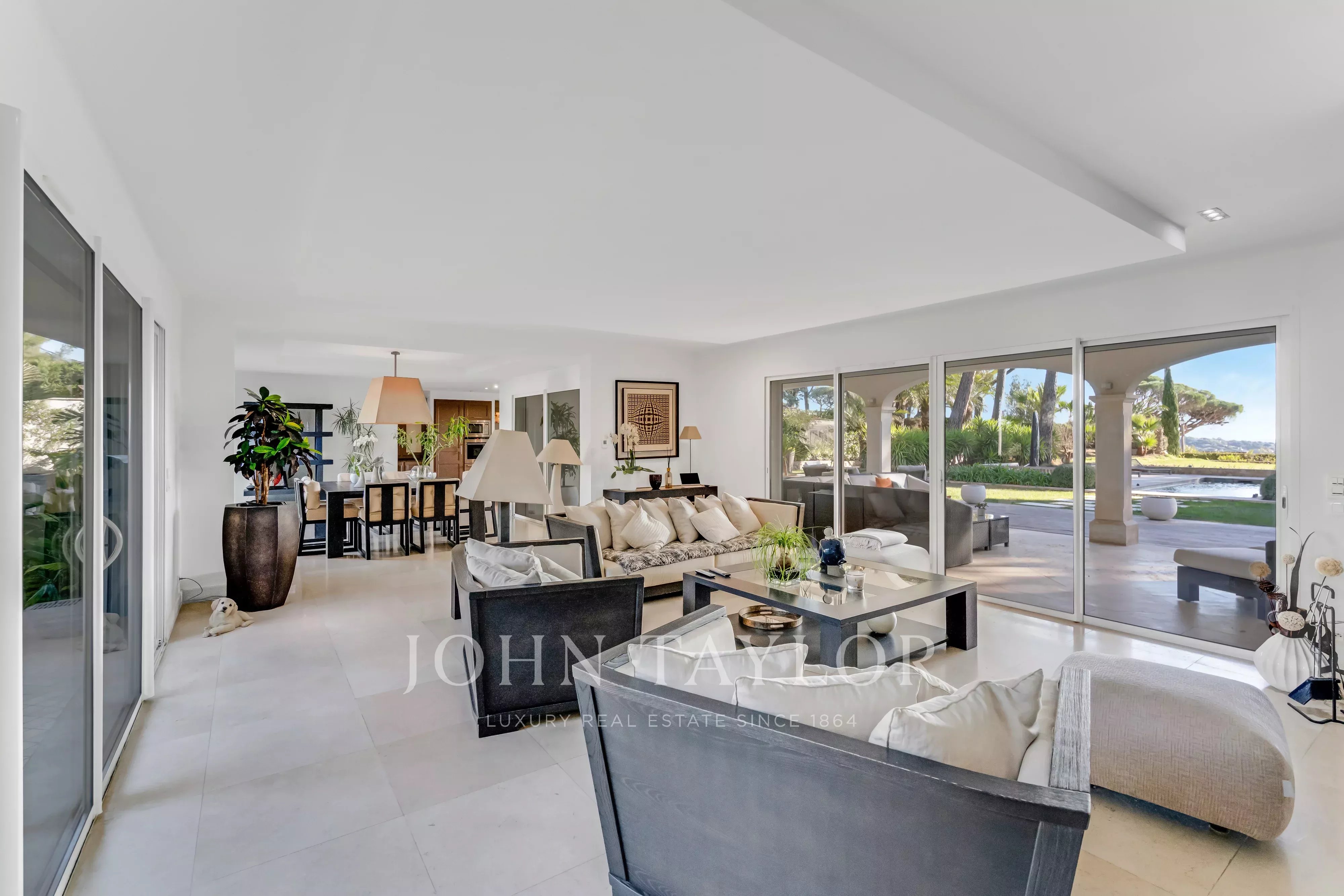Dès l’entrée, les espaces de réception dévoilent une vaste pièce de vie d’environ 60 m², baignée de lumière grâce à sa double exposition et largement ouverte sur les extérieurs. Le salon-séjour prolonge naturellement ses perspectives vers une terrasse couverte et la piscine, offrant une continuité élégante entre intérieur et extérieur, idéale pour recevoir face à la mer.