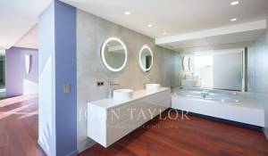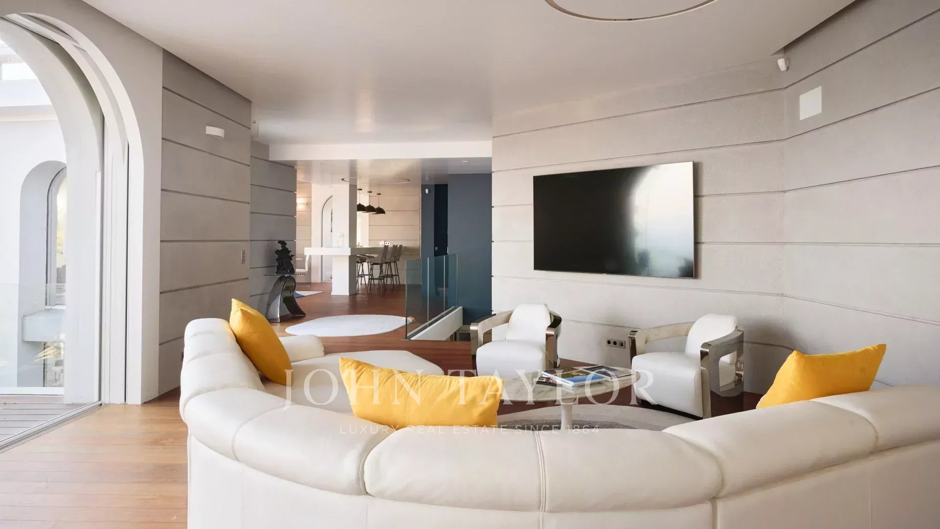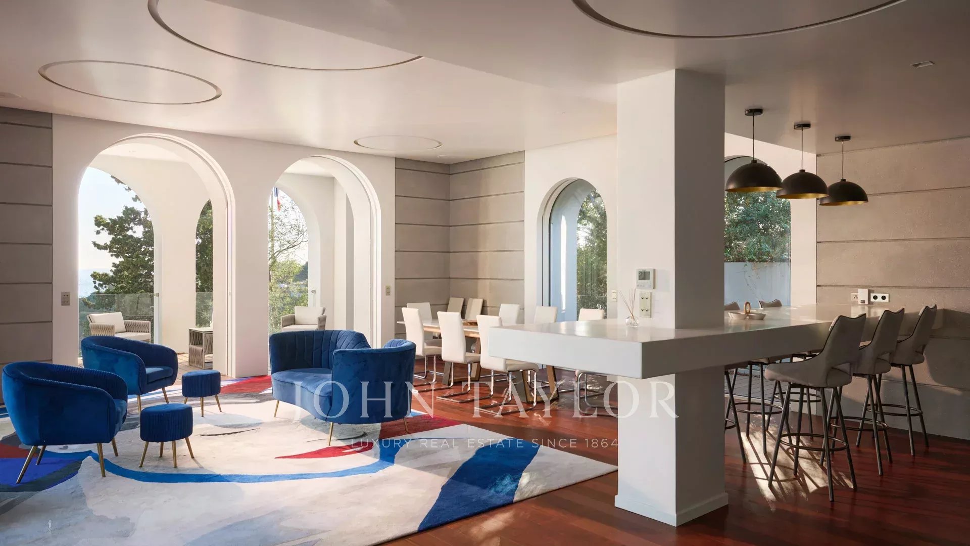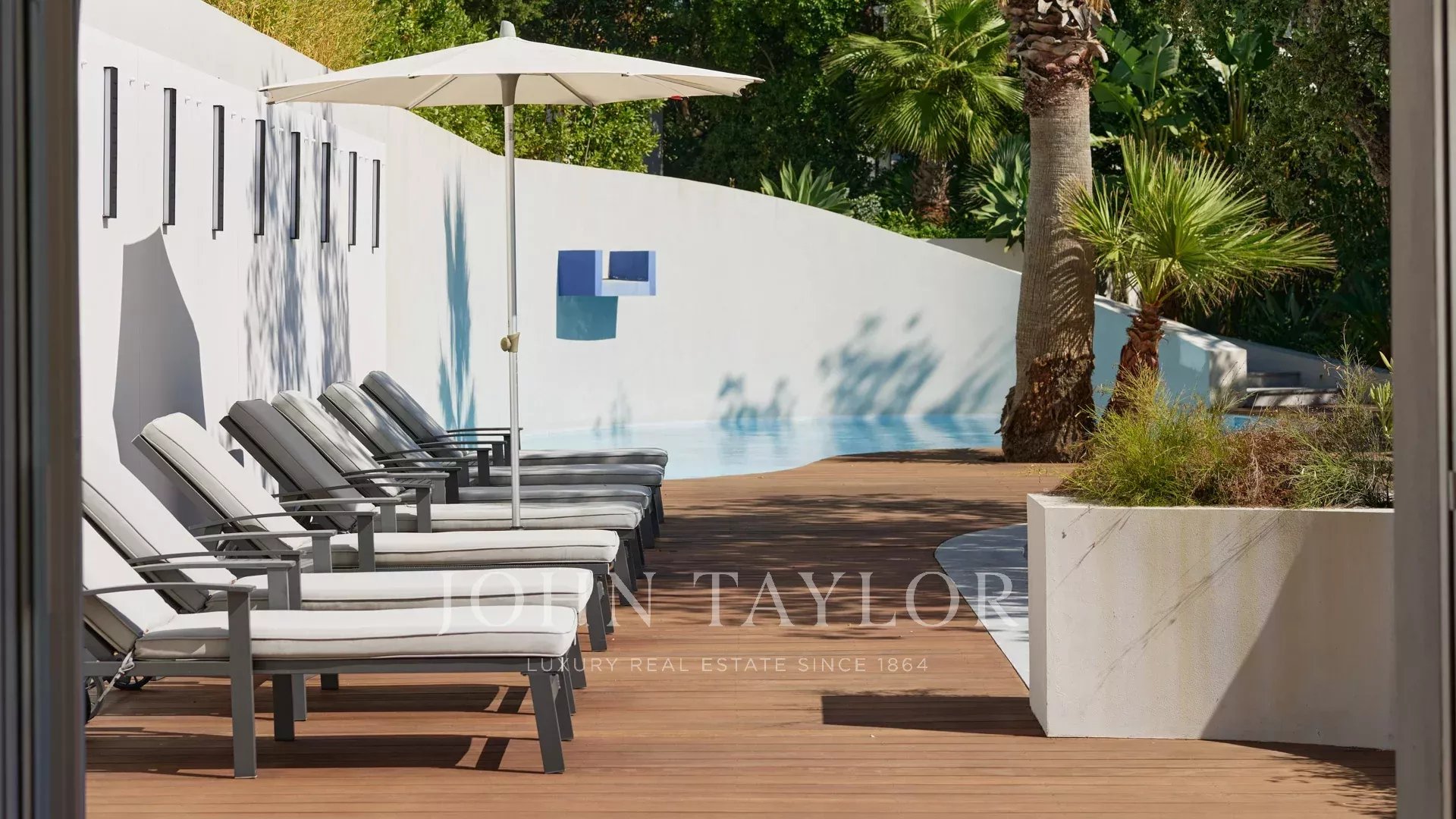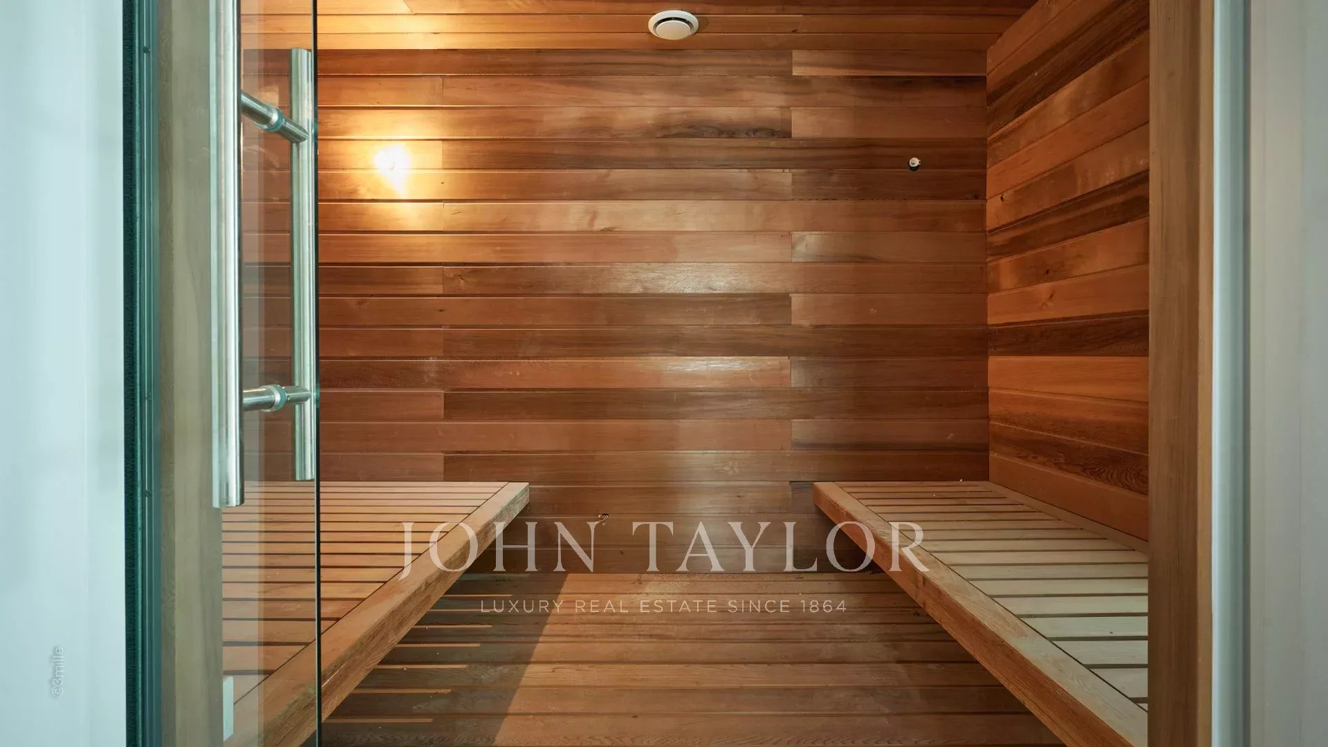 La propriété offre de nombreuses places de parking et des prestations de très haute qualité, avec des matériaux raffinés, un spa, un sauna, un toit-terrasse aménagé et une piscine de 84 m², entourée de vastes plages au même niveau que les pièces à vivre.